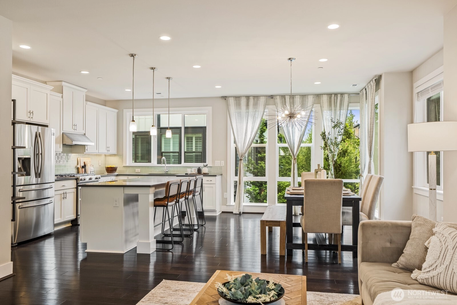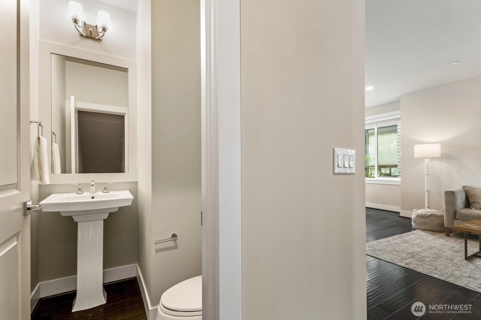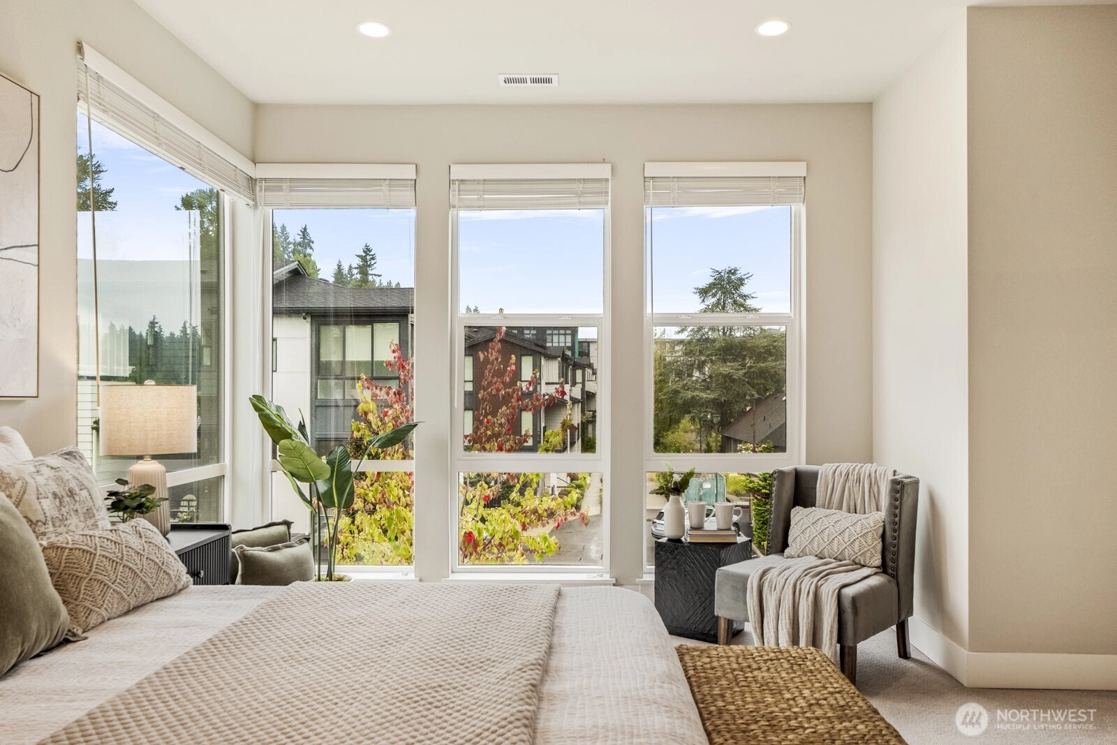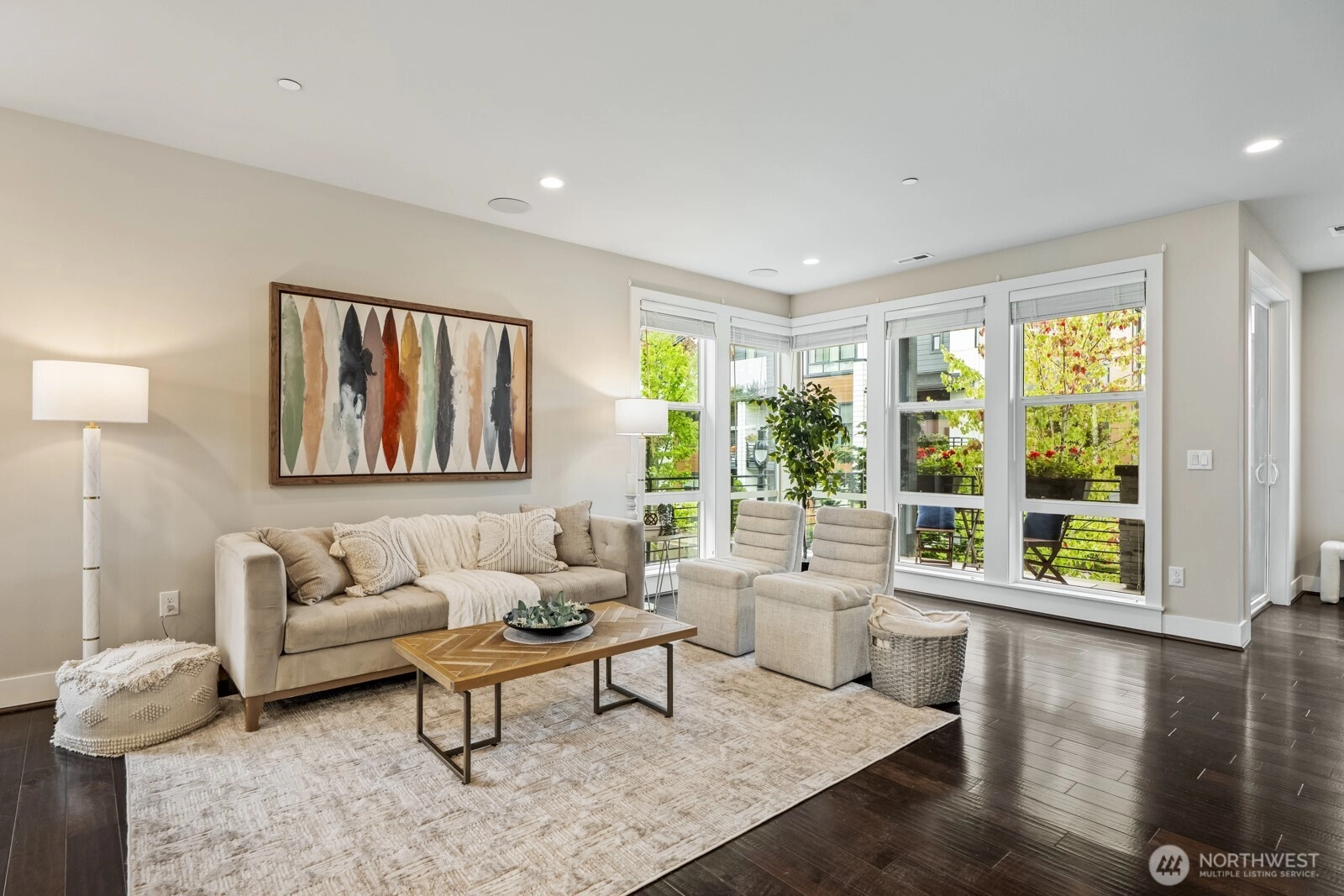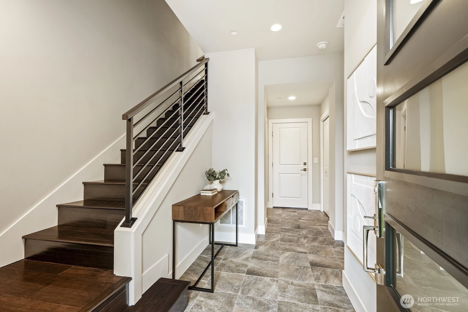 This stunning corner townhome features soaring 9’ ceilings & floor-to-ceiling windows that flood the open-concept space w/ natural light. $30K in upgrades, incl a gourmet kitchen w/ premium appliances, quartz counters, central AC & a sleek tile-wrapped gas fireplace. Desirable main-floor ensuite, spa-like primary suite w/ spacious dual shower & walk in closet AND a private covered balcony. Steps away from dining, parks & trails, incl the Burke Gilman plus a 2-car garage. Uniquely positioned corner unit is offset from other homes providing privacy & unobstructed views. Nestled in the heart of downtown Bothell in the desirable Northshore School District w/ convenient access to Bellevue & Seattle, it is truly a move-in-ready urban sanctuary!