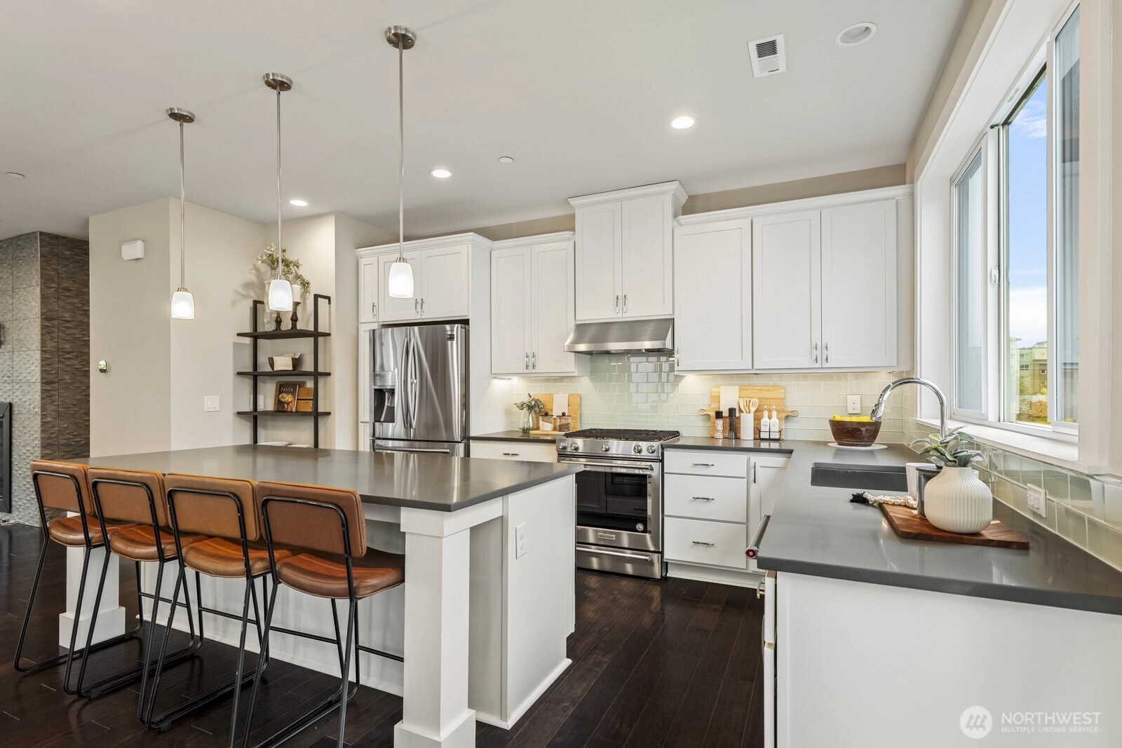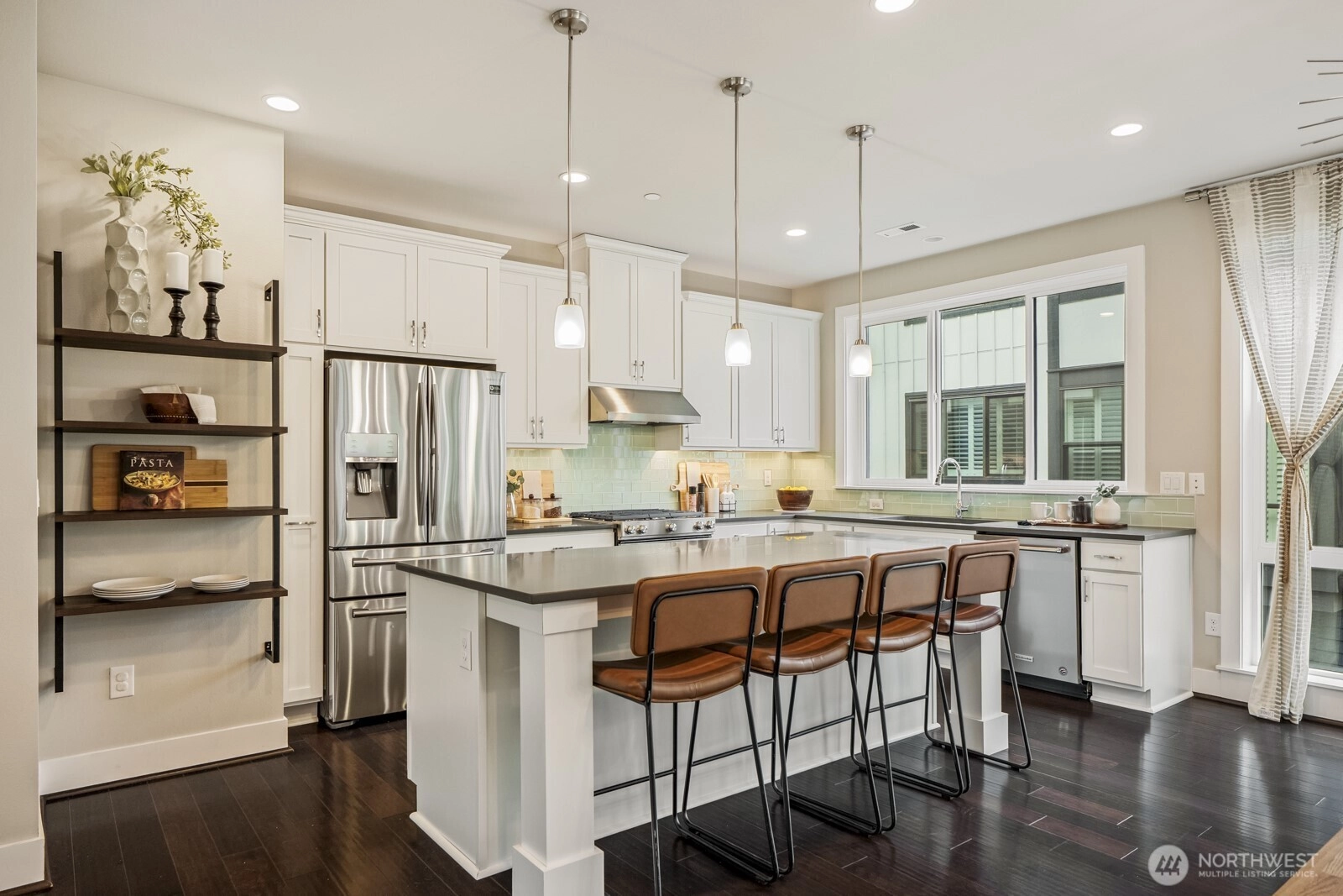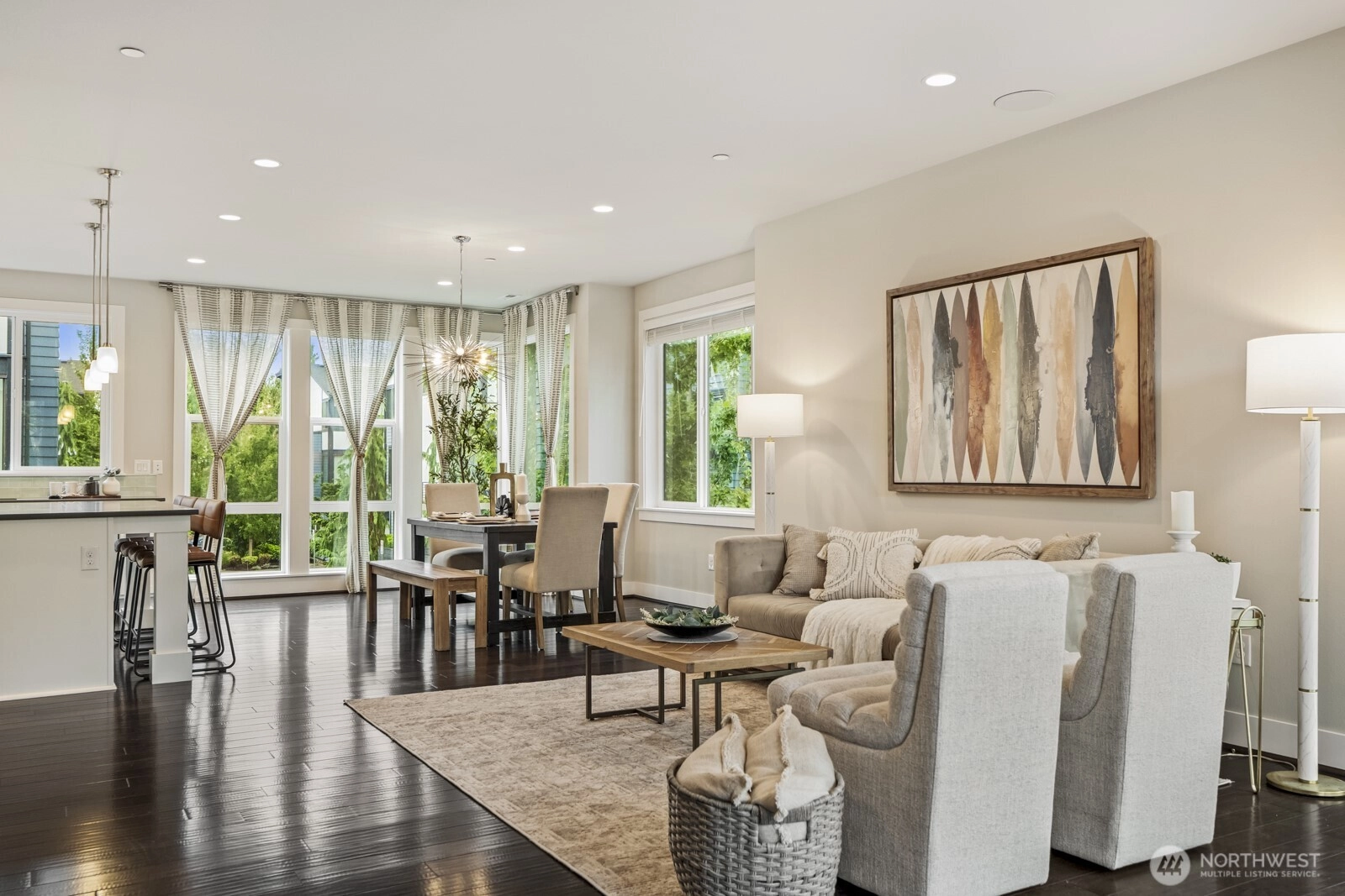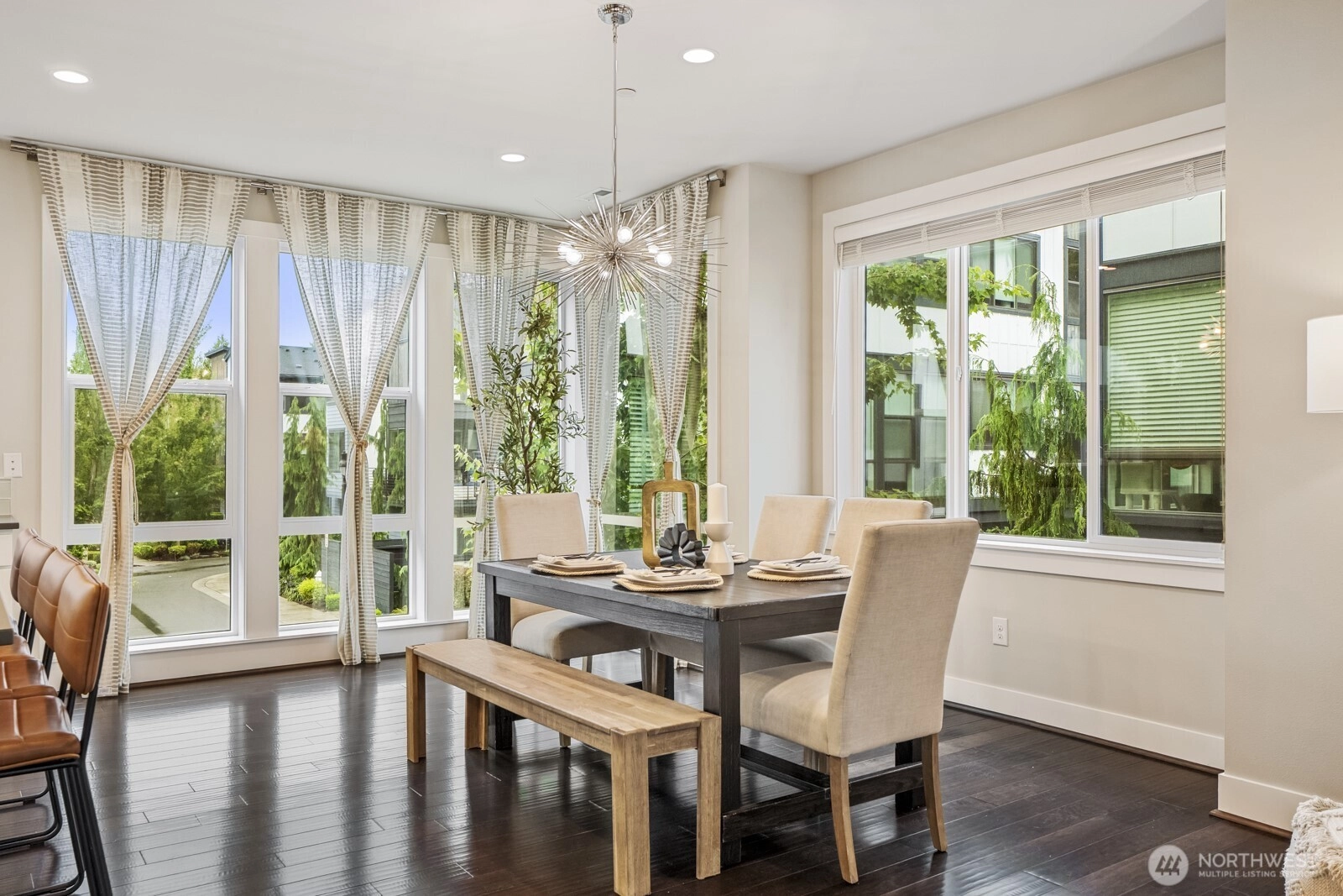 This stunning corner townhome features soaring 9’ ceilings & floor-to-ceiling windows that flood the open-concept space w/ natural light. $30K in upgrades, incl a gourmet kitchen w/ premium appliances, quartz counters, central AC & a sleek tile-wrapped gas fireplace. Desirable main-floor ensuite, spa-like primary suite w/ spacious dual shower & walk in closet AND a private covered balcony. Steps away from dining, parks & trails, incl the Burke Gilman plus a 2-car garage. Uniquely positioned corner unit is offset from other homes providing privacy & unobstructed views. Nestled in the heart of downtown Bothell in the desirable Northshore School District w/ convenient access to Bellevue & Seattle, it is truly a move-in-ready urban sanctuary!