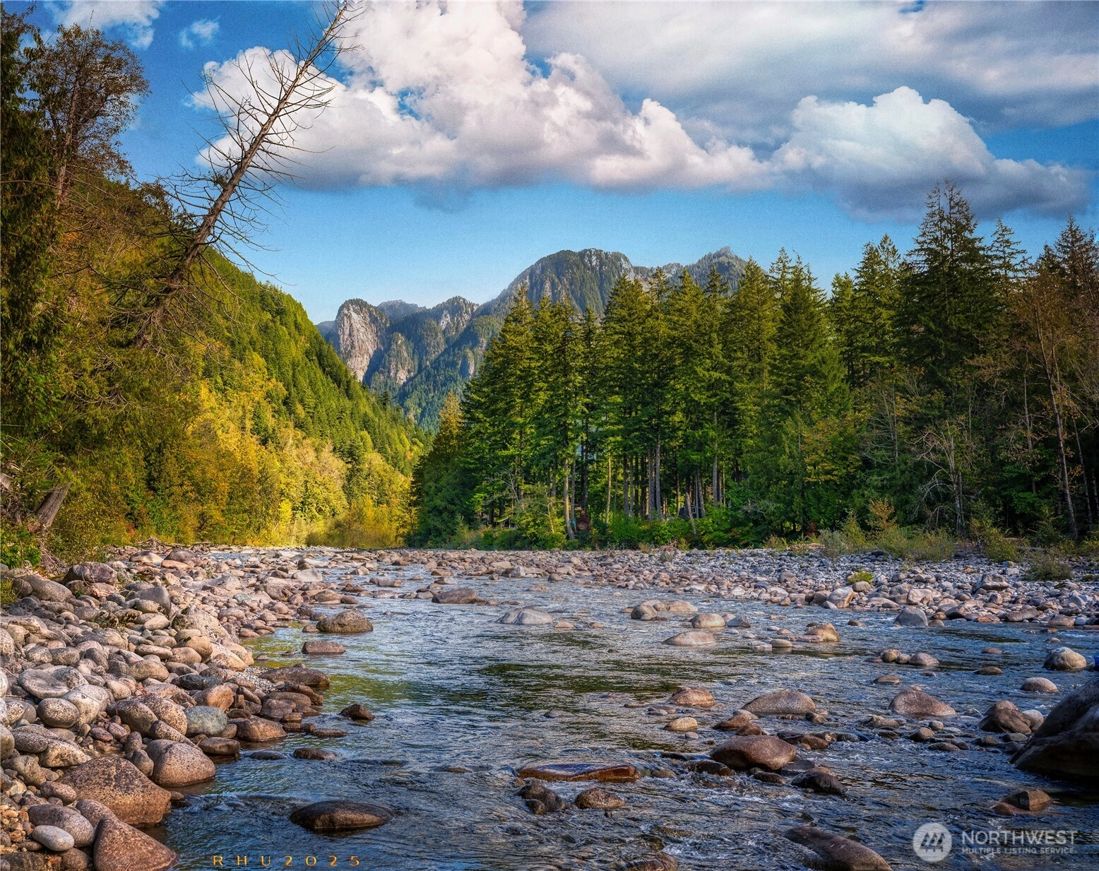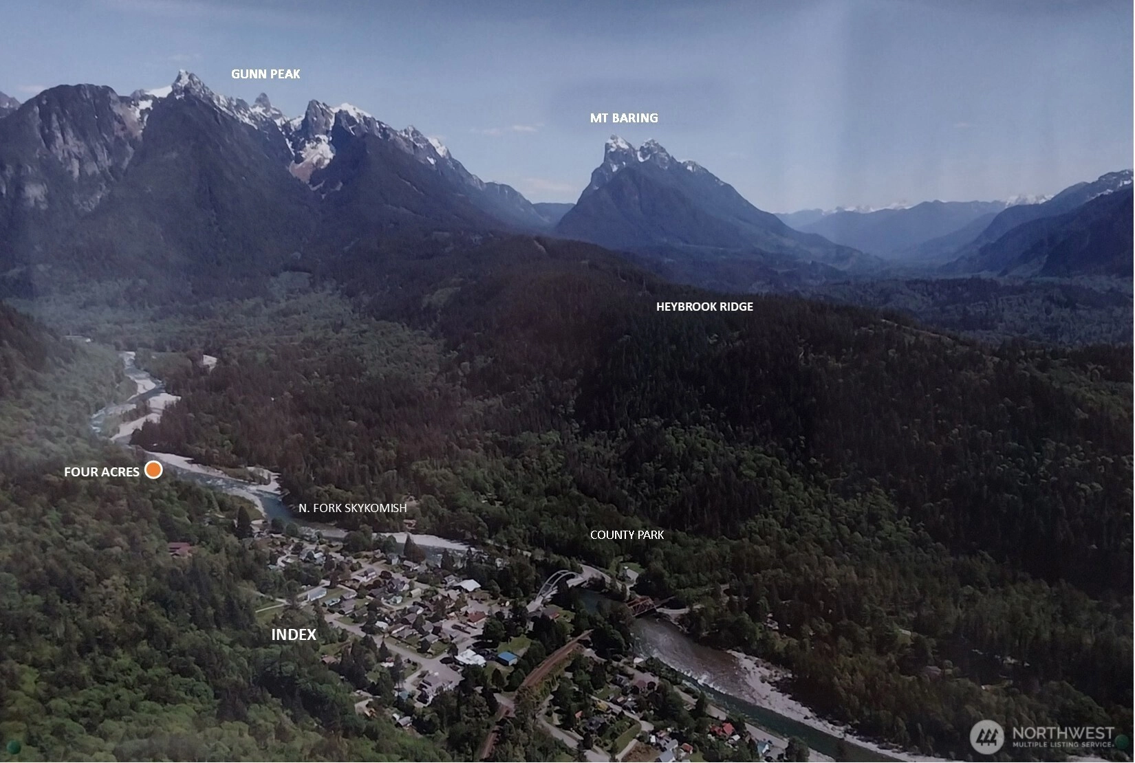 From the river to waterfalls far above: 4+ acres in Index with 100 feet of park-like low-bank riverfront on the N. Fork Skykomish River with the world’s best view of Mount Index. 4bdrm septic approved. Includes a 23x25-foot shed (the cantina), with power on the paved road. A shallow well would tap into endless water. The grassy meadow is starting point for kayaking, rafting, fishing or just splashing about. A large swimming area is nearby. Paths wind through a fir and cedar forest. Access road travels a quarter mile up into the land. On sunny side of the river, north side facing south. Half mile to town center. 30 minutes to Vail/Stevens Pass ski and bike resort. 1 hour west to Seattle, 1 hour east to Leavenworth Bavarian village.