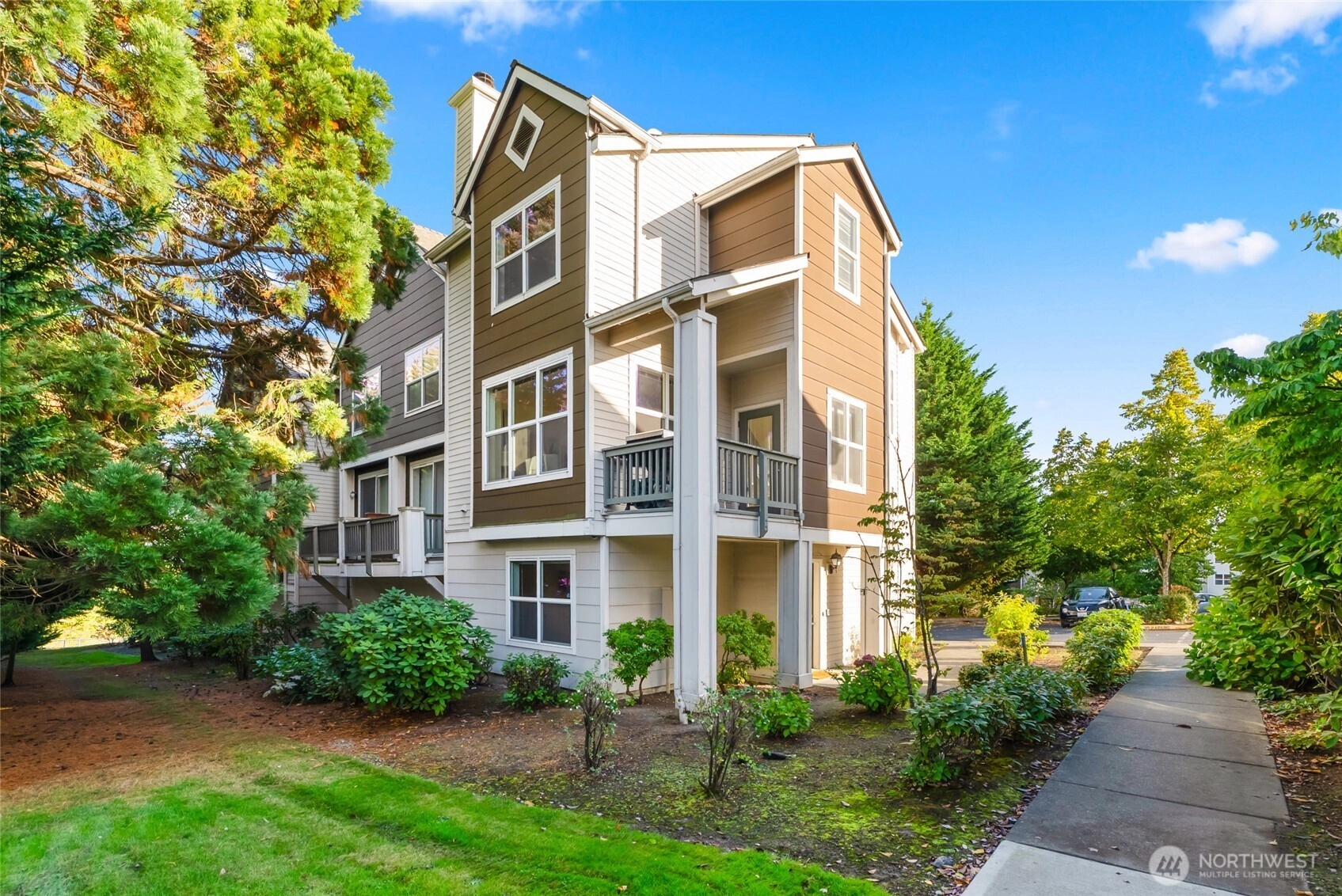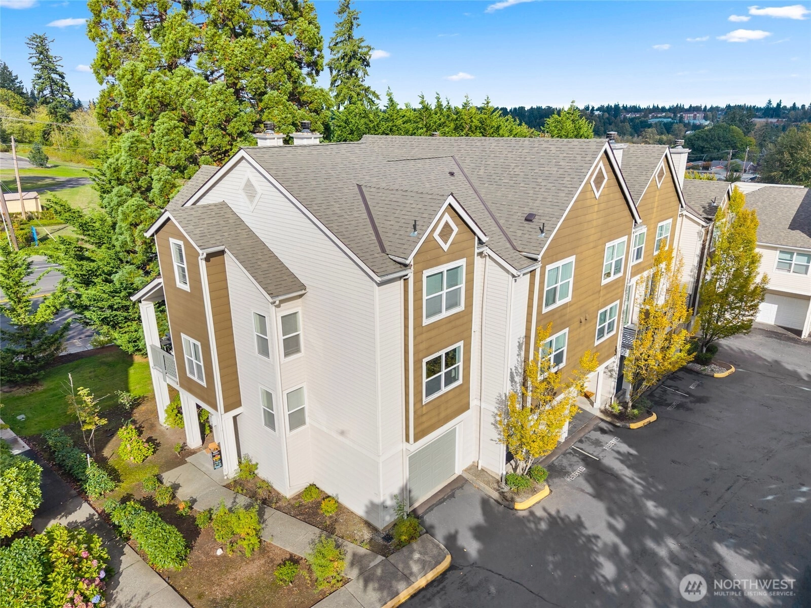 Welcome to the most desirable layout in the sought-after Wildwood community! This 3-bedroom end unit offers the perfect combination of space and convenience—just minutes from freeways, park & ride, shopping, and dining. The open floorplan features a spacious kitchen with island, two large bedrooms with custom closets upstairs, and a private guest suite or office with full bath on the lower level. Enjoy a private balcony, attached garage, and a reserved parking space right at your front door.