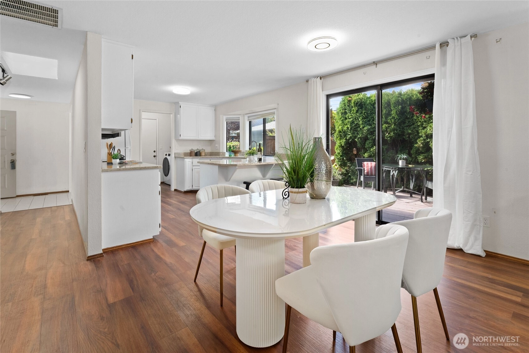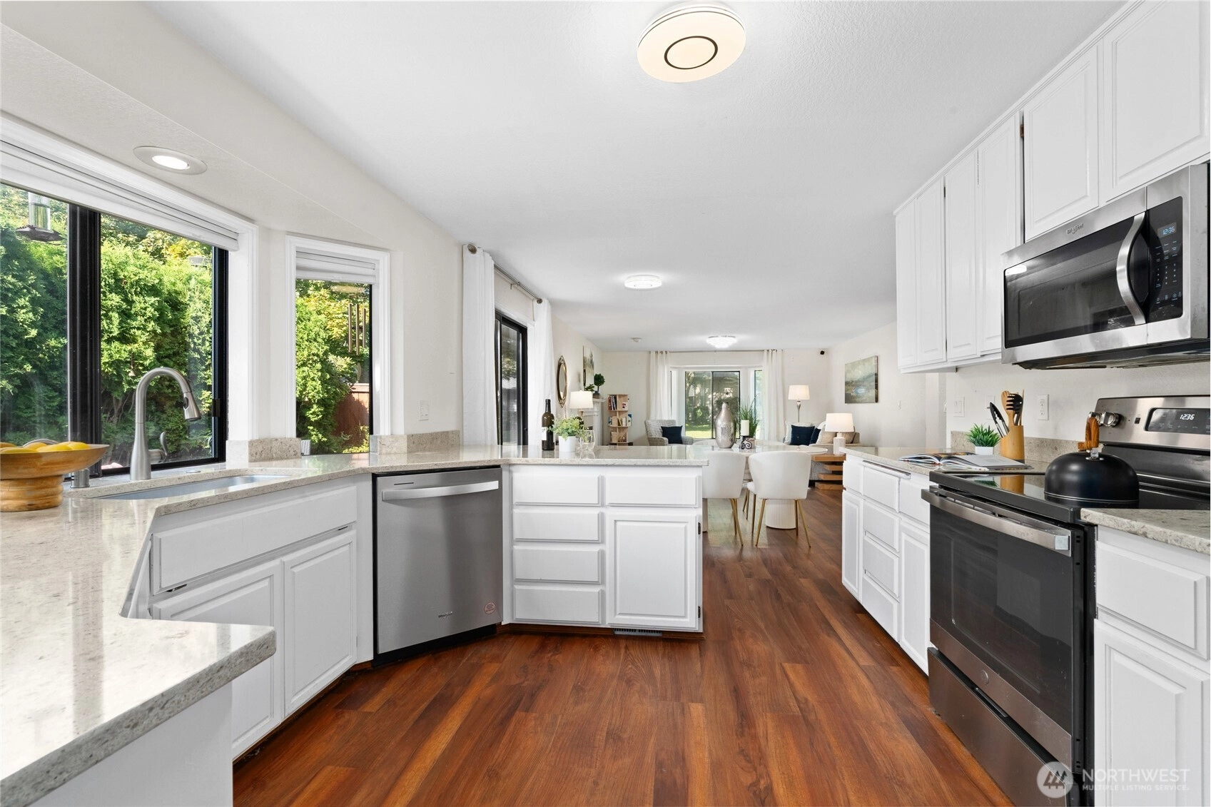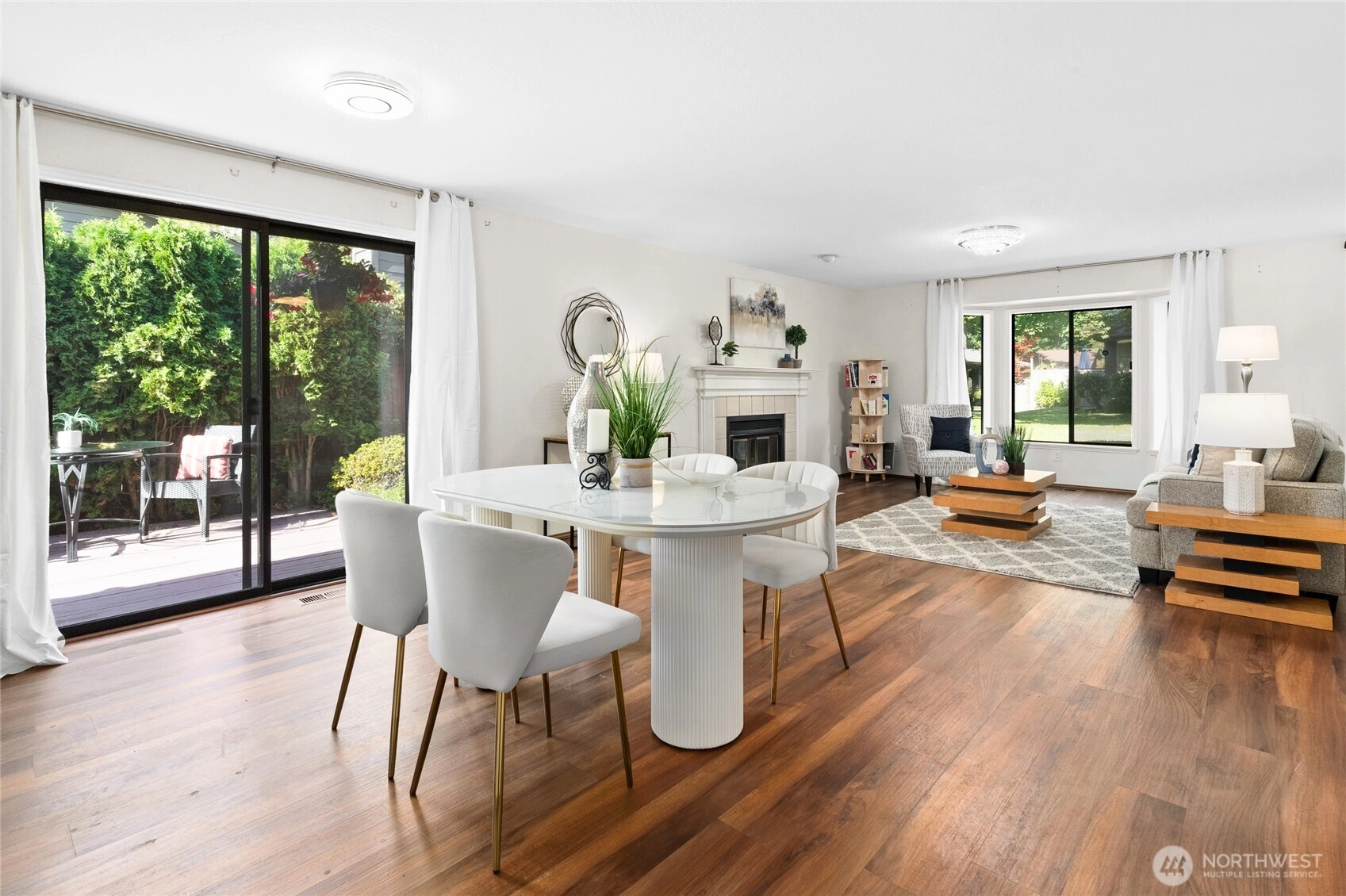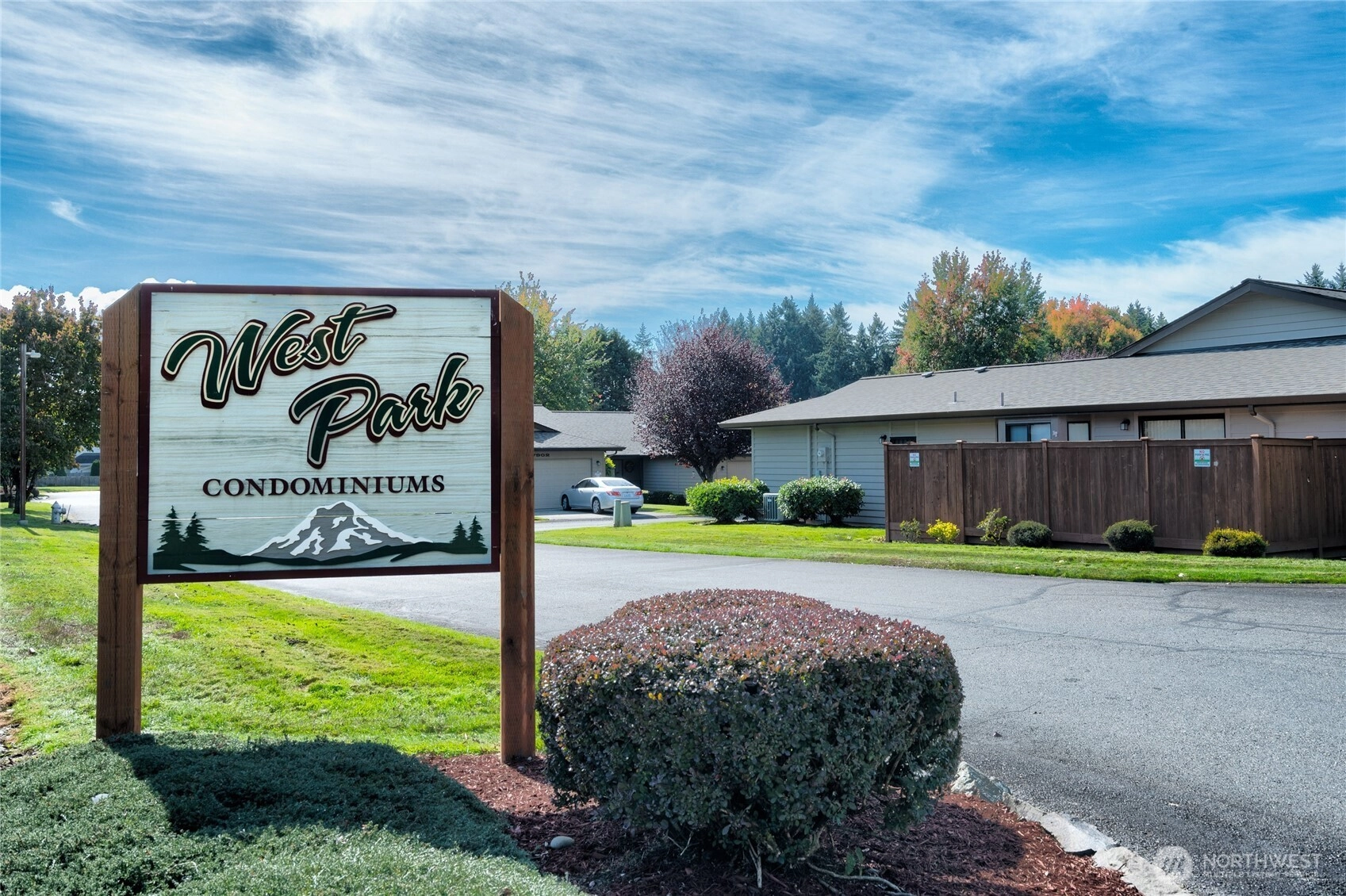 This beautifully remodeled 2-bedroom 2 bath condo in West Park Condos @ University Place is open & bright on one level! Vinyl plank hardwood floors throughout. Living Room w/ bay windows & cozy wood burning fireplace. Expansive deck off Dining is a Gardner's paradise. Kitchen has beautiful stone counters & large eating bar, painted wood cabinets & SS appliances. Primary w/ bay windows, walk-in closet & ensuite bath w/ stone counters. Large 2nd Bedroom perfect for queen bed or ideal home office is adjacent to hall bath w/ tiled tub/shower. Laundry Room w/ washer/dryer & storage. Double car garage completes this condo that feels like a single-family home. Park-like common area maintained by HOA. Heat pump provides forced air heating /cooling!