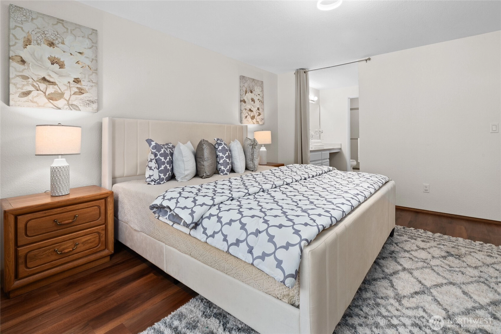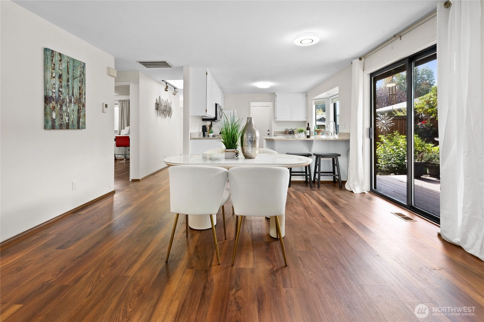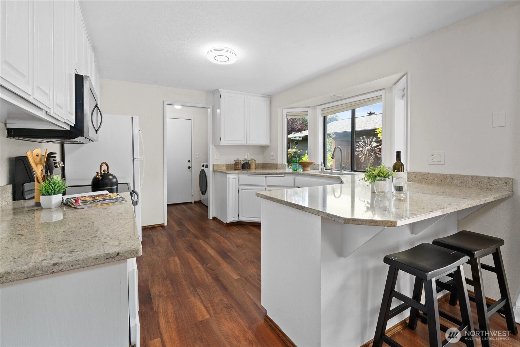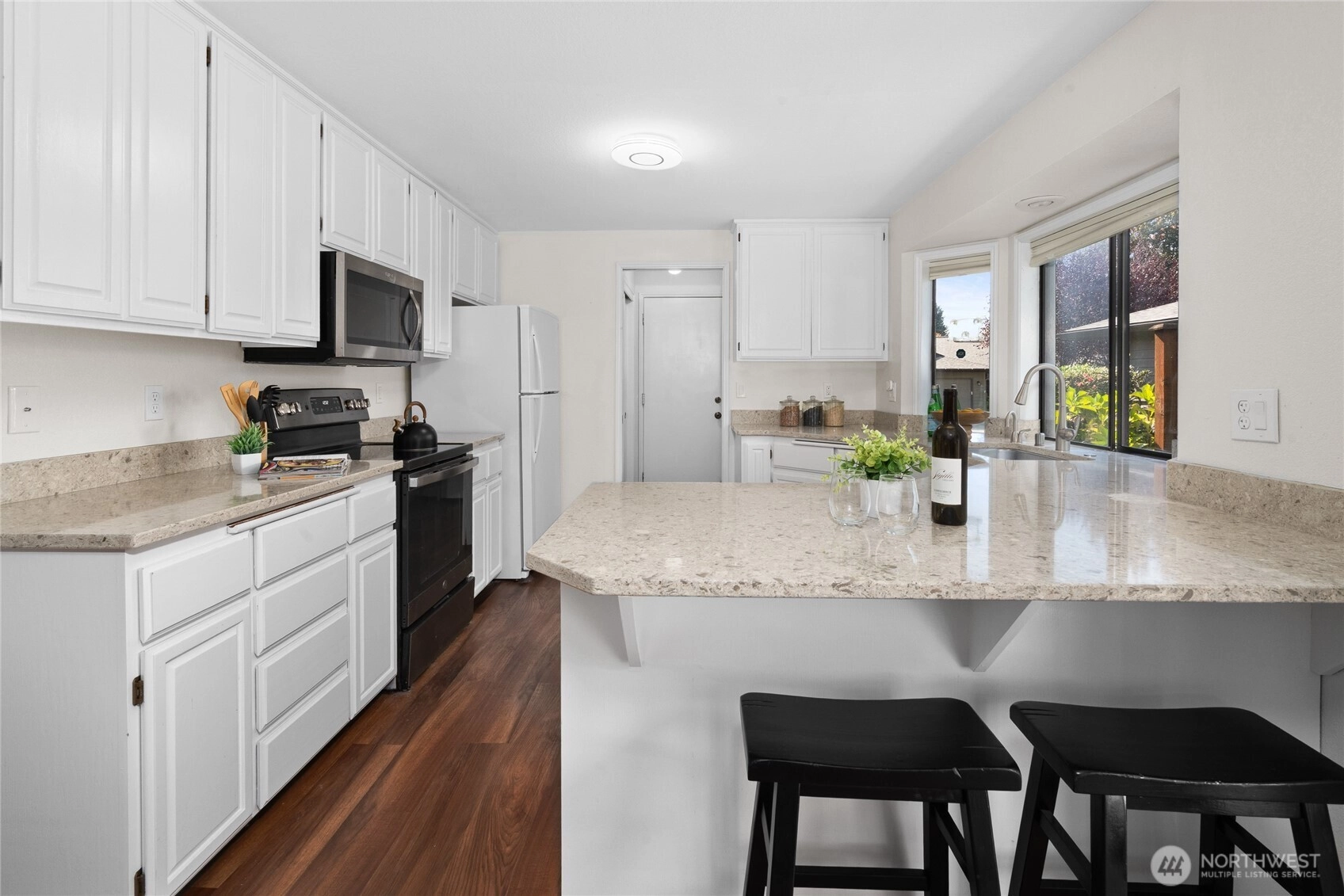 This beautifully remodeled 2-bedroom 2 bath condo in West Park Condos @ University Place is open & bright on one level! Vinyl plank hardwood floors throughout. Living Room w/ bay windows & cozy wood burning fireplace. Expansive deck off Dining is a Gardner's paradise. Kitchen has beautiful stone counters & large eating bar, painted wood cabinets & SS appliances. Primary w/ bay windows, walk-in closet & ensuite bath w/ stone counters. Large 2nd Bedroom perfect for queen bed or ideal home office is adjacent to hall bath w/ tiled tub/shower. Laundry Room w/ washer/dryer & storage. Double car garage completes this condo that feels like a single-family home. Park-like common area maintained by HOA. Heat pump provides forced air heating /cooling!