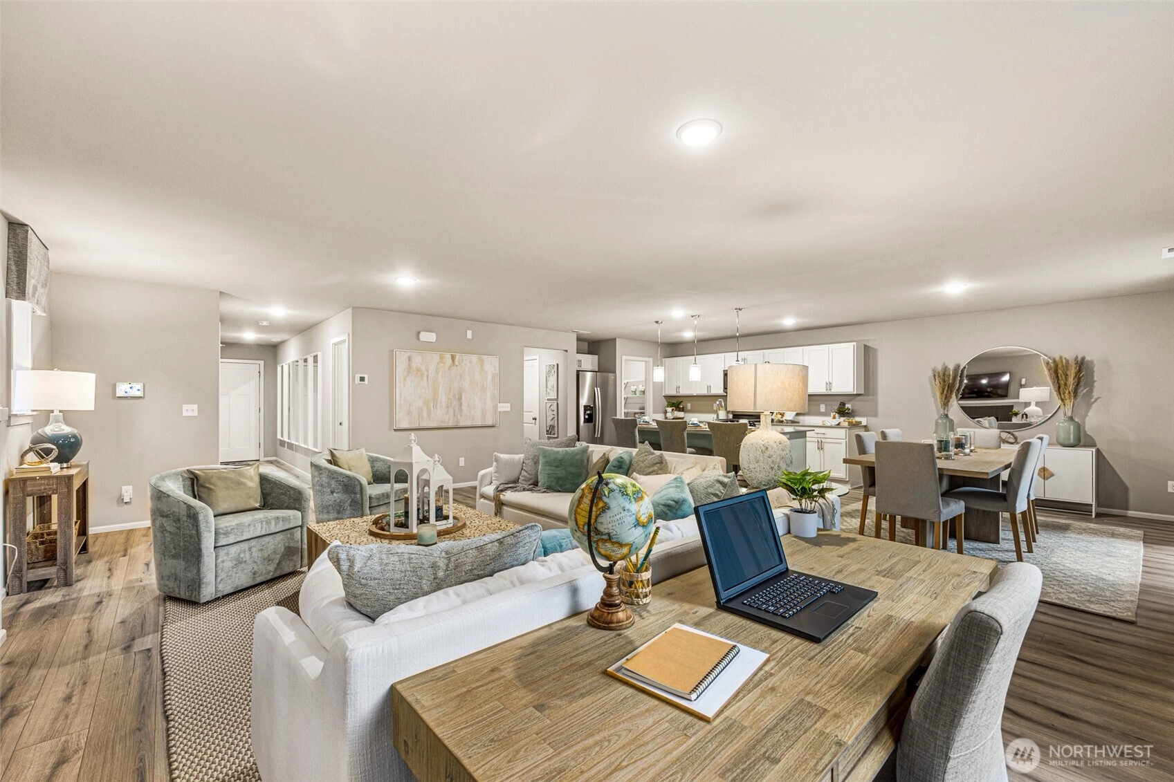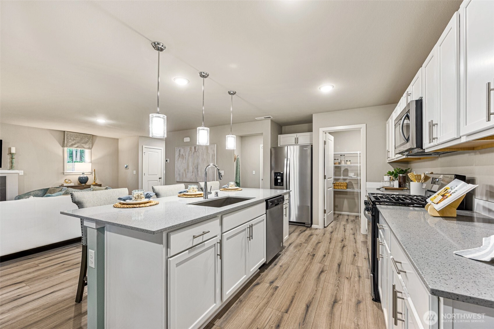 The HUGE OPEN CONCEPT great room sets the Finley plan apart! Beautiful white marble designed quartz countertops in kitchen, gas range for your inner chef, deep farm style stainless steel kitchen sink, large island w/seating for 4+, LVP throughout main living area, 8' Ceilings, gas fireplace & quartz in all bathrooms, walk in pantry, mud room! Bright white cabinets w/soft close, modern style drawer pulls and Century Home Connect technology system (Ring video doorbell, eero mesh router & MORE. Enjoy fully landscaped front and backyard under your covered patio! Century Communities is known for our exceptional quality and our outstanding warranty. Buyers must register or bring Brokers at 1st visit to receive SOC.
