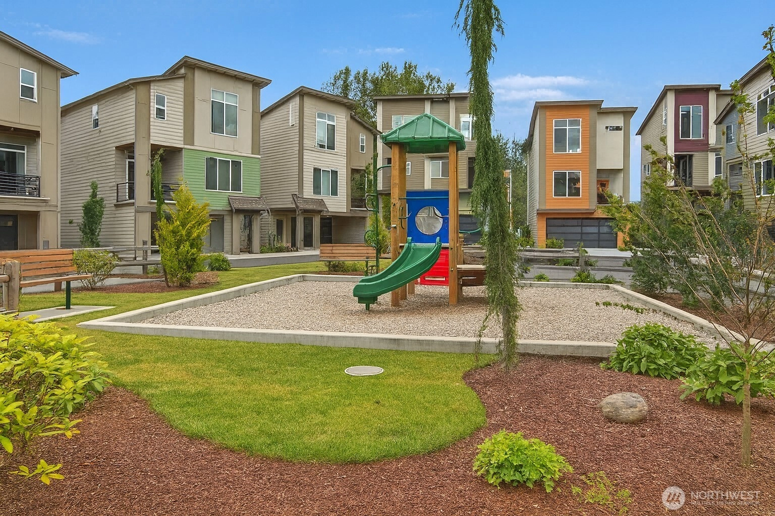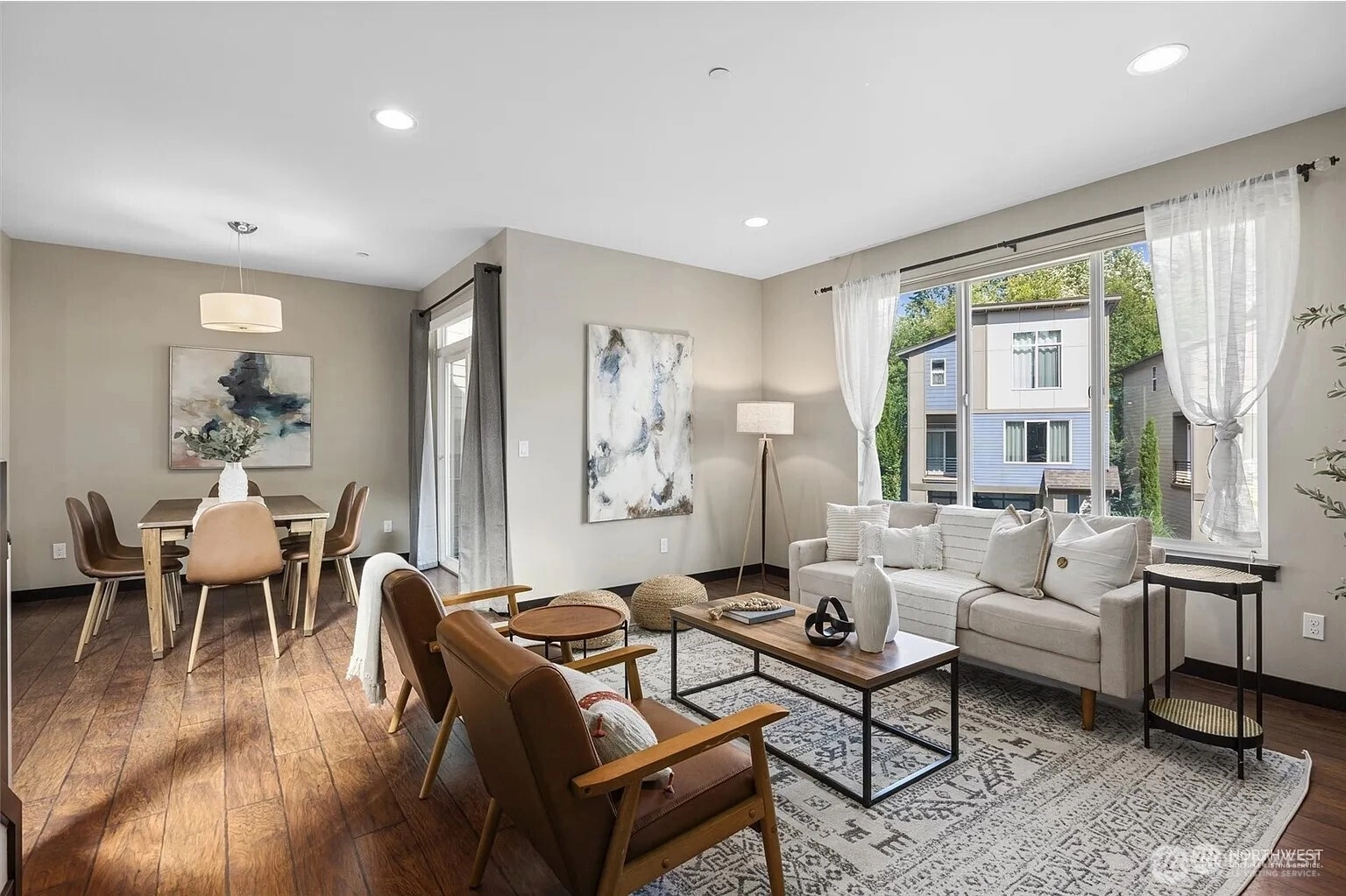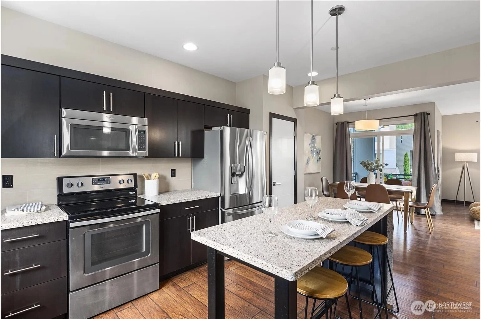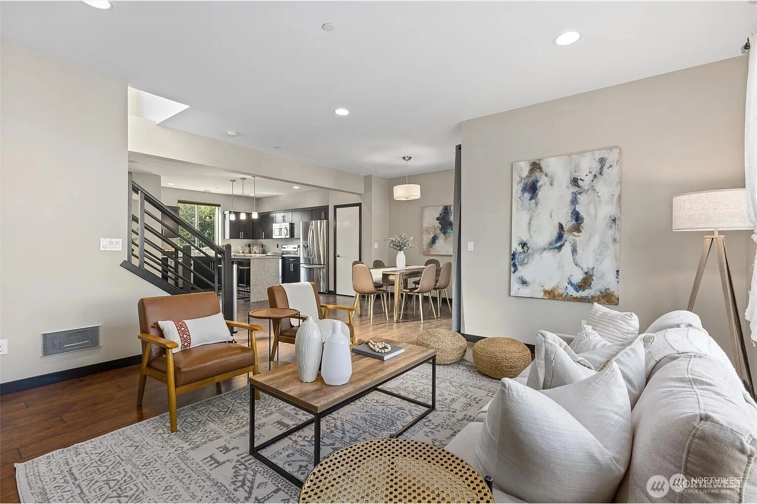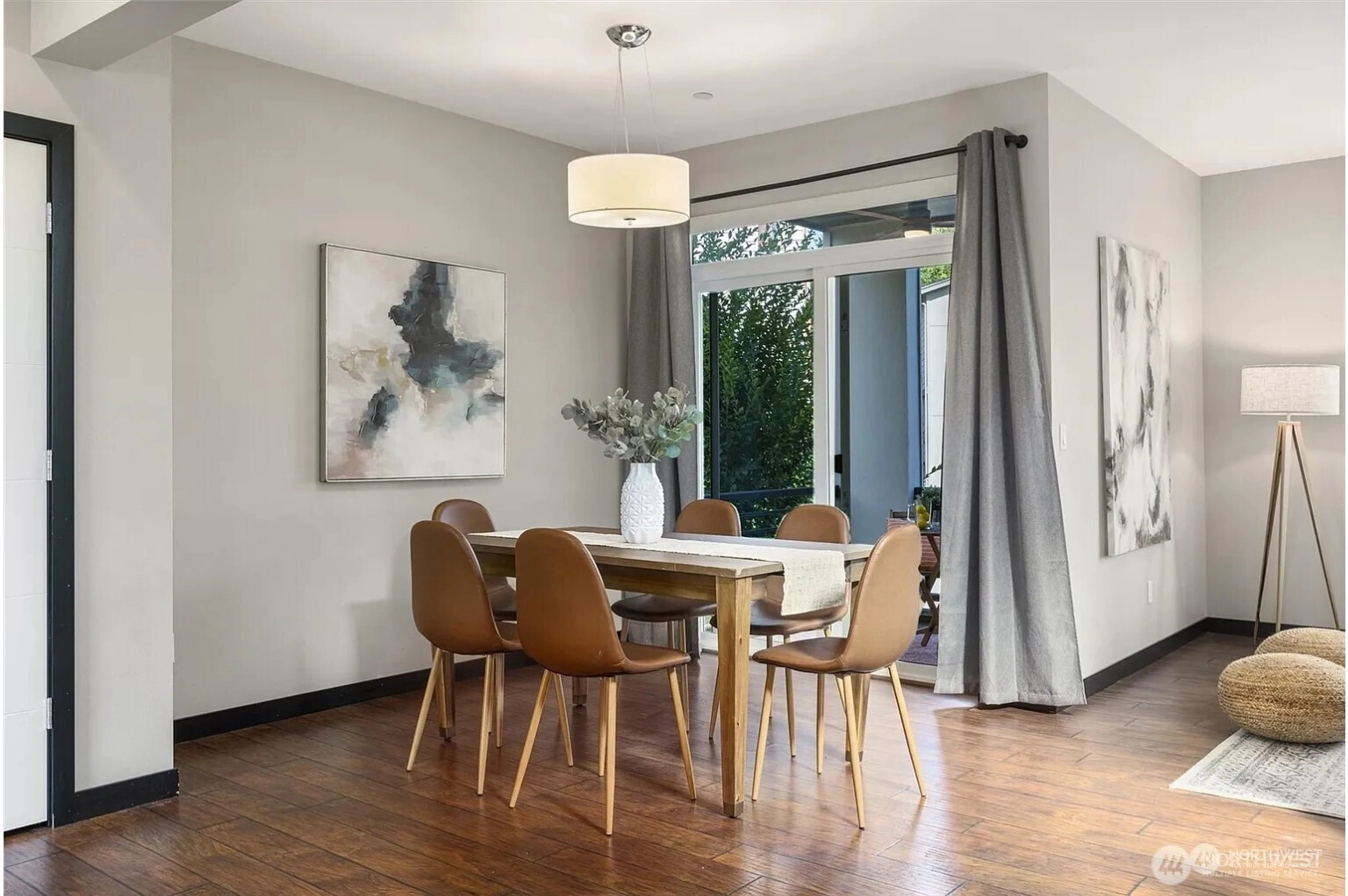 Welcome to this stunning 2015 contemporary style home. Prime location, yet tucked back in a quiet neighborhood. The main floor offers cathedral ceilings and an open concept floor plan perfect for entertaining Insulated windows. In the kitchen you'll find newer stainless steel appliances, quartz counter tops and an abundance of cabinetry. Upstairs find two good sized bedrooms with full bath, W/D and a3rd Primary that feels airy and bright with vaulted ceilings, walk in closet w/ en-suite. Enjoy the convenience of being walking distance from Ash wood park & ride & light rail. Minutes from shopping, dining, I-5 & I-405, Edmonds School District. Virtually staged