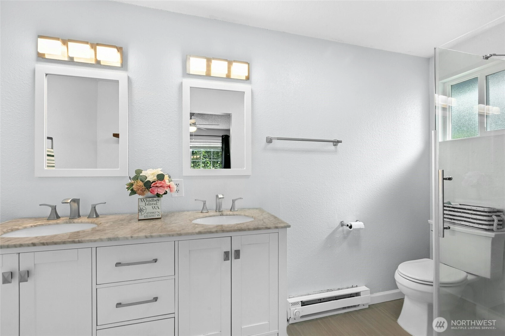 Don’t miss this charming 3-bedroom, 1.75-bath home on a sunny corner lot. Cozy & easy to maintain, this gem features an inviting fully fenced backyard w/ patio, terraced gardens, & fire pit-perfect for entertaining. Newer vinyl plank floors throughout the living area, warm wood-burning fireplace insert, ceiling fans, & energy-efficient double paned vinyl windows. Primary bath w/ double sinks, tile floors, & shower. Additionally: kitchen w/ newer appliances & butcher block counters, a newer roof (2017), fresh exterior paint (2023), newer water heater (2023) & a large utility room/garage storage add extra value. Just minutes from Deception Pass State Park and NAS Whidbey Island! Assumable 2.25% loan for qualified VA buyer.