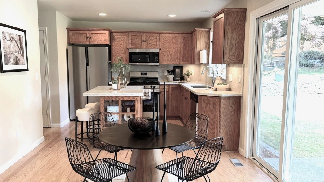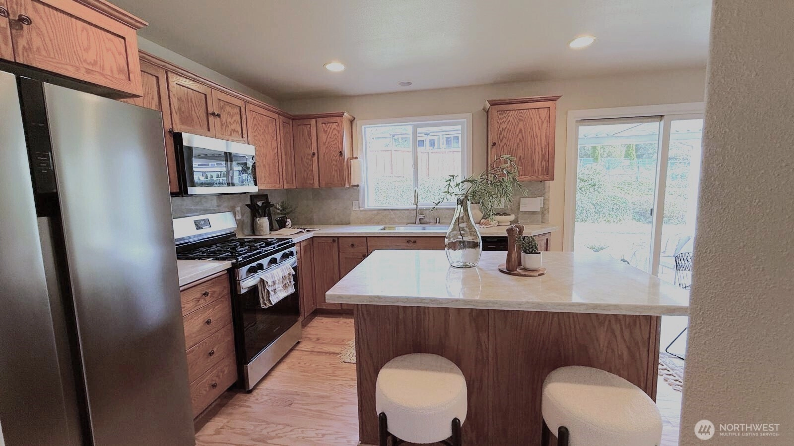 Beautifully updated and well-maintained home in Meadow Glen. New hardwood thorough the entire main floor. Brand-new appliances in the kitchen and the laundry room. 4 large bedrooms upstairs with new paint and carpet. Primary bed w/ attached 5 piece bath. Large unfinished bonus space off primary bedroom (350 sqf); use for storage, finish for office or nursery. Beautiful backyard w/covered patio & natural gas stub for BBQ, along w/nice shed. 3 car tandem garage is insulated, w/ insulated garage door, & built in workbench. Home is at the end of cul-de-sac and borders on one side & part of the back w/county designated protected area. Perfect location for commuters w/easy access to I-5/Hwy 18/167 & area amenities.