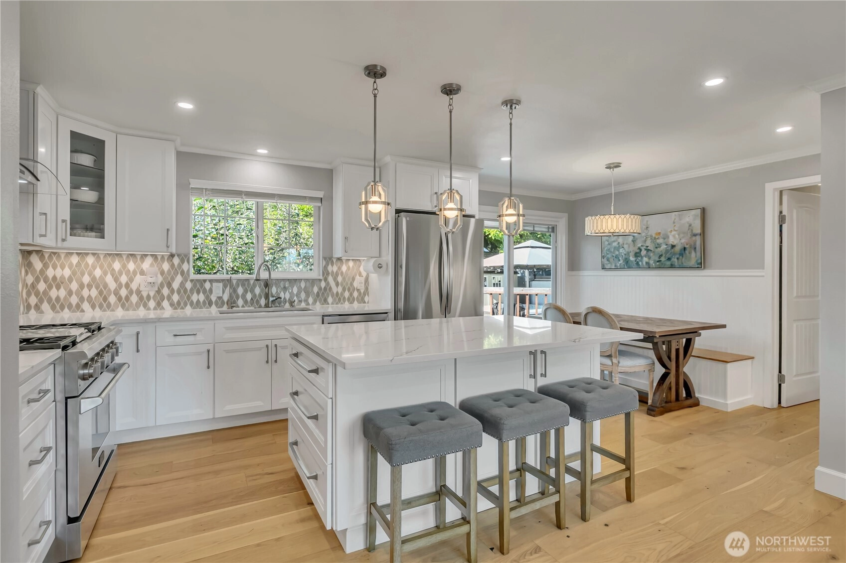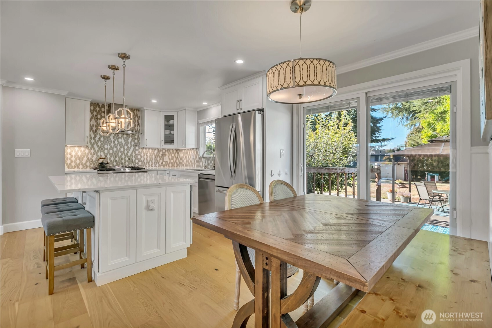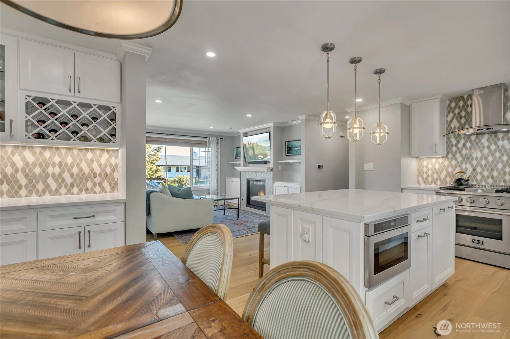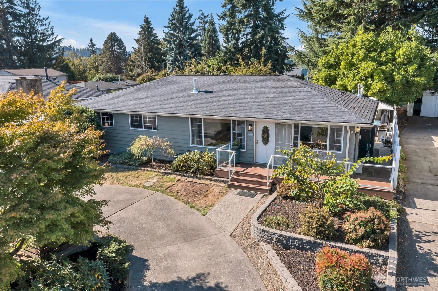 Beautifully remodeled, this one-level designer home combines modern style with timeless appeal. The front porch overlooks the landscaped yard w/partial Cascade views. Inside, the light-filled living rm w/gas FP features custom built-ins & a large picture window. Chef’s kitchen showcases quartz counters, designer tile backsplash, island w/microwave drawer, KUCHT gas range w/griddle & bar/coffee station. Dining area includes built-in bench seating, and 4 bdrms offer flexibility for work or guests. Set on a generous, level ¼ acre lot w/fenced backyard, deck, patio, hot tub, fruit trees & garden beds, plus DADU/ADU potential (buyer to verify). Separate laundry, circular driveway, tankless water heater, and A/C, complete this exceptional home.