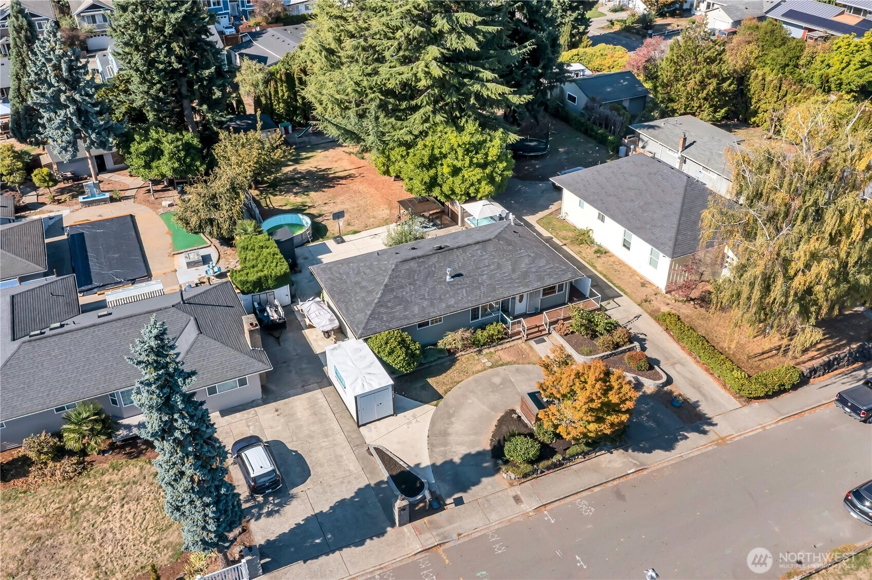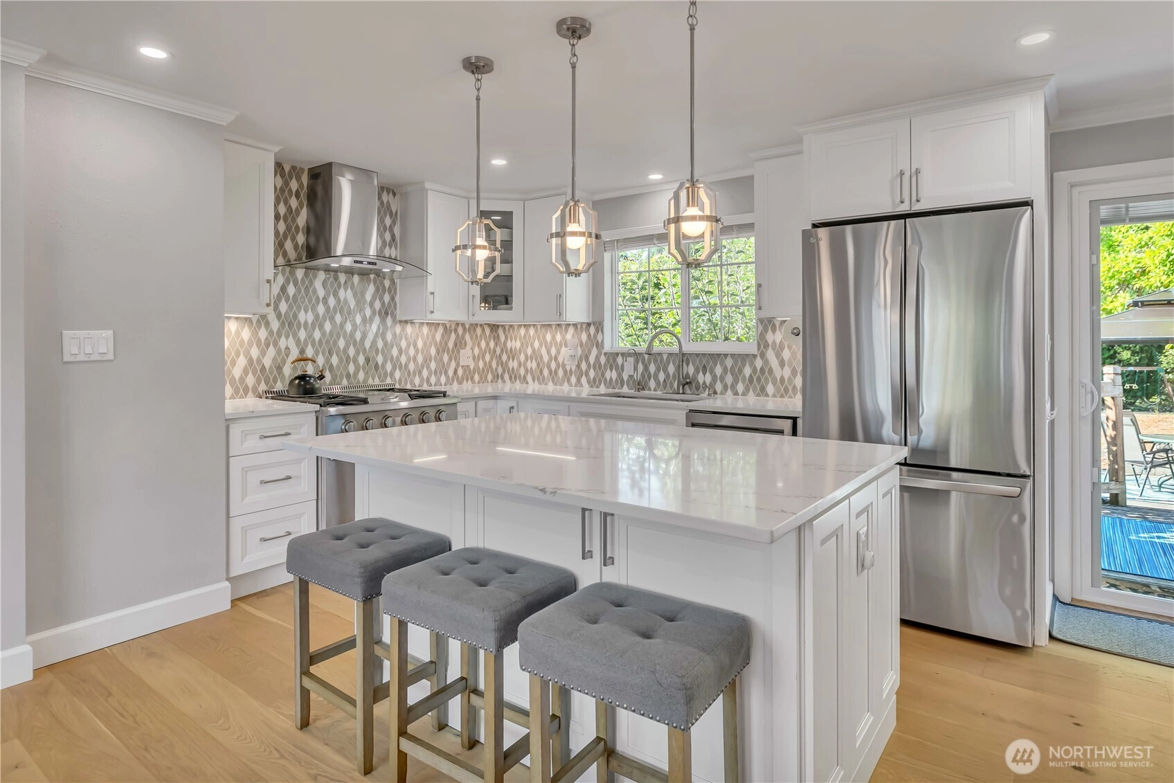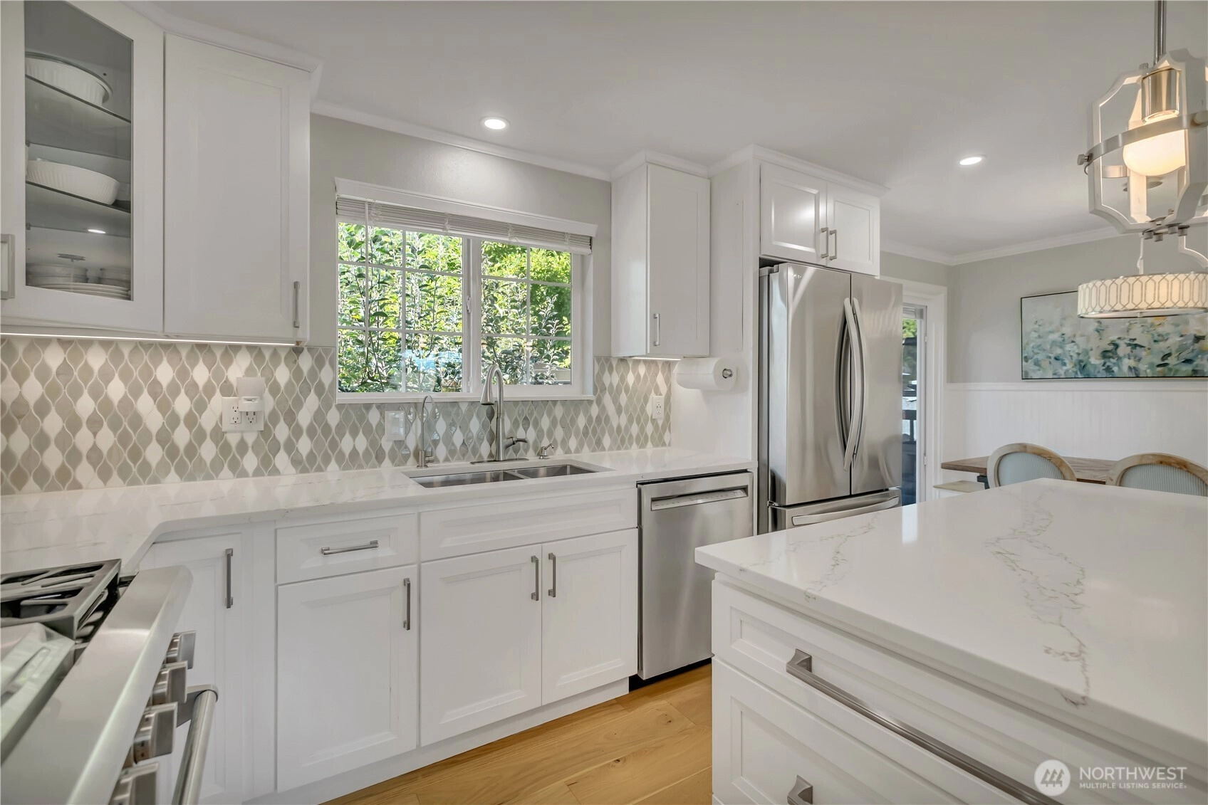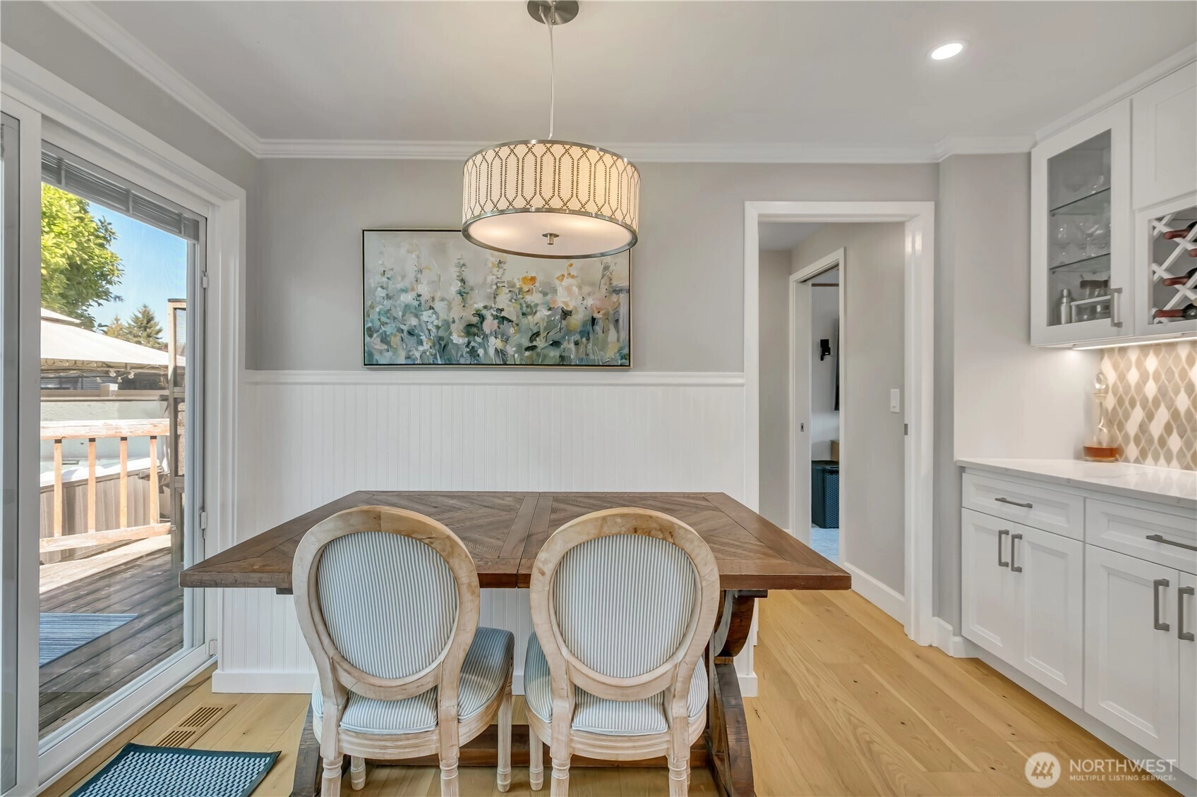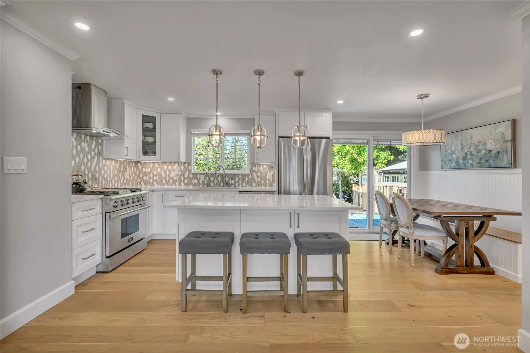 Beautifully remodeled, this one-level designer home combines modern style with timeless appeal. The front porch overlooks the landscaped yard w/partial Cascade views. Inside, the light-filled living rm w/gas FP features custom built-ins & a large picture window. Chef’s kitchen showcases quartz counters, designer tile backsplash, island w/microwave drawer, KUCHT gas range w/griddle & bar/coffee station. Dining area includes built-in bench seating, and 4 bdrms offer flexibility for work or guests. Set on a generous, level ¼ acre lot w/fenced backyard, deck, patio, hot tub, fruit trees & garden beds, plus DADU/ADU potential (buyer to verify). Separate laundry, circular driveway, tankless water heater, and A/C, complete this exceptional home.