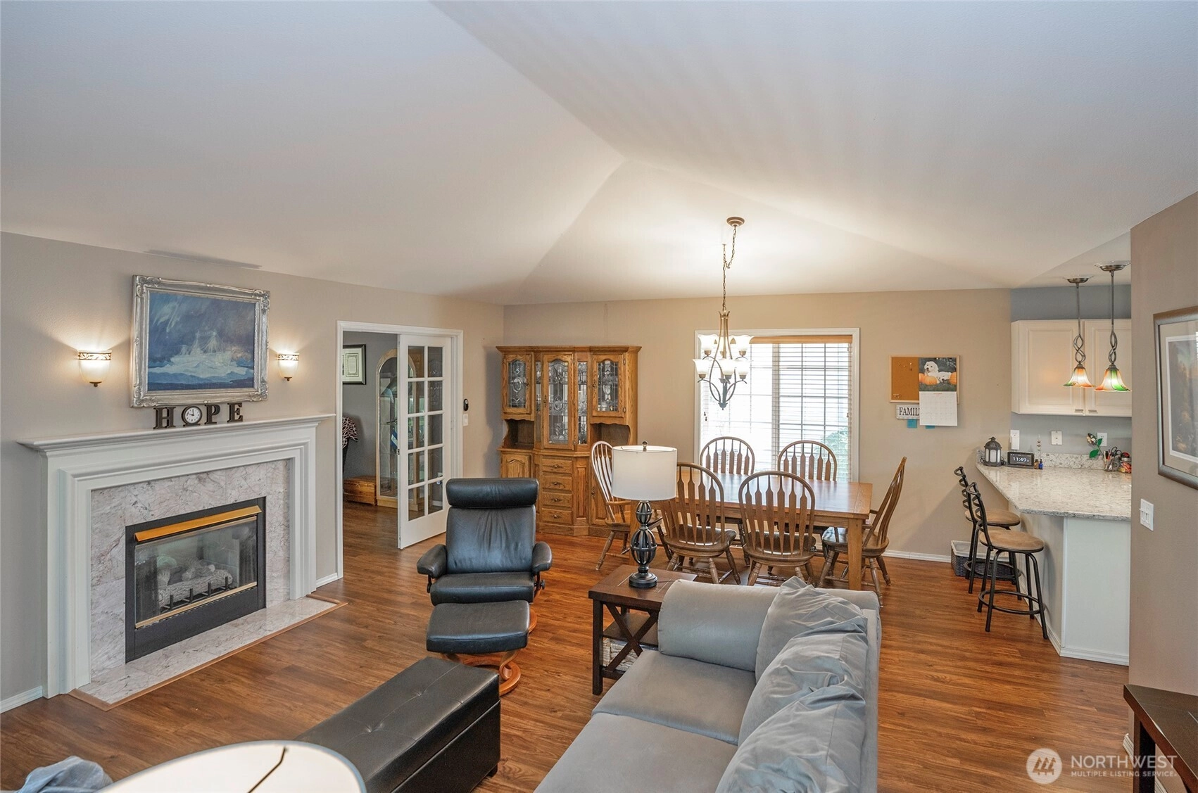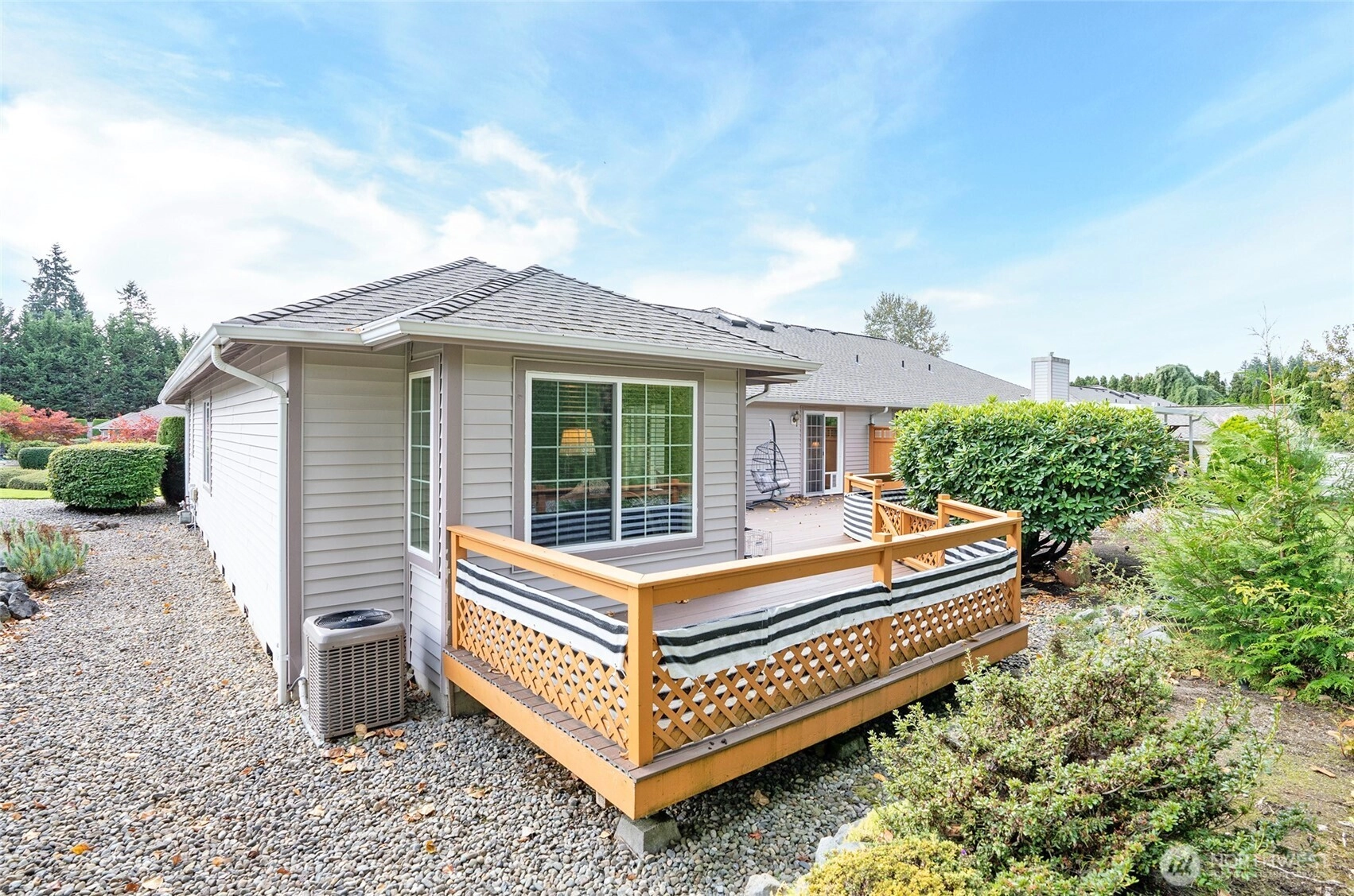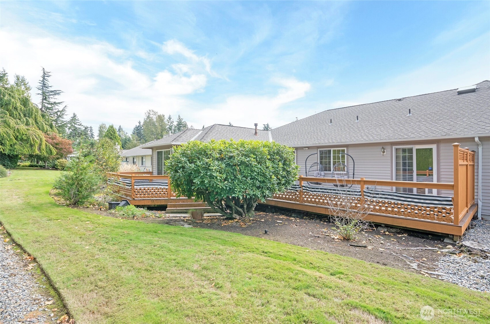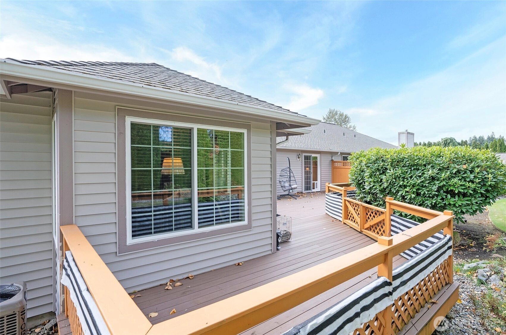 Enjoy one-level living in the beautiful, gated community of Arabella, featuring peaceful ponds, & fountains. This elegant home offers easy-care luxury vinyl flooring, vaulted ceilings for additional openness, & a spacious great room with a double-sided gas fireplace—perfect for entertaining. The updated kitchen boasts Granite countertops, stainless steel appliances, and a premium gas range. New windows brighten the family room, while the primary suite and living room open to a large Trex deck for relaxing or hosting guests, as well as the 2 sliding doors feature doggy doors. French doors lead to a private den, plus an attached 2-car garage & utility room with deep sink. A perfect blend of comfort, style, and simplicity in a serene setting!