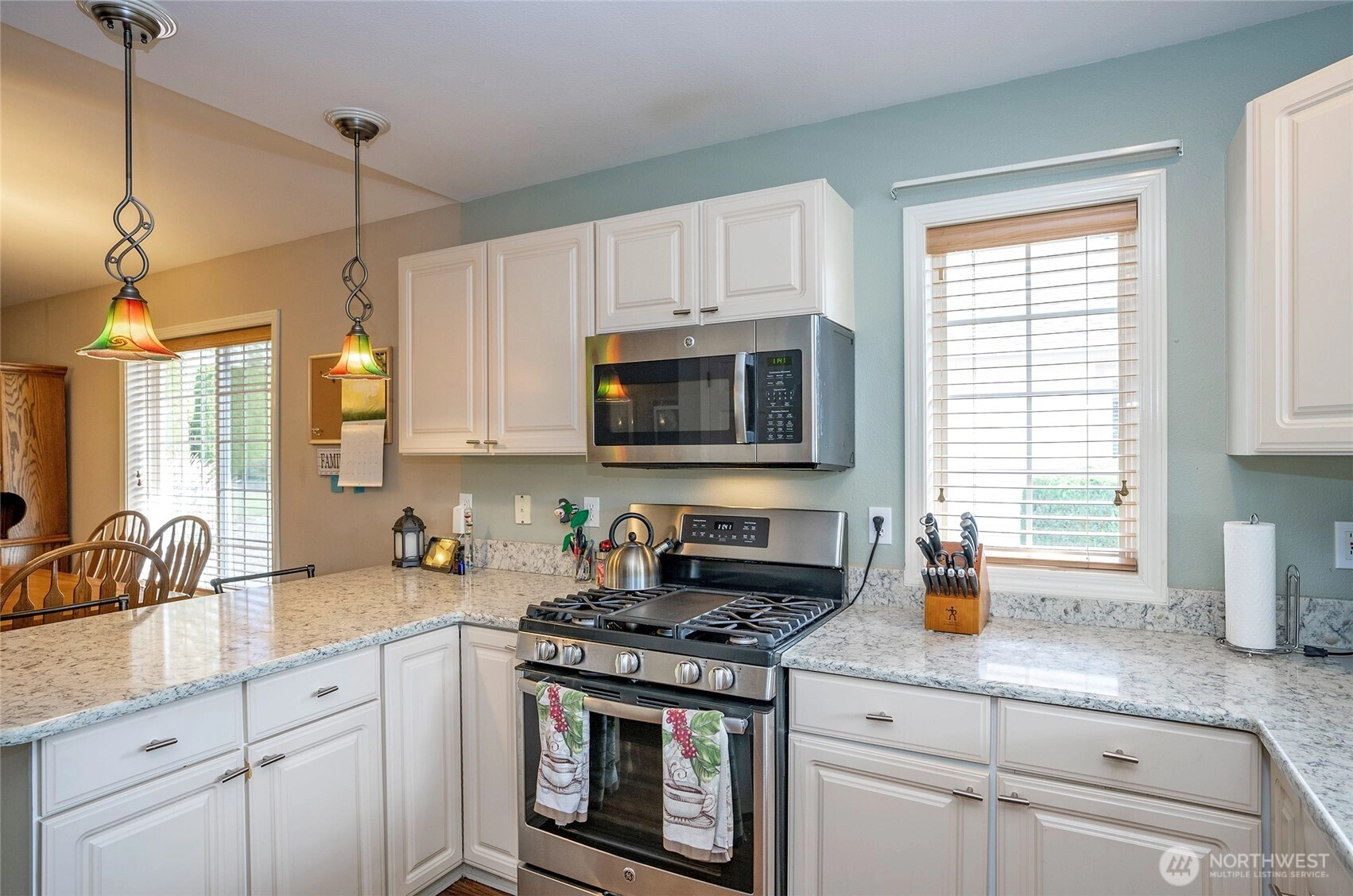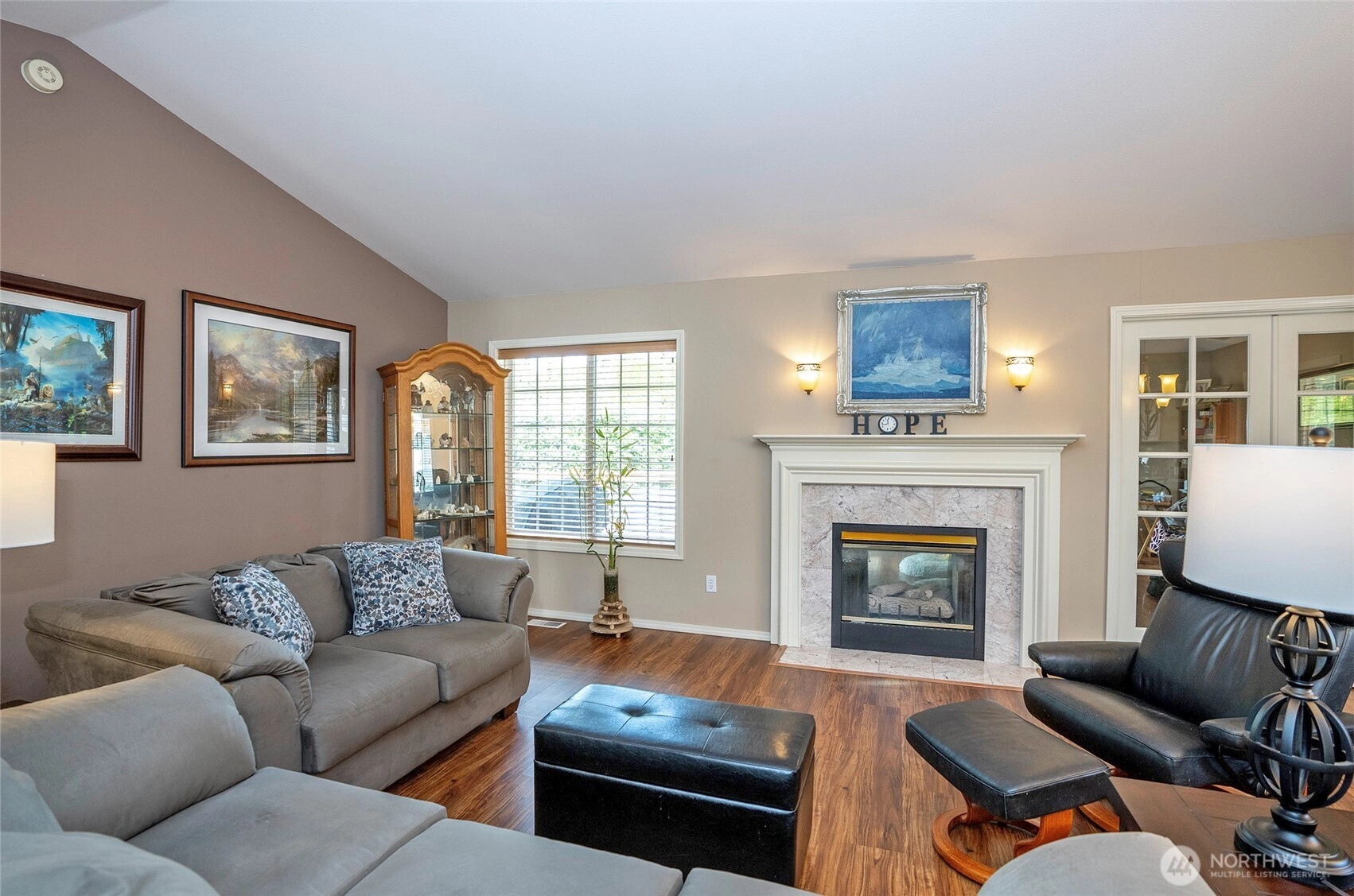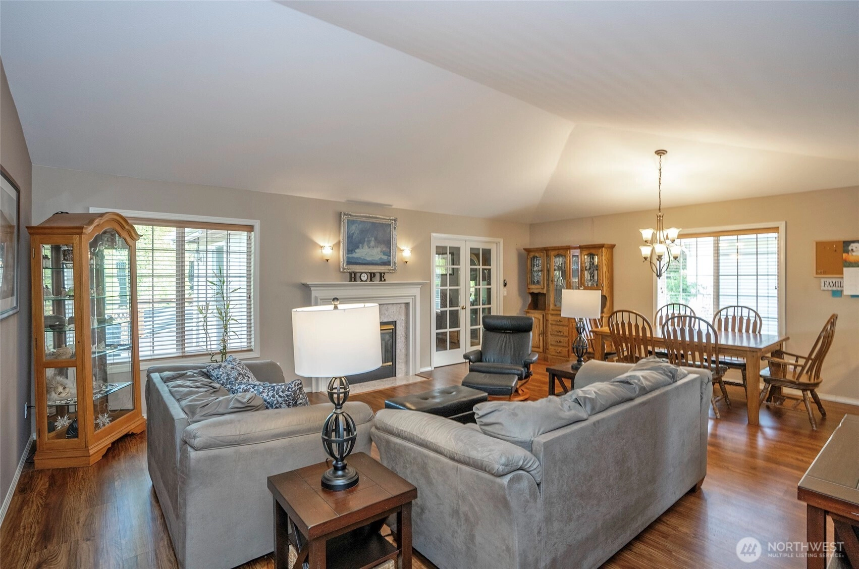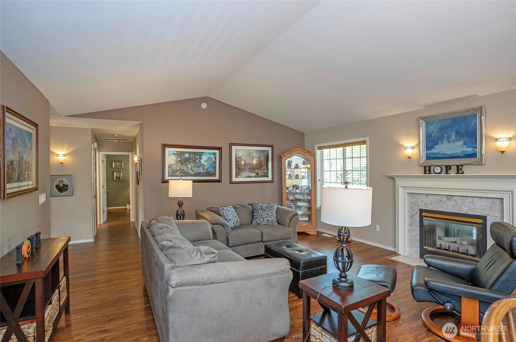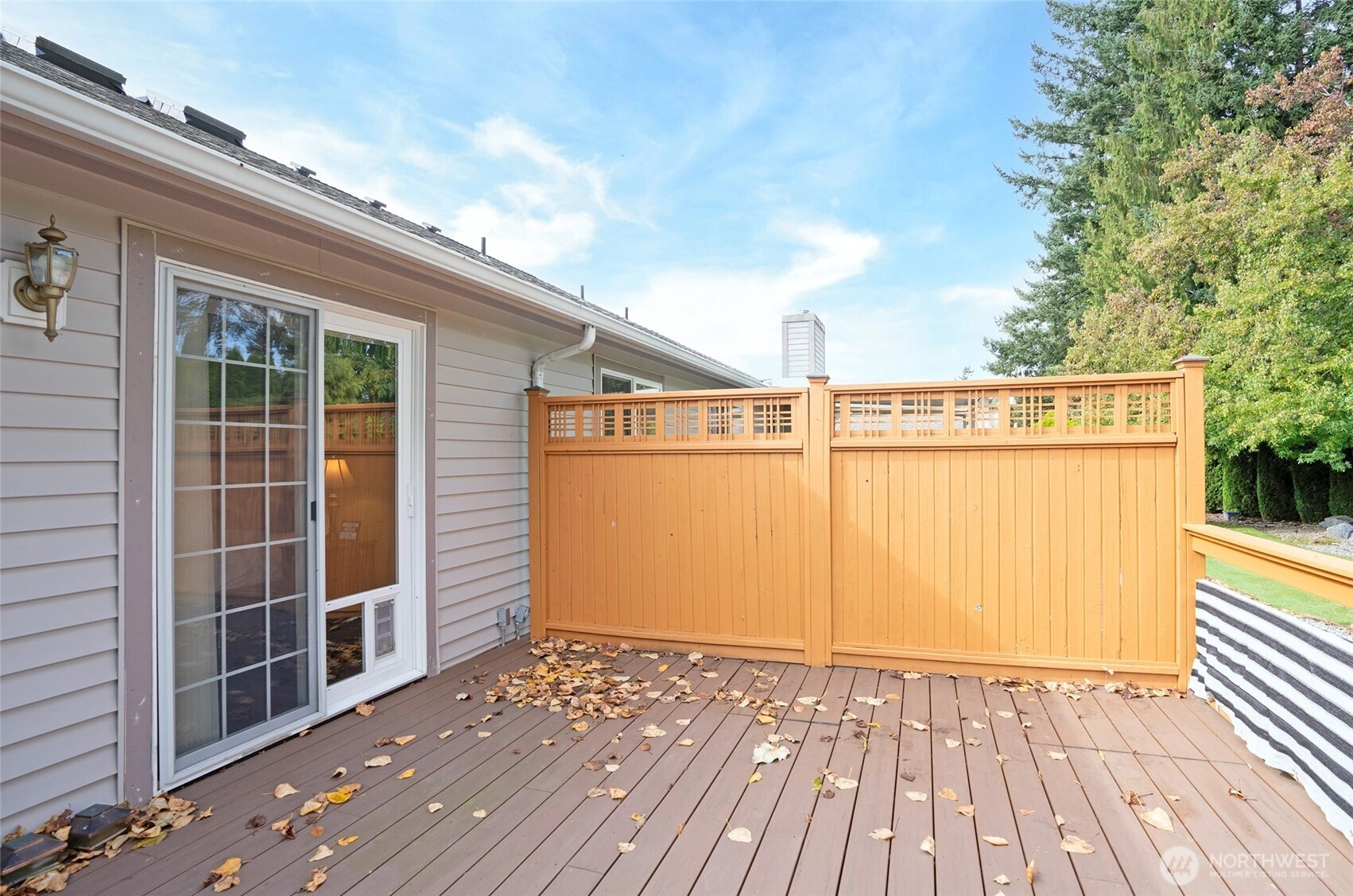 Enjoy one-level living in the beautiful, gated community of Arabella, featuring peaceful ponds, & fountains. This elegant home offers easy-care luxury vinyl flooring, vaulted ceilings for additional openness, & a spacious great room with a double-sided gas fireplace—perfect for entertaining. The updated kitchen boasts Granite countertops, stainless steel appliances, and a premium gas range. New windows brighten the family room, while the primary suite and living room open to a large Trex deck for relaxing or hosting guests, as well as the 2 sliding doors feature doggy doors. French doors lead to a private den, plus an attached 2-car garage & utility room with deep sink. A perfect blend of comfort, style, and simplicity in a serene setting!
