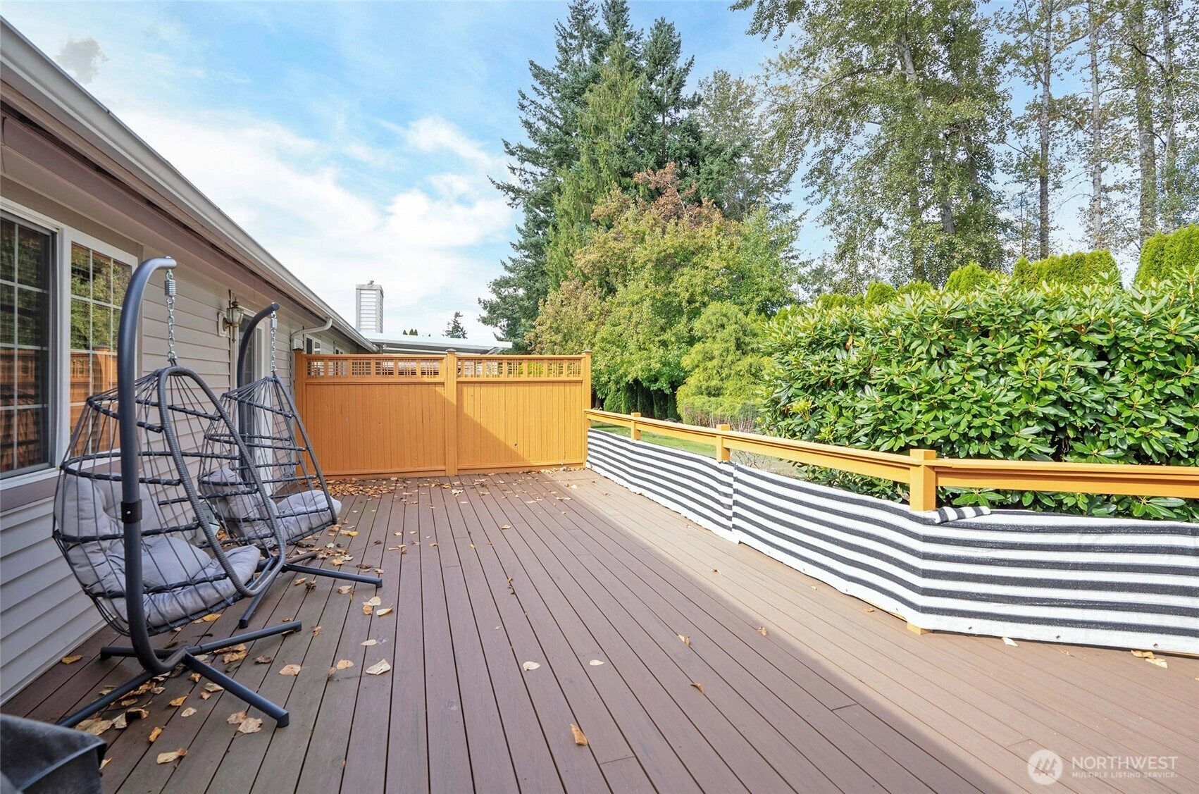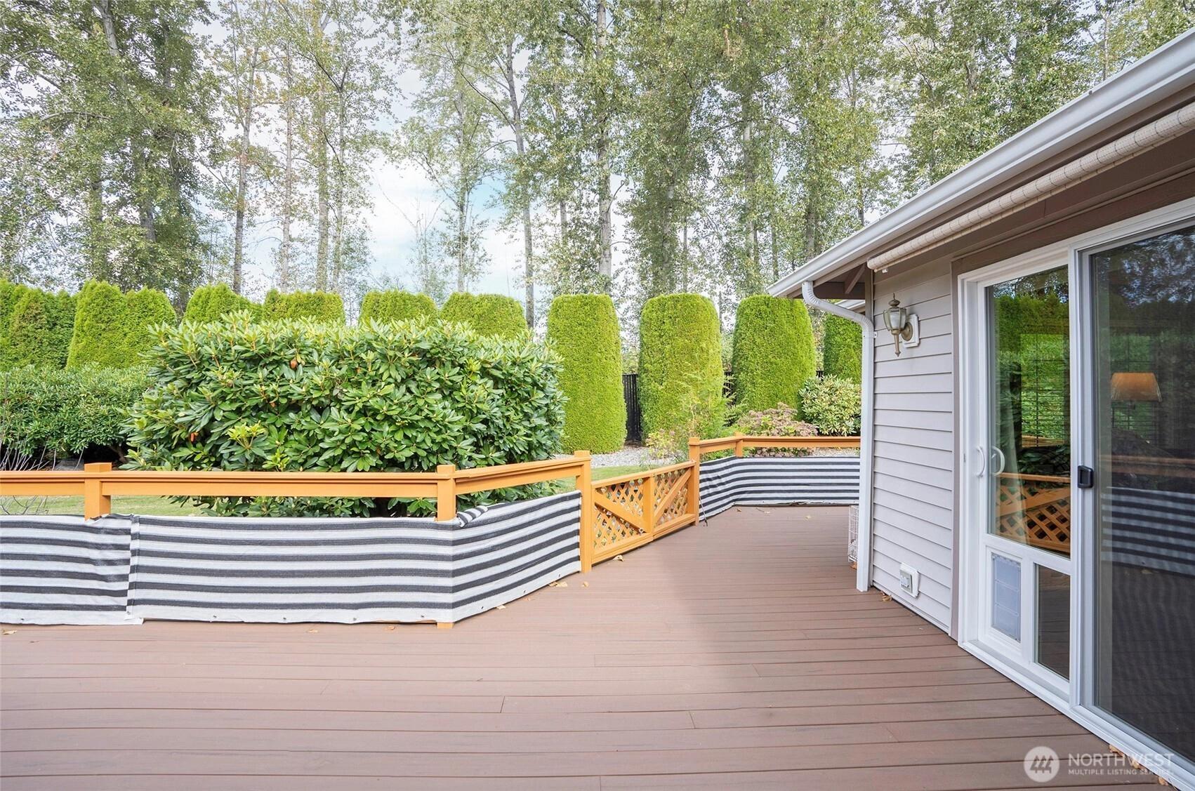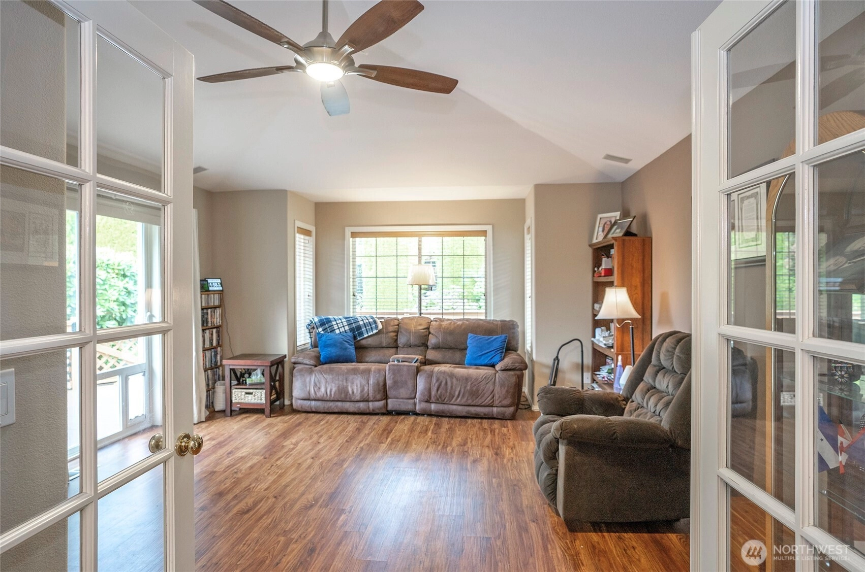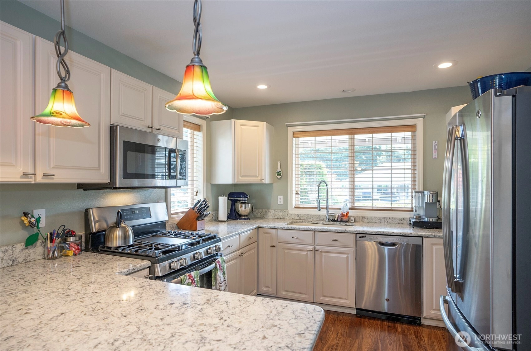 Enjoy one-level living in the beautiful, gated community of Arabella, featuring peaceful ponds, & fountains. This elegant home offers easy-care luxury vinyl flooring, vaulted ceilings for additional openness, & a spacious great room with a double-sided gas fireplace—perfect for entertaining. The updated kitchen boasts Granite countertops, stainless steel appliances, and a premium gas range. New windows brighten the family room, while the primary suite and living room open to a large Trex deck for relaxing or hosting guests, as well as the 2 sliding doors feature doggy doors. French doors lead to a private den, plus an attached 2-car garage & utility room with deep sink. A perfect blend of comfort, style, and simplicity in a serene setting!