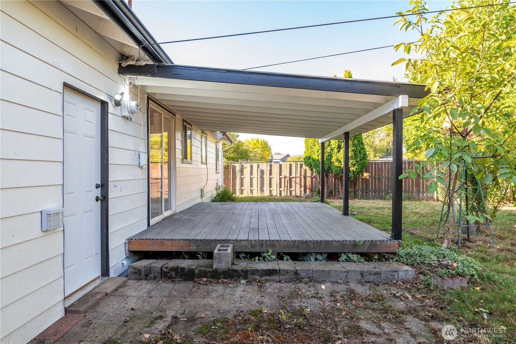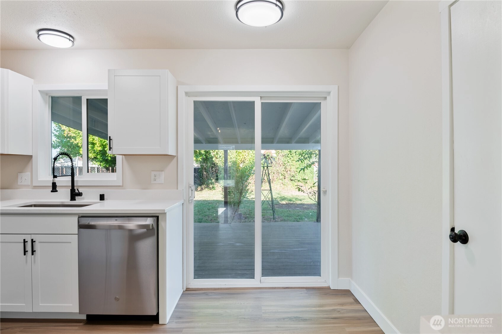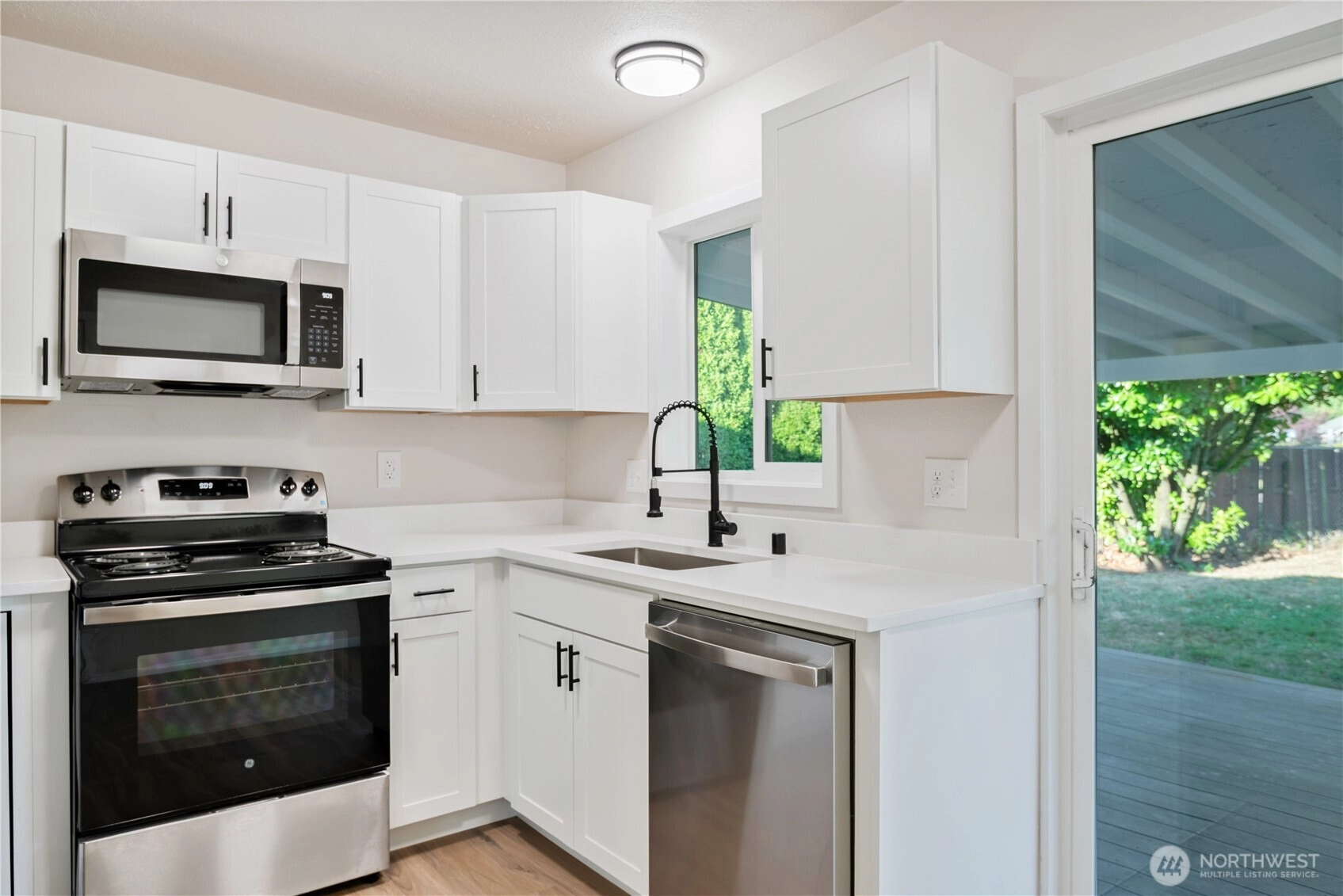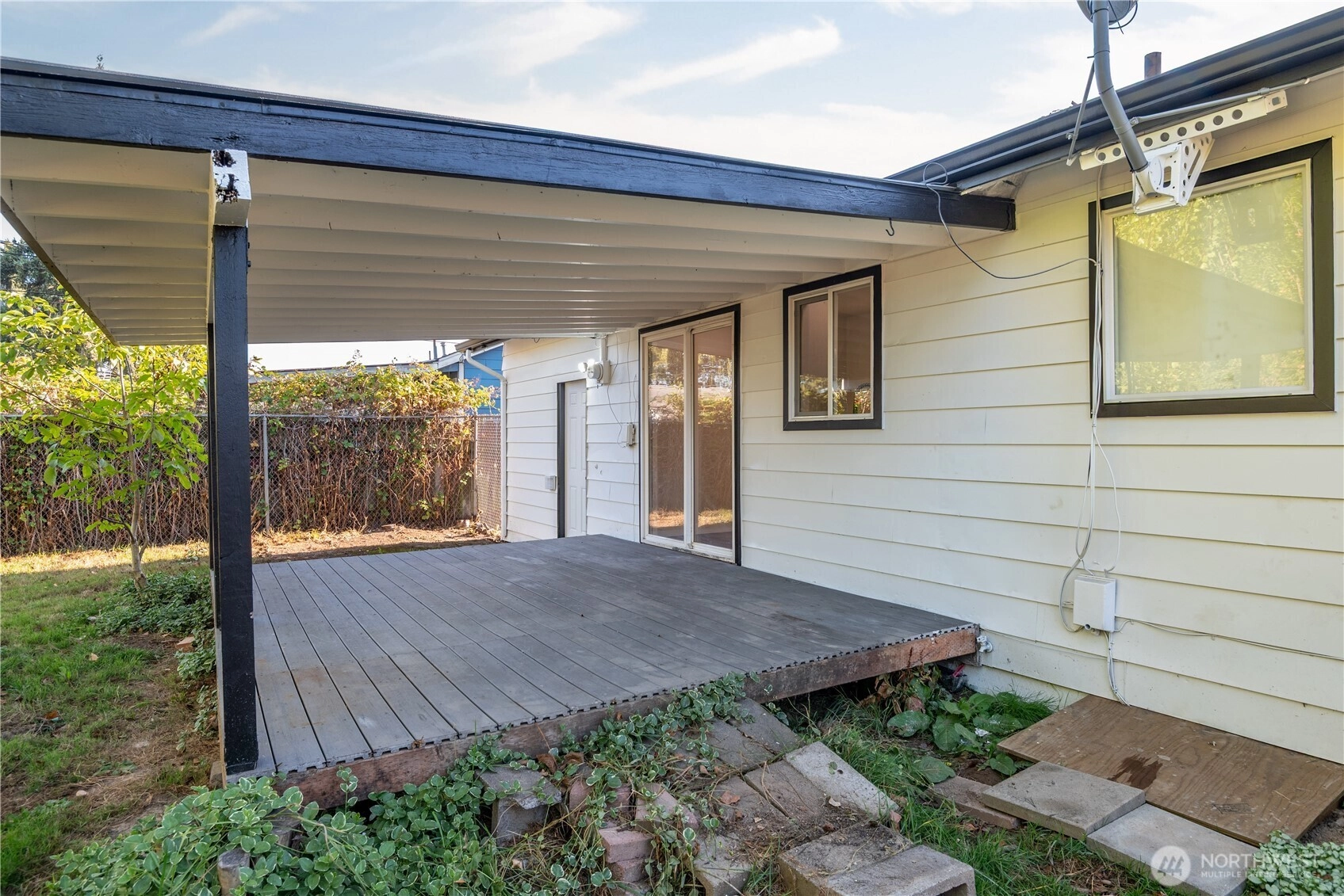 Freshly remodeled one level home w/private fully fenced back yard! Pristine home boasting 2 large bedrooms, updated bathroom w/new fixtures, light filled living room w/picture window, beautiful kitchen w/new cabinetry-quartz countertops-under mount sink-stainless steel appliances & slider to large covered Trex deck, new luxury vinyl floors throughout, new vinyl windows, 30 year architectural roof, fresh interior & exterior paint, 240 SF garage with garage door opener and a well groomed yard. The home is conveniently located to parks, shopping, restaurants, I-5, and schools.