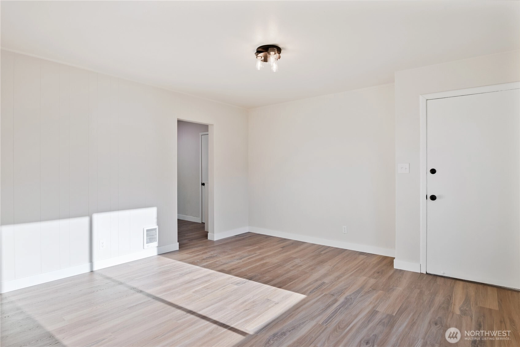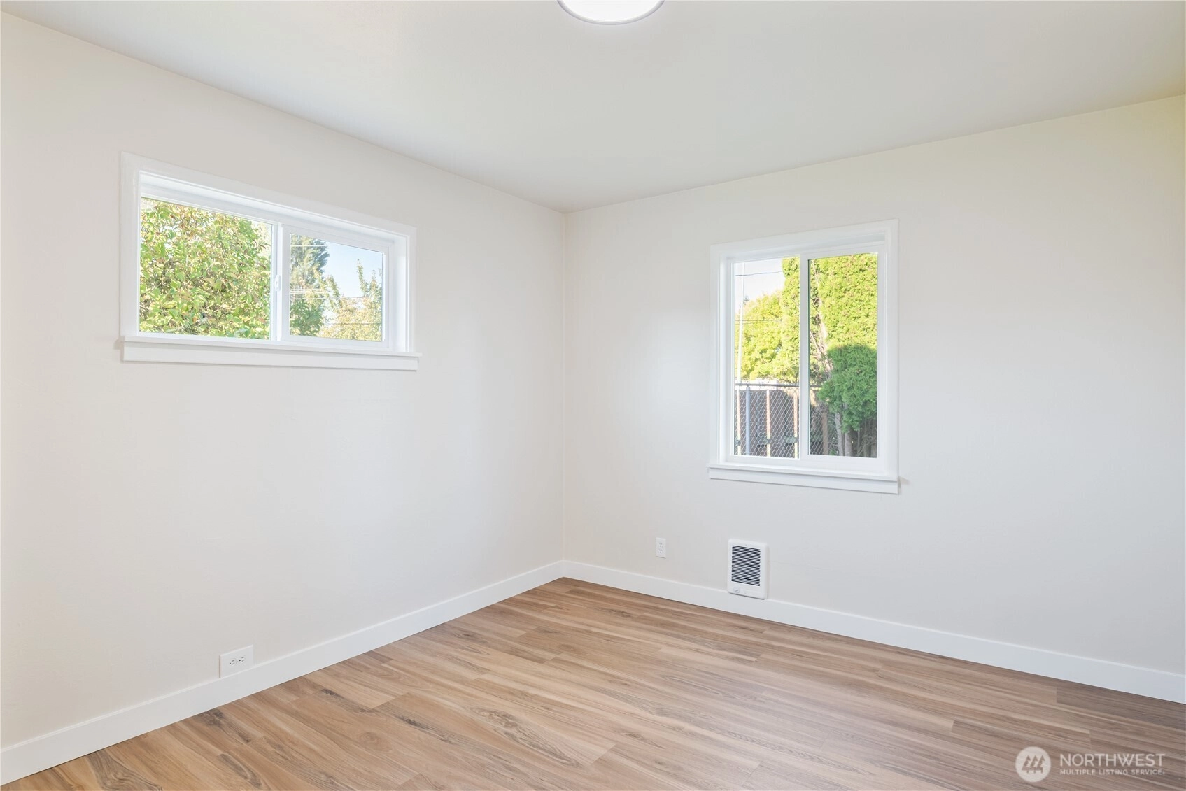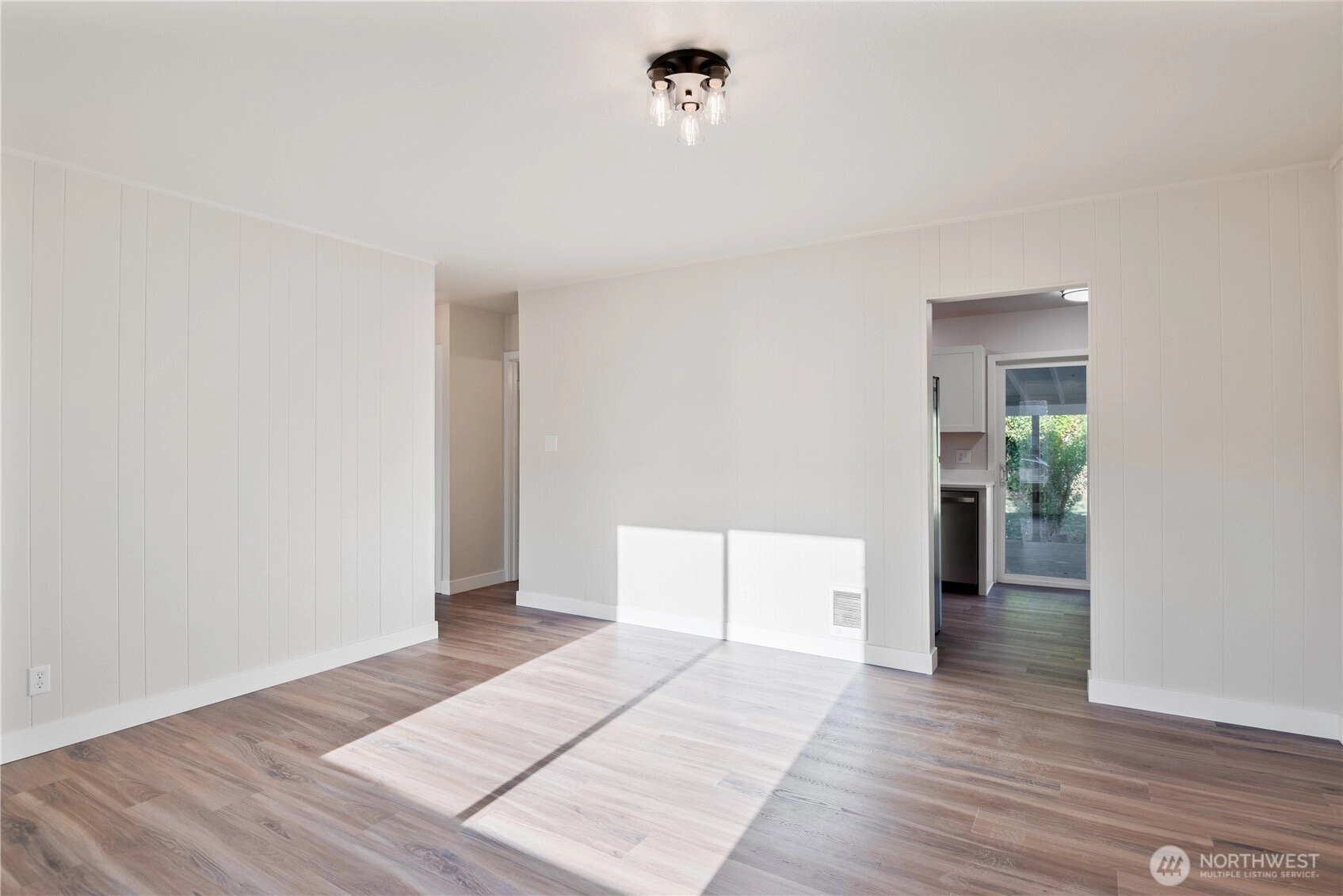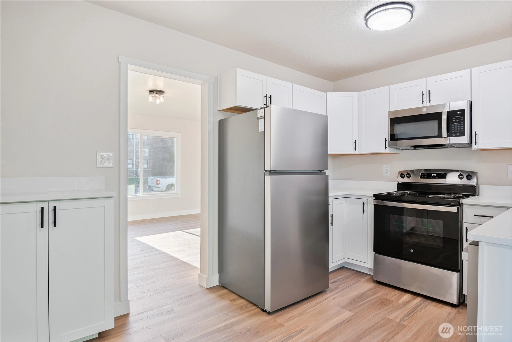 Freshly remodeled one level home w/private fully fenced back yard! Pristine home boasting 2 large bedrooms, updated bathroom w/new fixtures, light filled living room w/picture window, beautiful kitchen w/new cabinetry-quartz countertops-under mount sink-stainless steel appliances & slider to large covered Trex deck, new luxury vinyl floors throughout, new vinyl windows, 30 year architectural roof, fresh interior & exterior paint, 240 SF garage with garage door opener and a well groomed yard. The home is conveniently located to parks, shopping, restaurants, I-5, and schools.