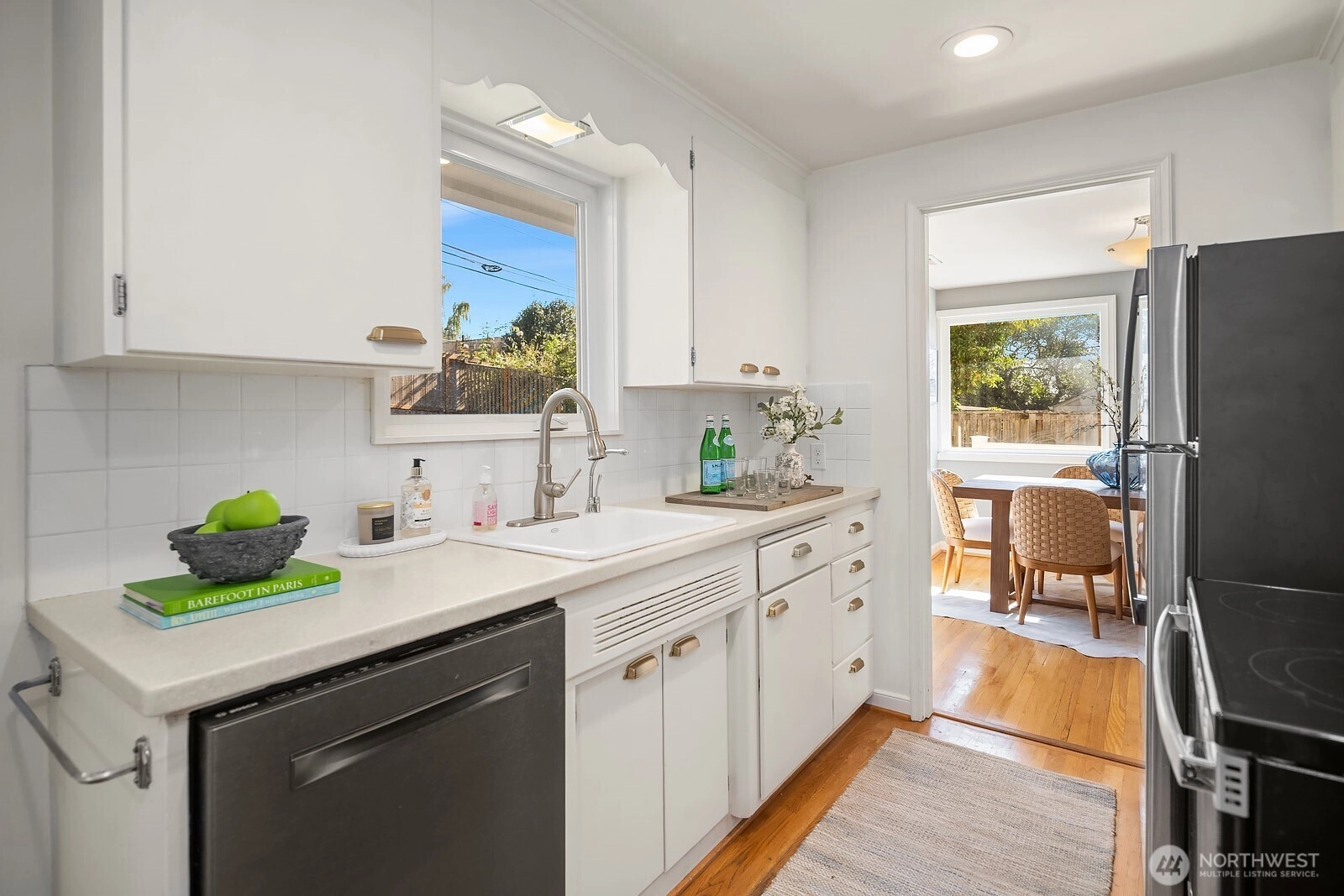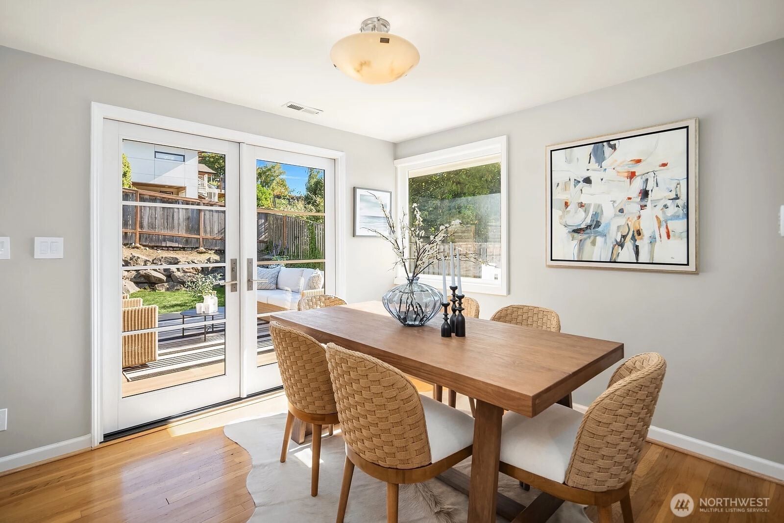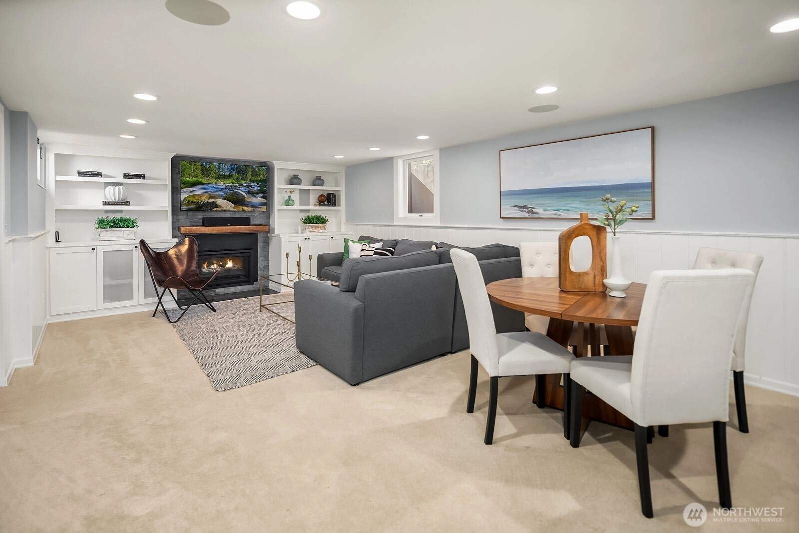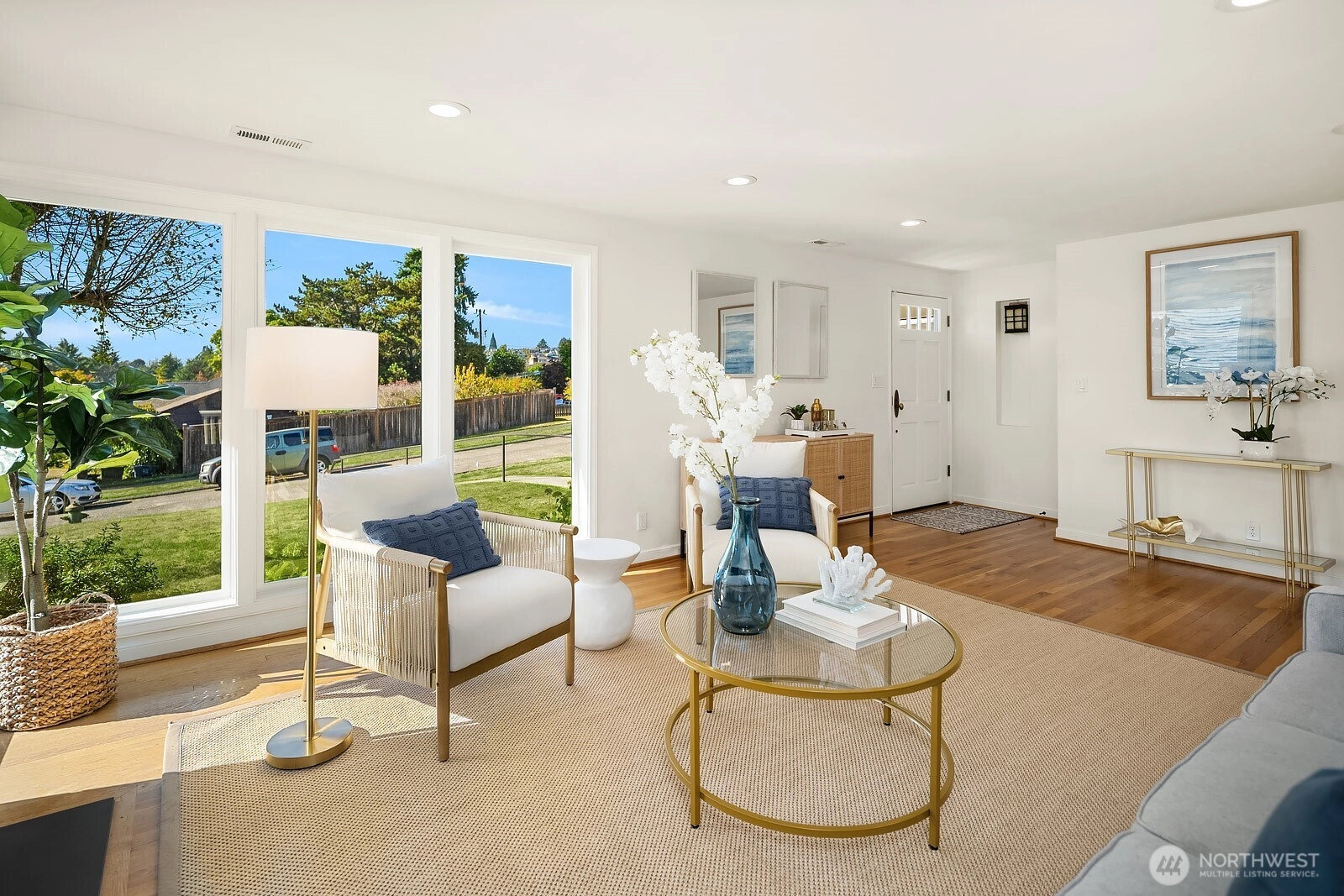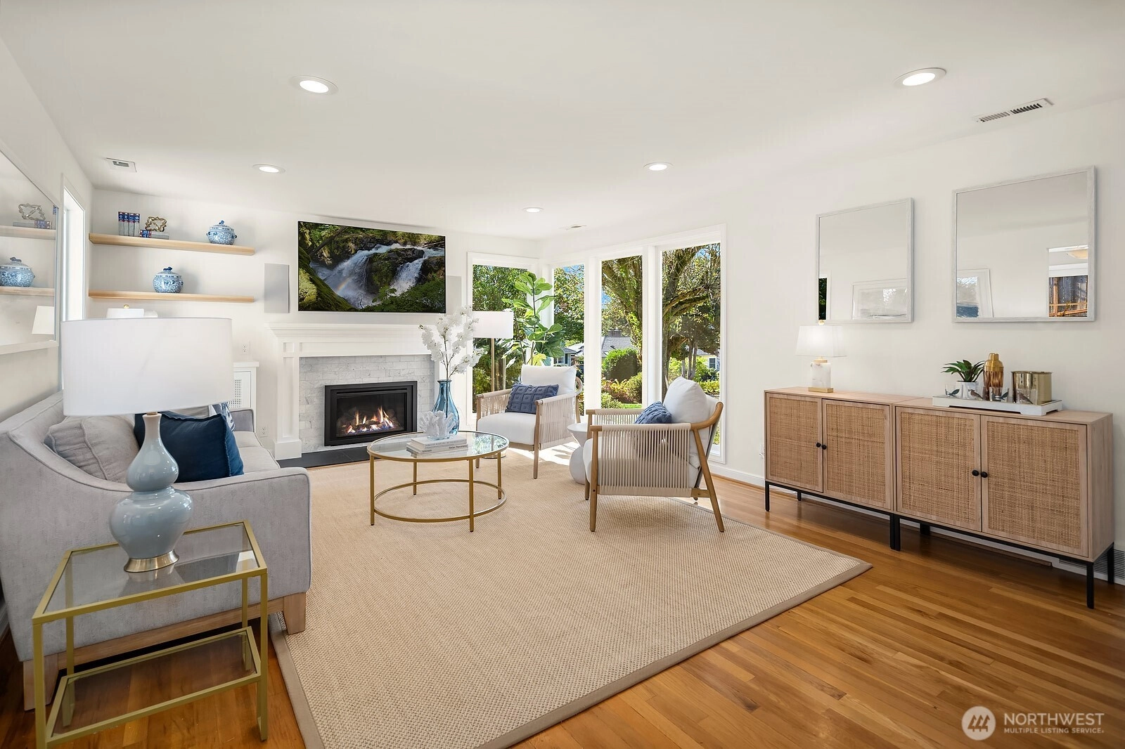 Contemporary updates blend w/ mid-century elegance in this Belvedere Terrace home, perfectly situated on an expansive, sun-drenched lot. The living room, bathed in natural light from its floor-to-ceiling windows, is anchored by a marble fireplace & rich hardwood floors. The dining room seamlessly opens to an inviting deck, ideal for entertaining. The kitchen is equipped w/ SS appliances, brushed brass hardware, & Corian countertops. Three generous bedrooms & an updated bath complete the main. The lower level offers a private retreat, including a remodeled family room w/ wet bar, a nonconforming bedroom or office, a second marble bath, a laundry room & a one-car garage. Soak in NE Seattle living w/ territorial views in this ideal location!