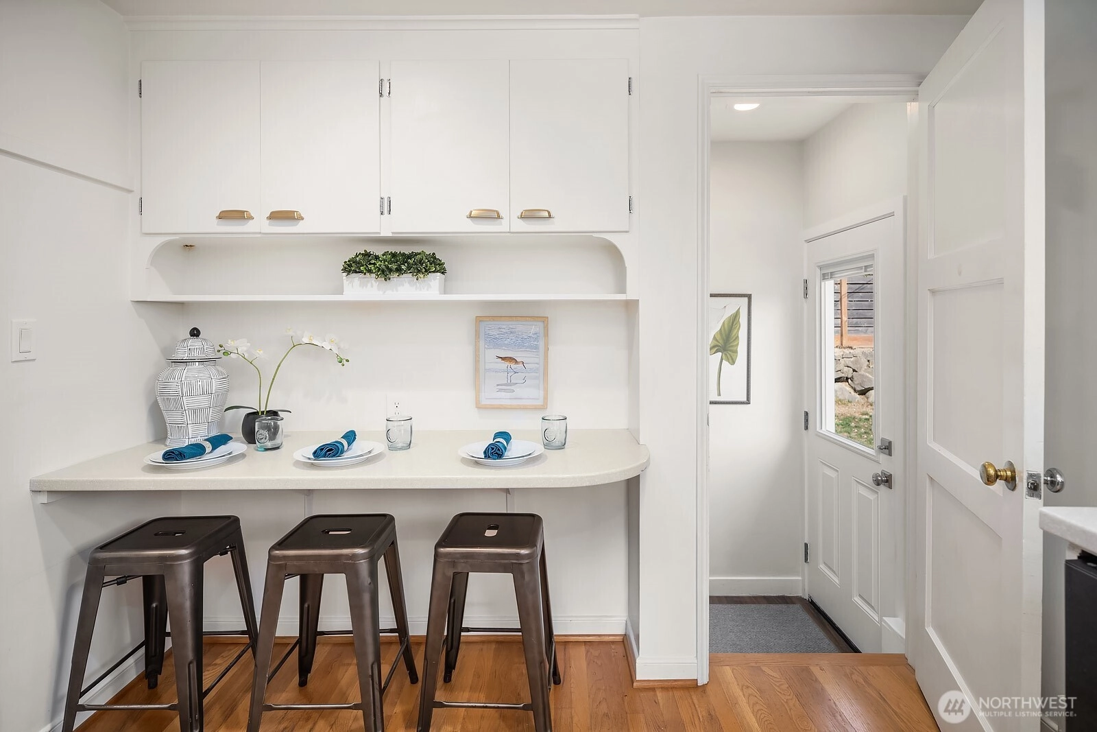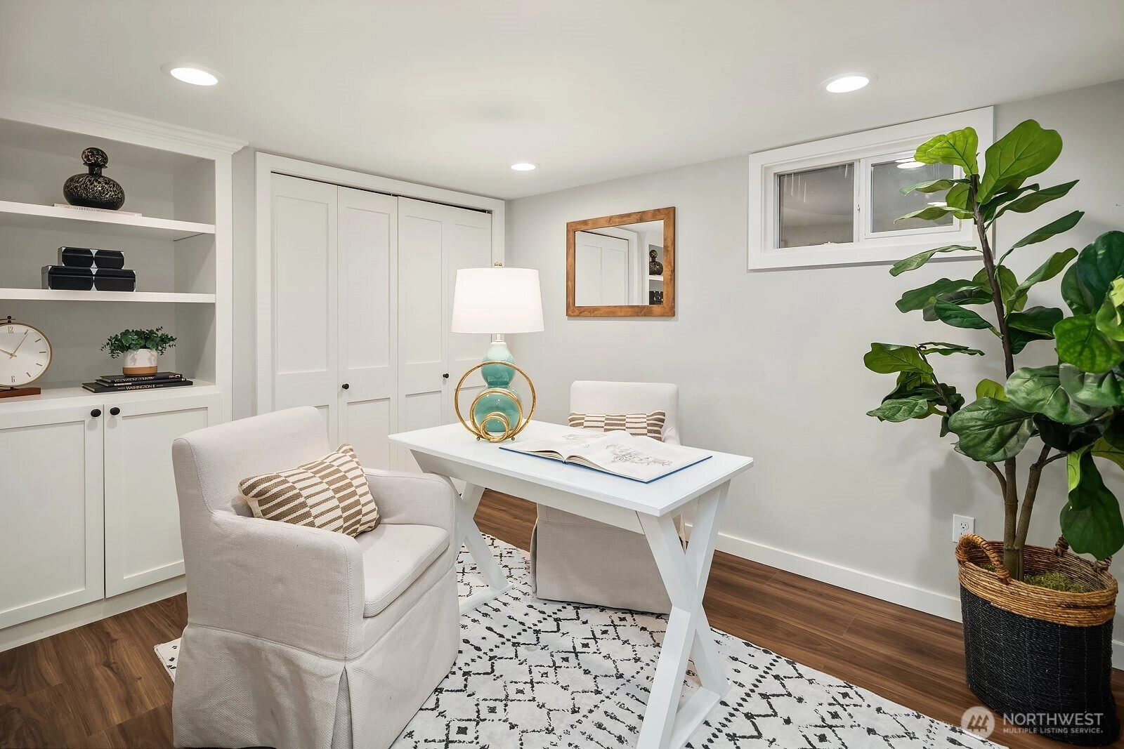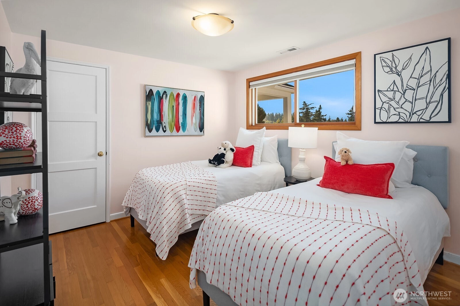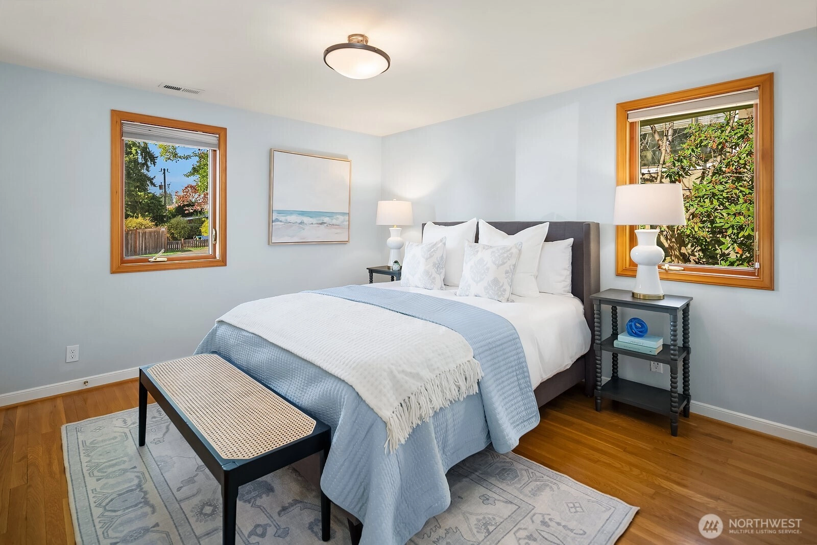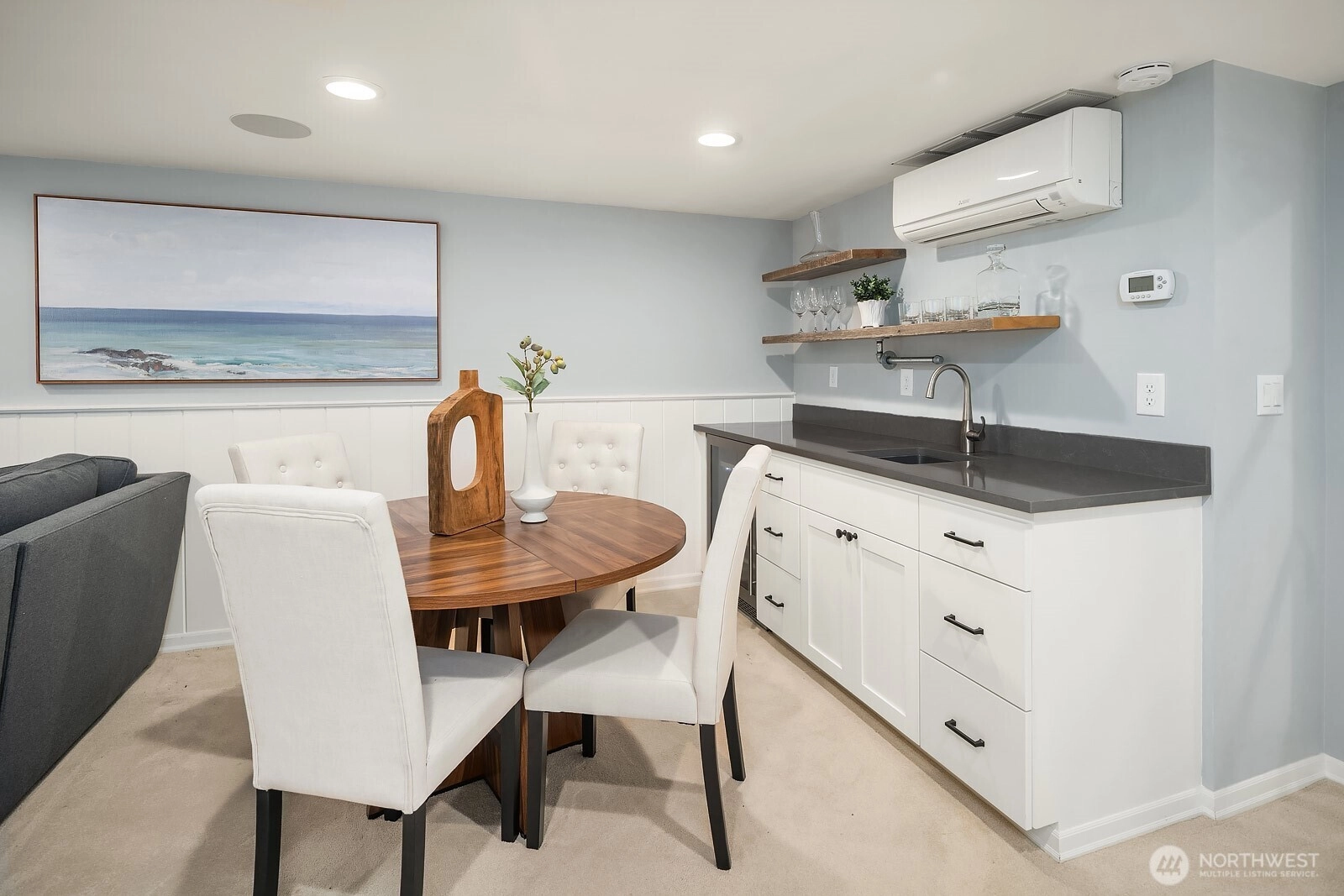 Contemporary updates blend w/ mid-century elegance in this Belvedere Terrace home, perfectly situated on an expansive, sun-drenched lot. The living room, bathed in natural light from its floor-to-ceiling windows, is anchored by a marble fireplace & rich hardwood floors. The dining room seamlessly opens to an inviting deck, ideal for entertaining. The kitchen is equipped w/ SS appliances, brushed brass hardware, & Corian countertops. Three generous bedrooms & an updated bath complete the main. The lower level offers a private retreat, including a remodeled family room w/ wet bar, a nonconforming bedroom or office, a second marble bath, a laundry room & a one-car garage. Soak in NE Seattle living w/ territorial views in this ideal location!