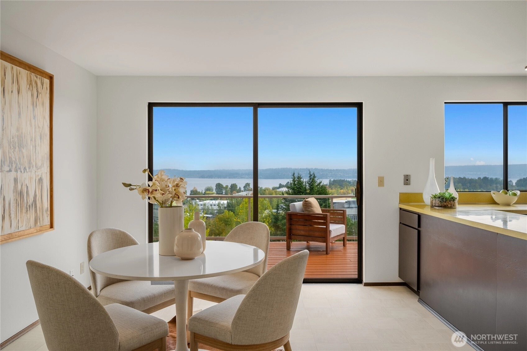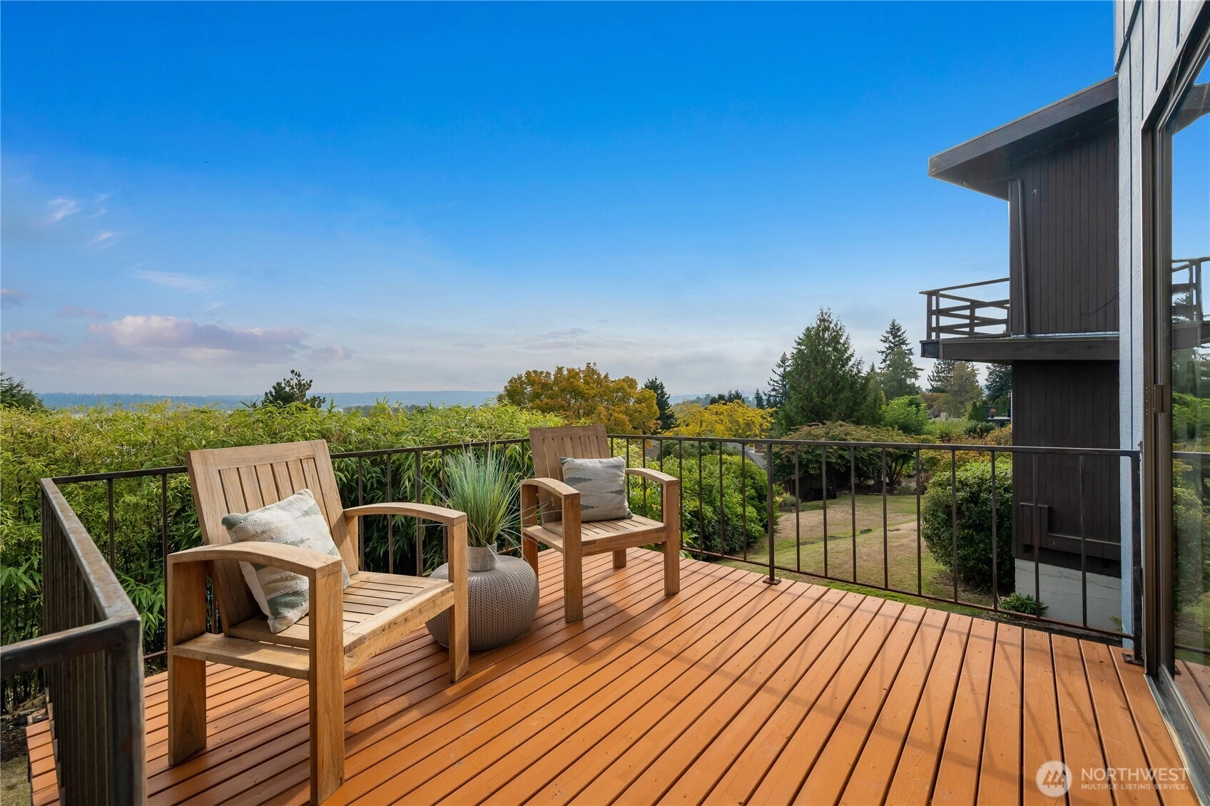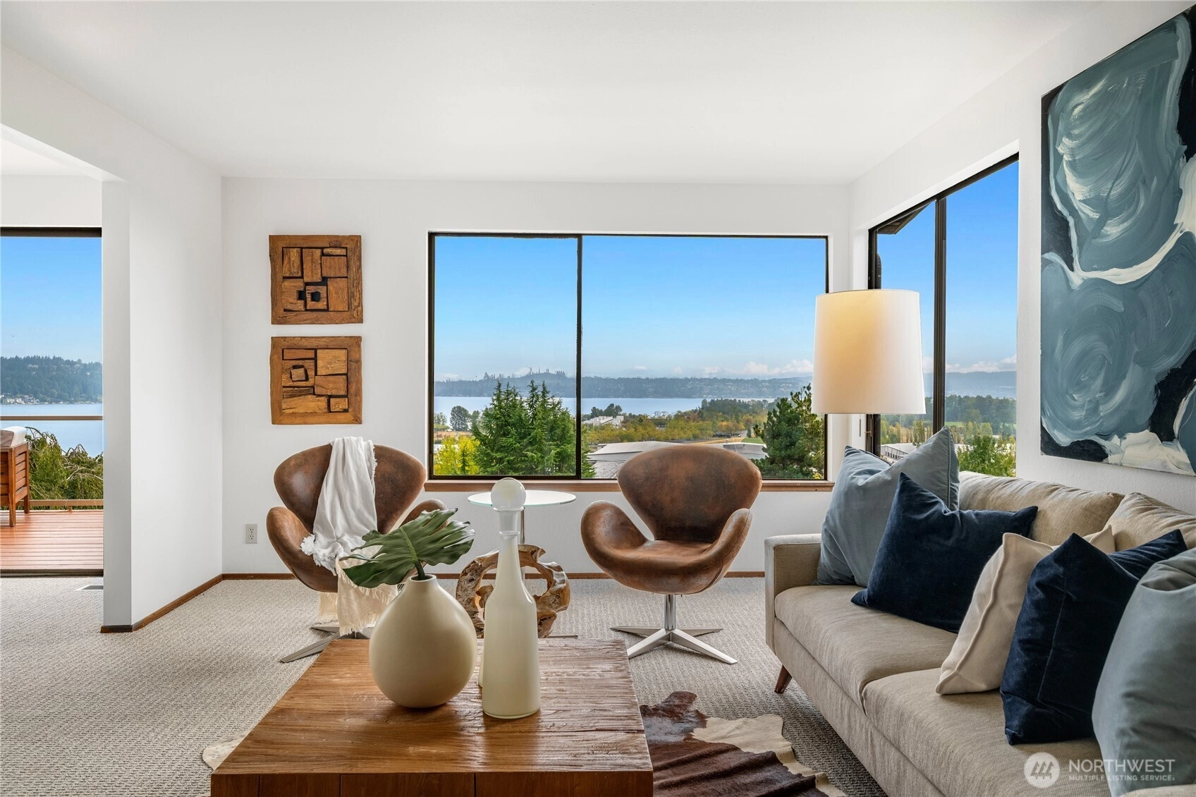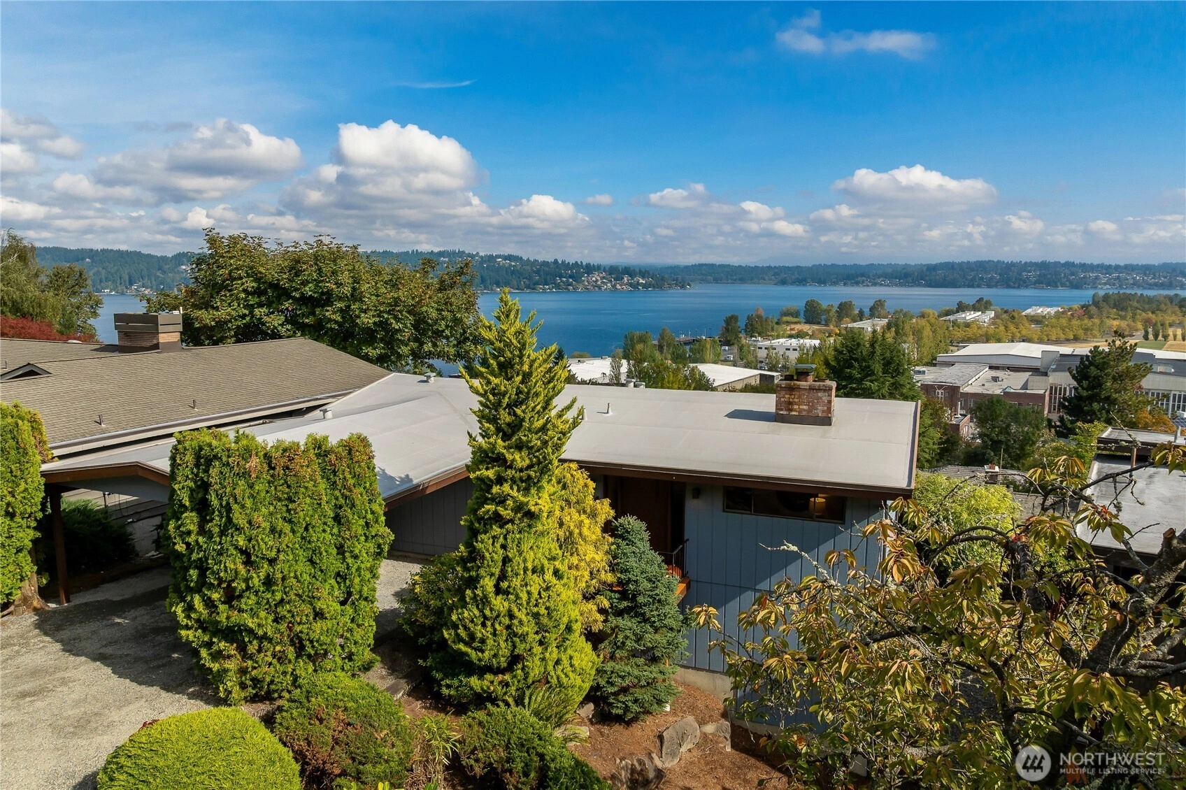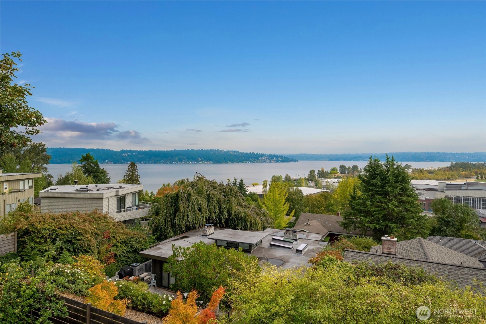 Grab a front row seat to the splendor of the Northwest! Generous windows embrace the main living areas of this 1968 custom home, filling the rooms with light. Wake to striking panoramic sunrise views over the lake and to the mountains, watch the seasons take hold, the glow of autumn paint the trees, and bright clouds roll across the sky. The open flow provides ample space for dinners and kitchen dance parties, for work and workouts, and a flexible footprint in which to shape the home of your dreams. The main floor primary has a sense of privacy and retreat, with four more bedrooms on the lower level as well as a family room. This home has an active transferable membership in the View Ridge Swim & Tennis Club located just down the street.