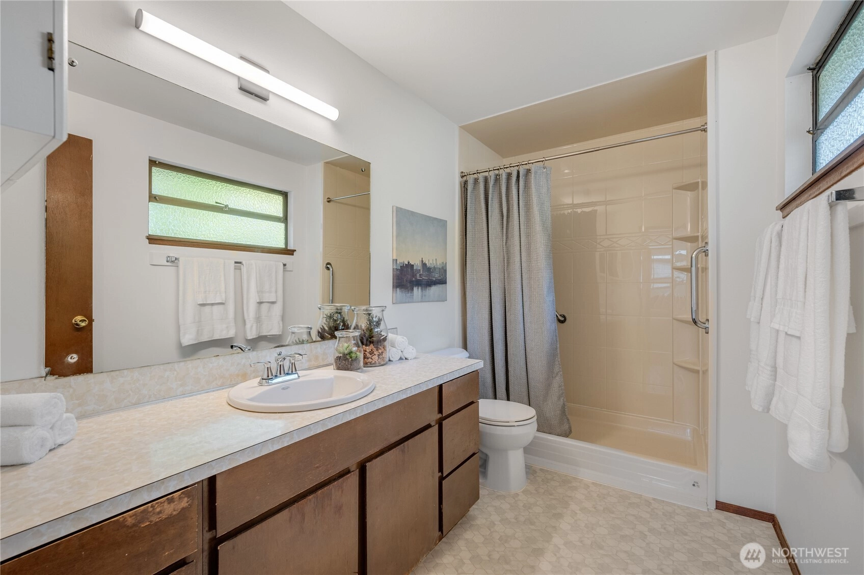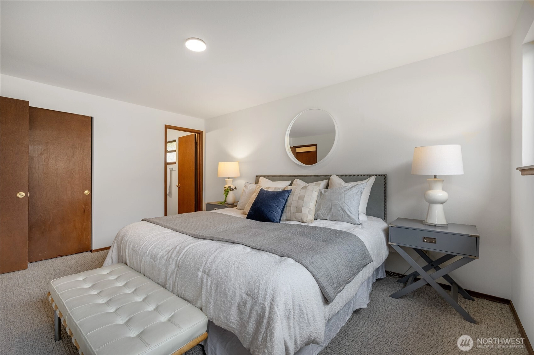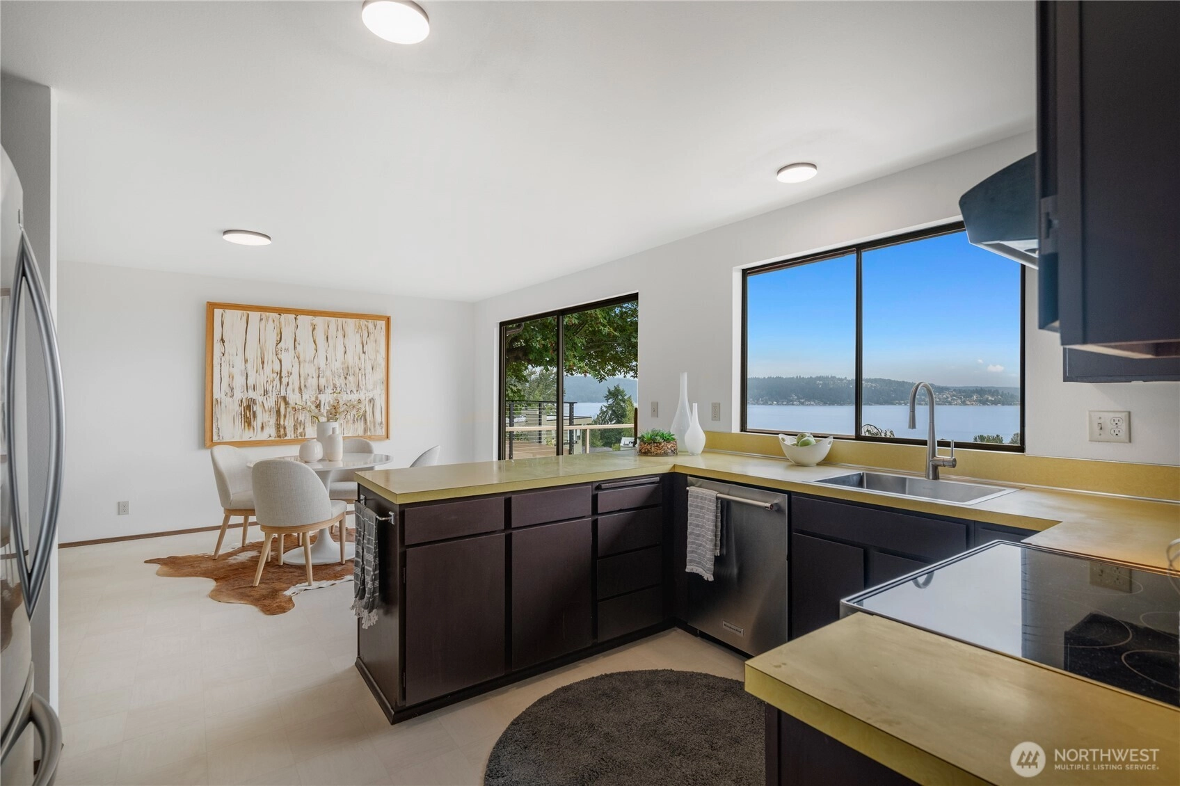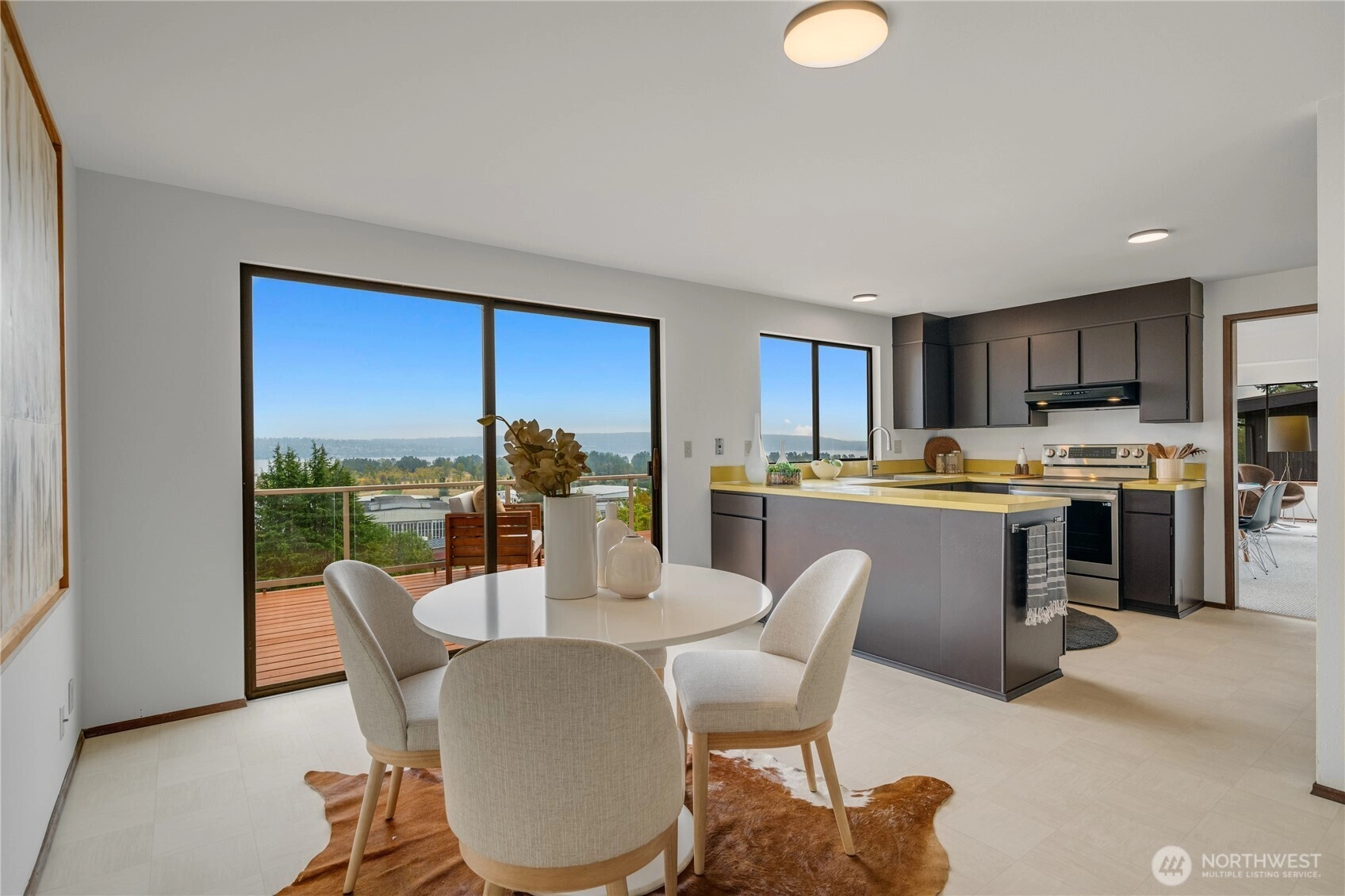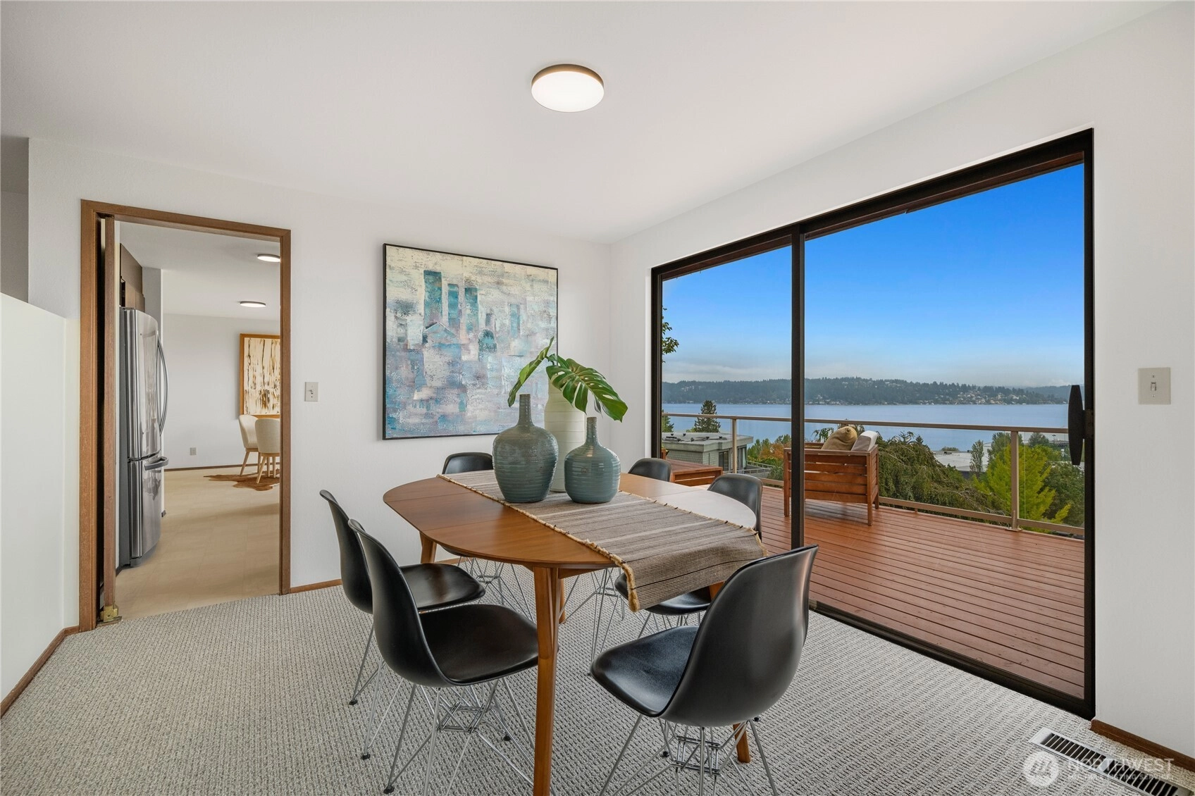 Grab a front row seat to the splendor of the Northwest! Generous windows embrace the main living areas of this 1968 custom home, filling the rooms with light. Wake to striking panoramic sunrise views over the lake and to the mountains, watch the seasons take hold, the glow of autumn paint the trees, and bright clouds roll across the sky. The open flow provides ample space for dinners and kitchen dance parties, for work and workouts, and a flexible footprint in which to shape the home of your dreams. The main floor primary has a sense of privacy and retreat, with four more bedrooms on the lower level as well as a family room. This home has an active transferable membership in the View Ridge Swim & Tennis Club located just down the street.
