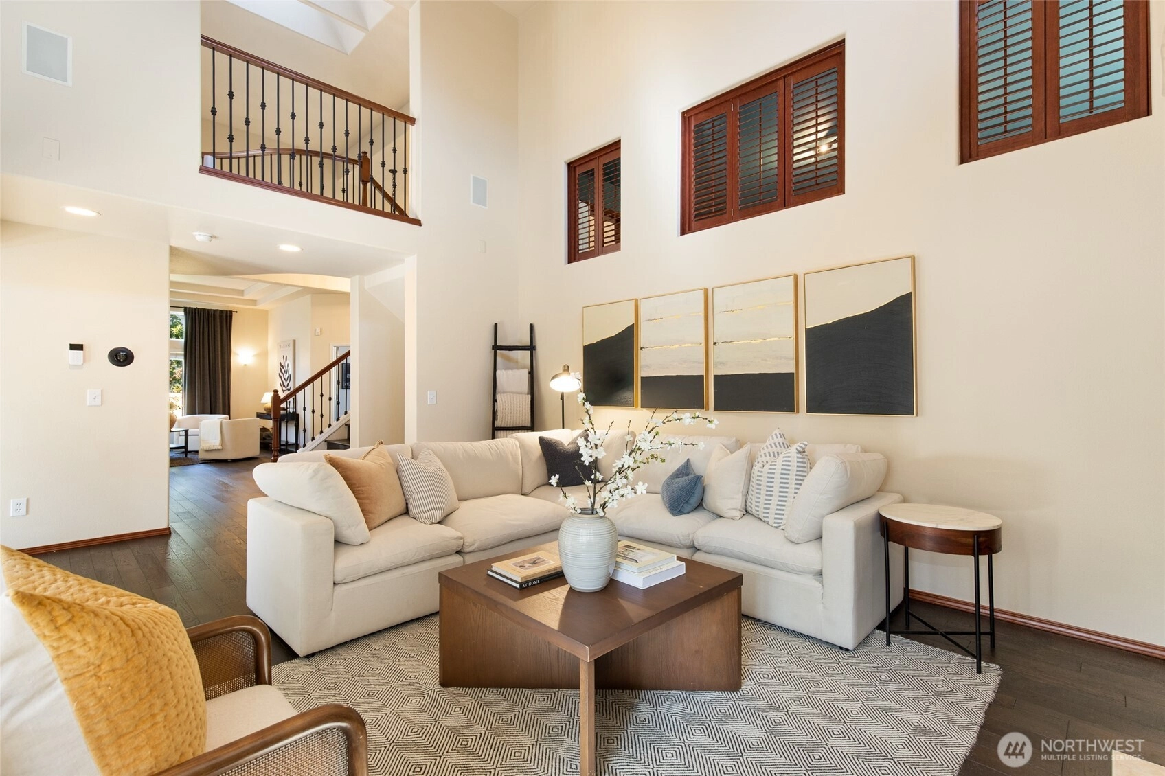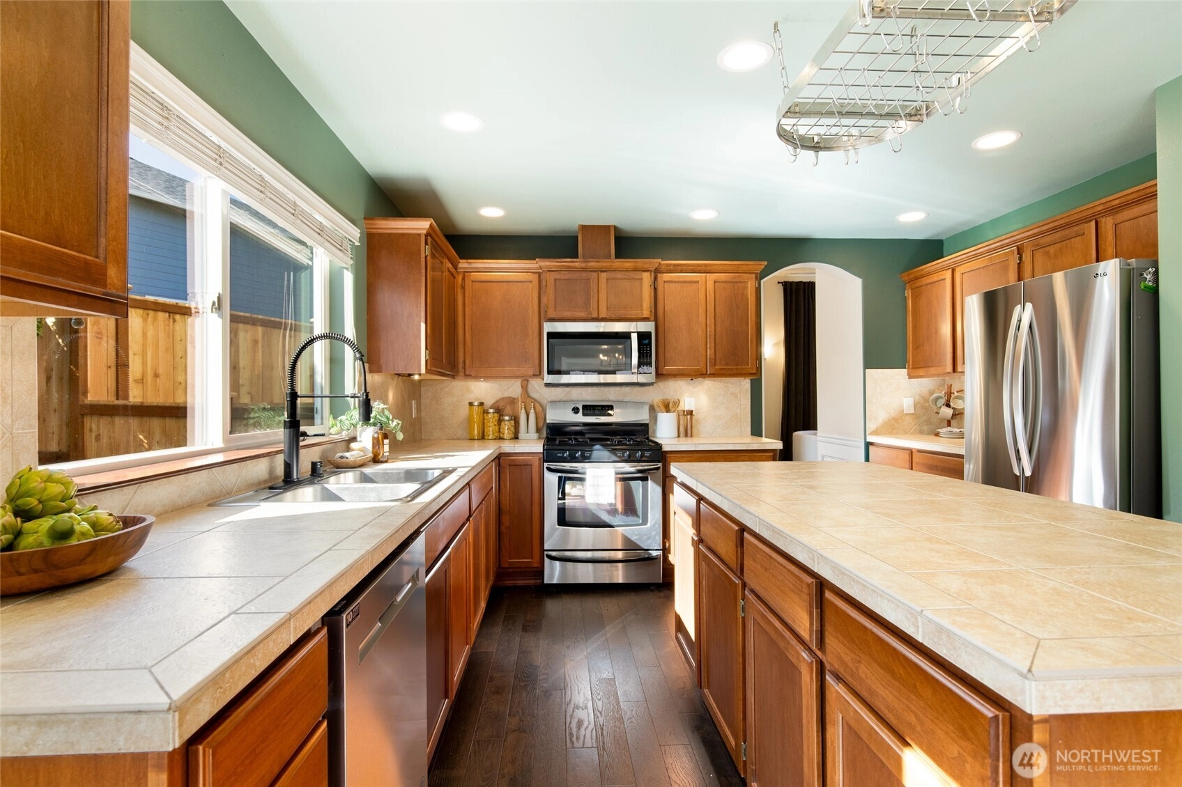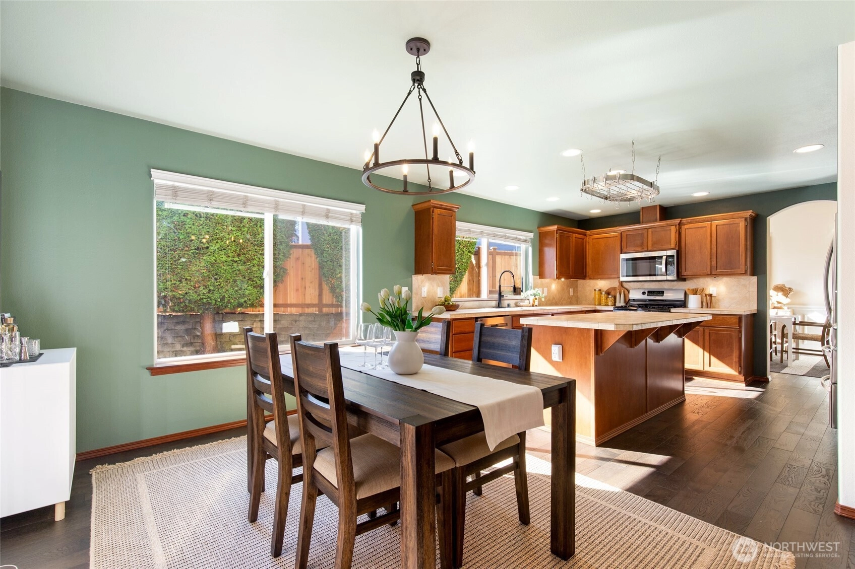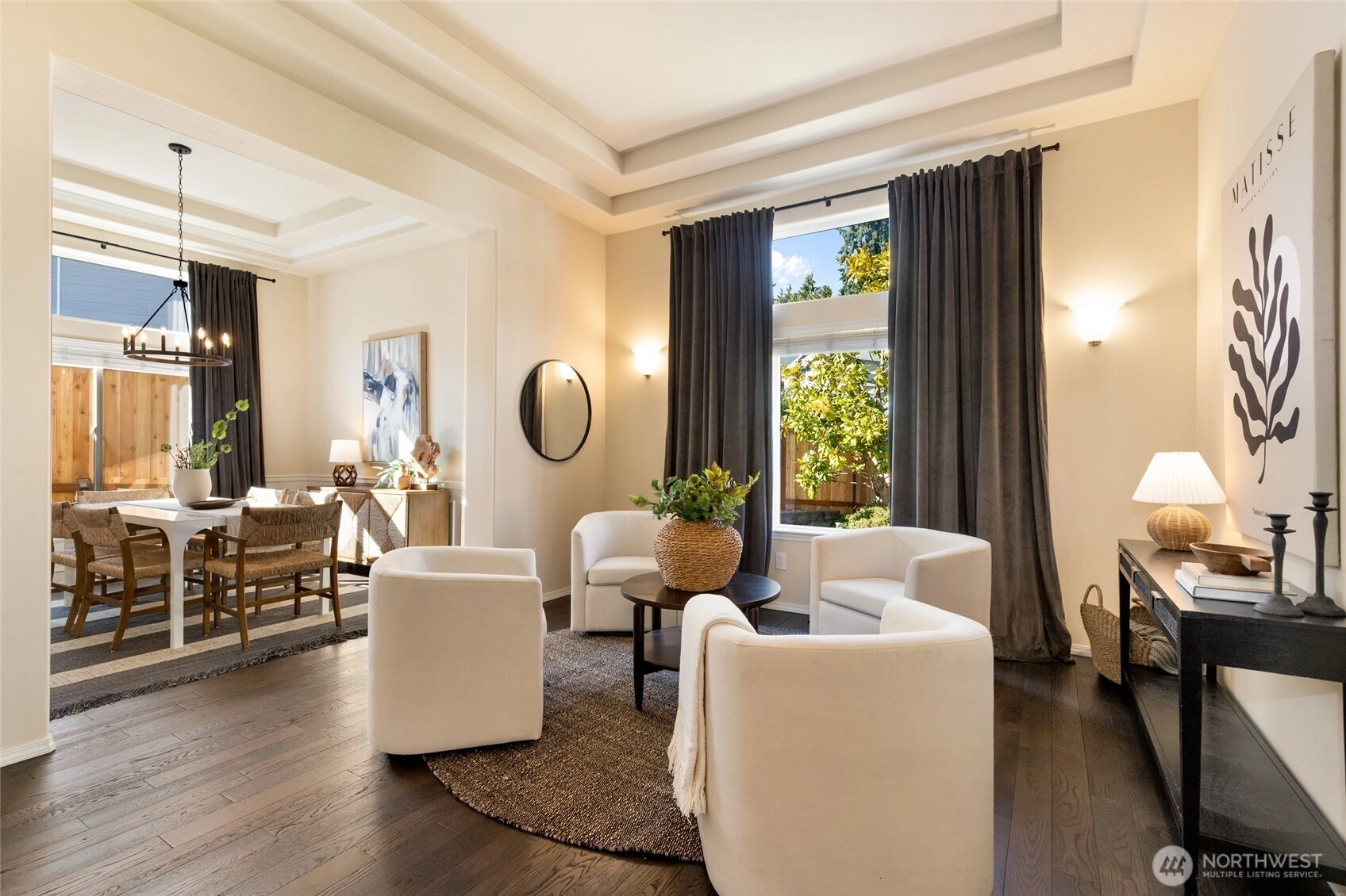 Step inside & be welcomed by a grand entry w/vaulted ceilings & lux dark walnut floors, setting the tone for this stunning 2,700 sq ft 2-story home. The spacious kitchen is designed for entertaining, featuring a large island, & updated S/S appliances. Enjoy your morning coffee or unwind in the evening on the covered back deck. The main floor offers formal living & dining rooms w/elegant coffered ceilings, a family room w/built-in speakers, high-efficiency AC heat pump & office. A custom floor plan includes 2 bedrooms, a full bath, & bonus room on the mid-level, w/a private primary suite upstairs. A huge 3 car garage finishes out this home. Situated on a quiet cul-de-sac, Moments to Mill Creek Town Center & freeways. This home is a must see!