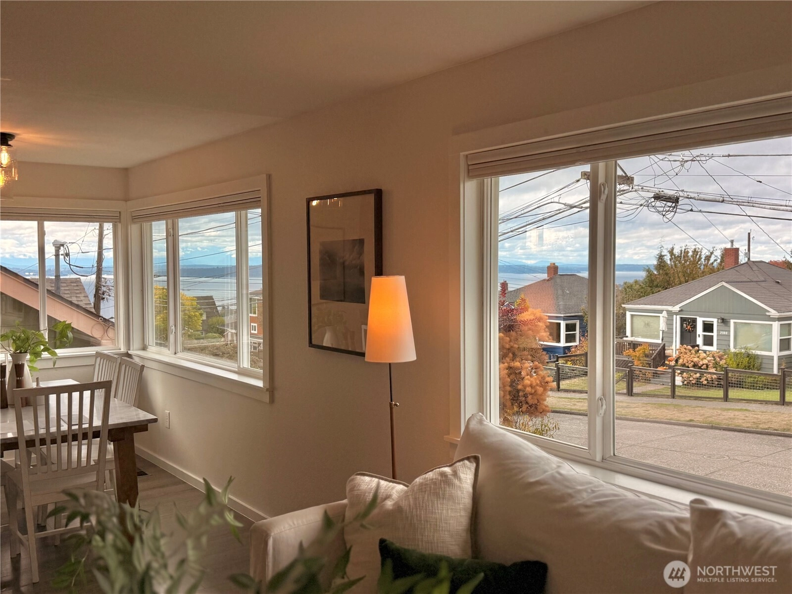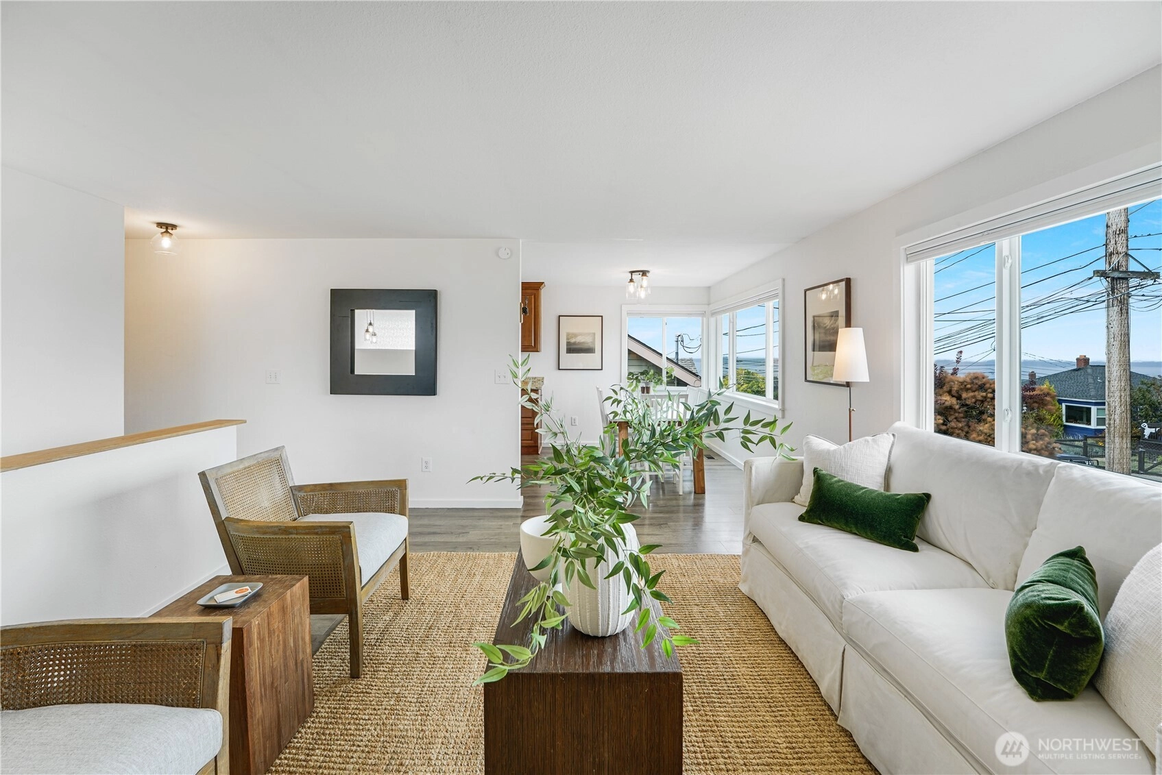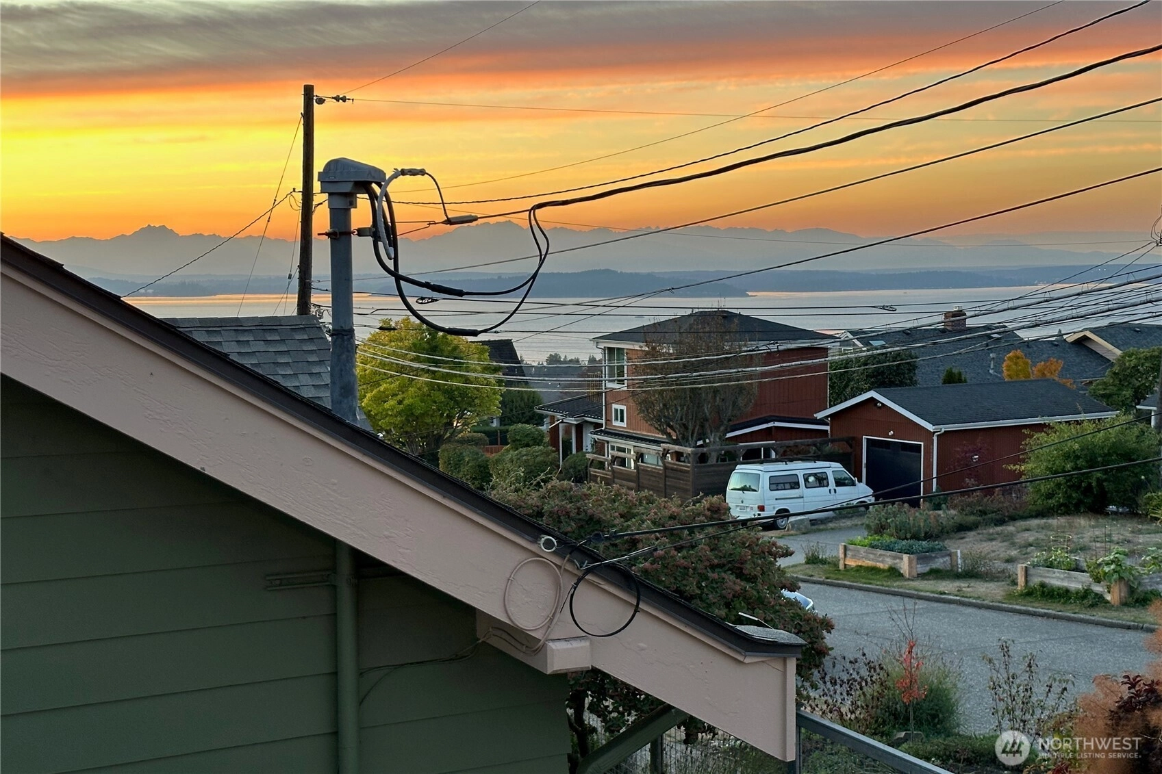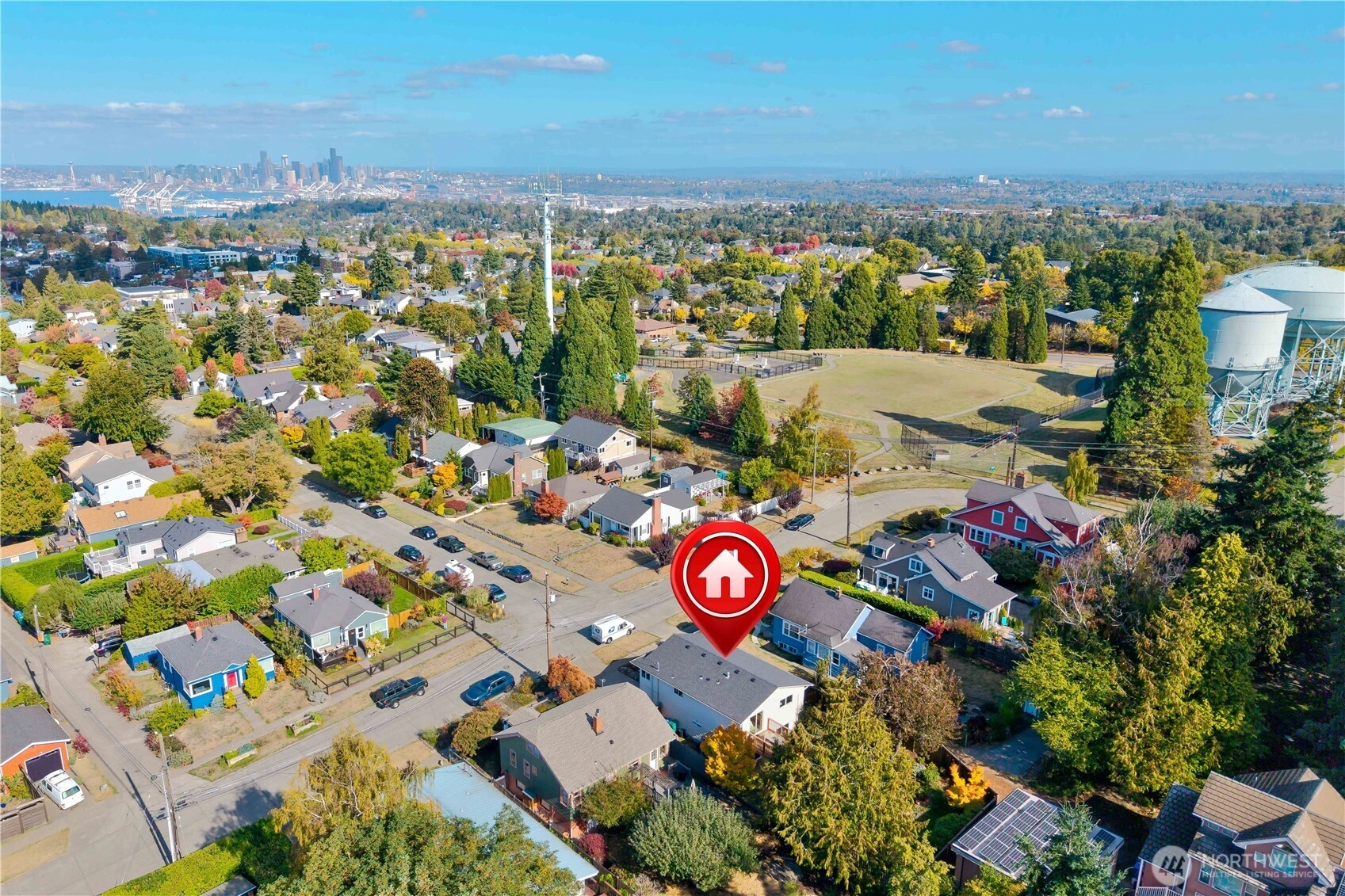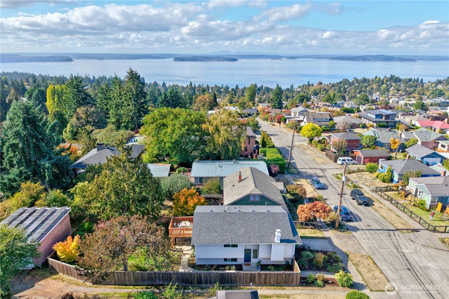 Perched atop desirable Gatewood Hill just a block from Myrtle Reservoir Park, this beautifully updated home enjoys abundant natural light and views of the Puget Sound and Olympics. The open living and dining area with a wood-burning fireplace connects seamlessly to the updated kitchen and baths, with 3 bedrooms on the main level. The lower level features a spacious bedroom, full bath, rec room, and large utility/storage area with walk-out access to the dreamy, fully fenced backyard. Covered patio, attached garage, newer roof, furnace, and panel complete this gem on a picturesque street and generous lot. Welcome home.