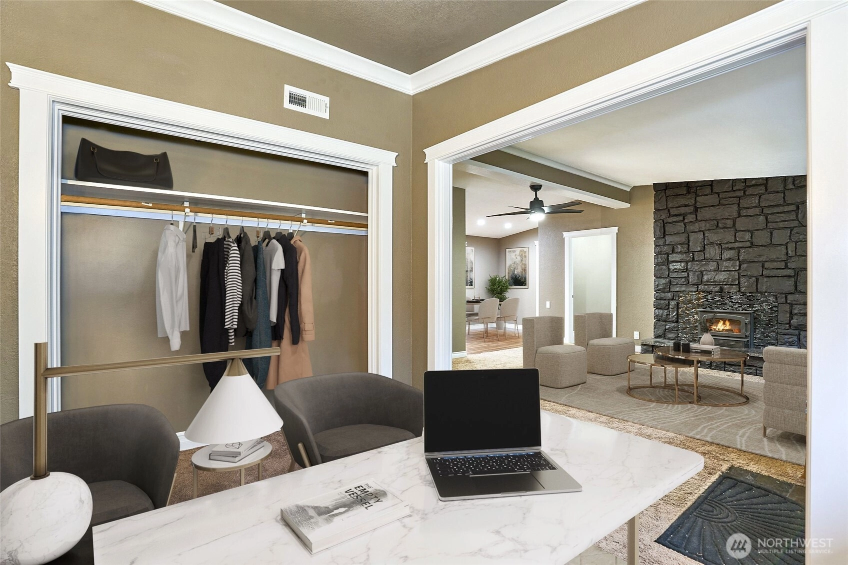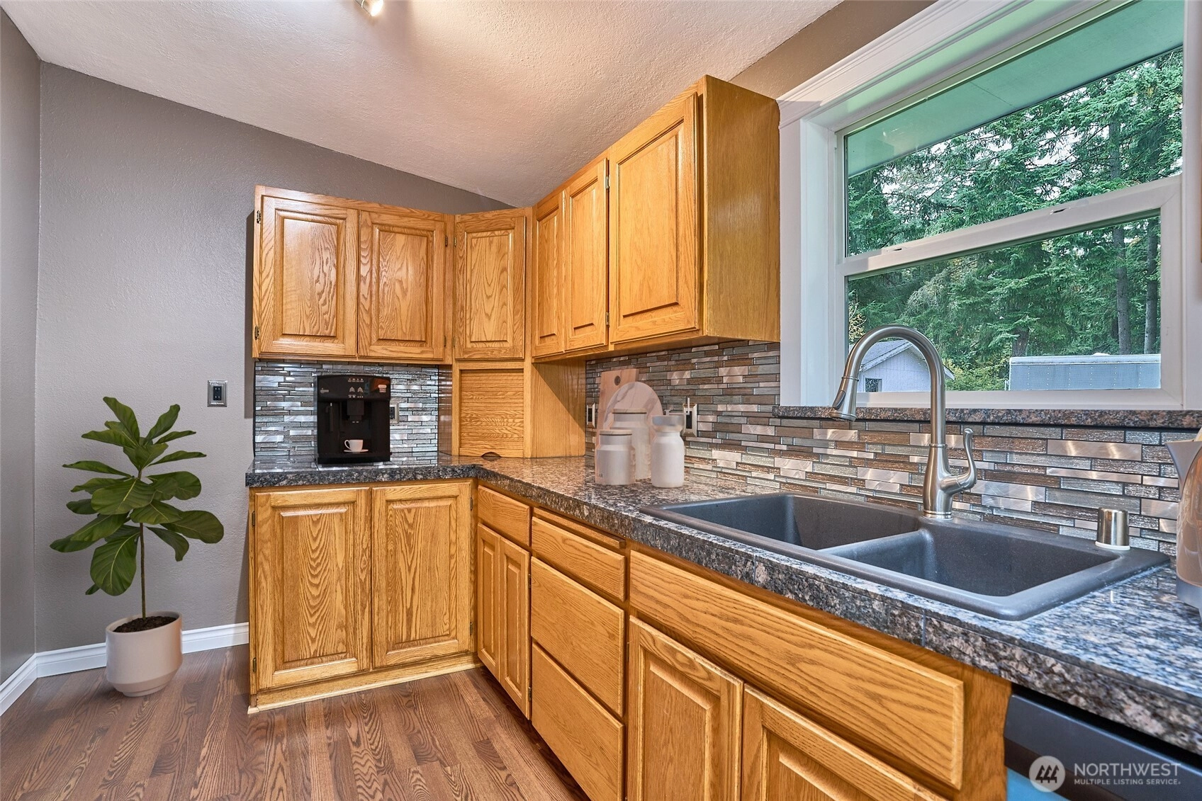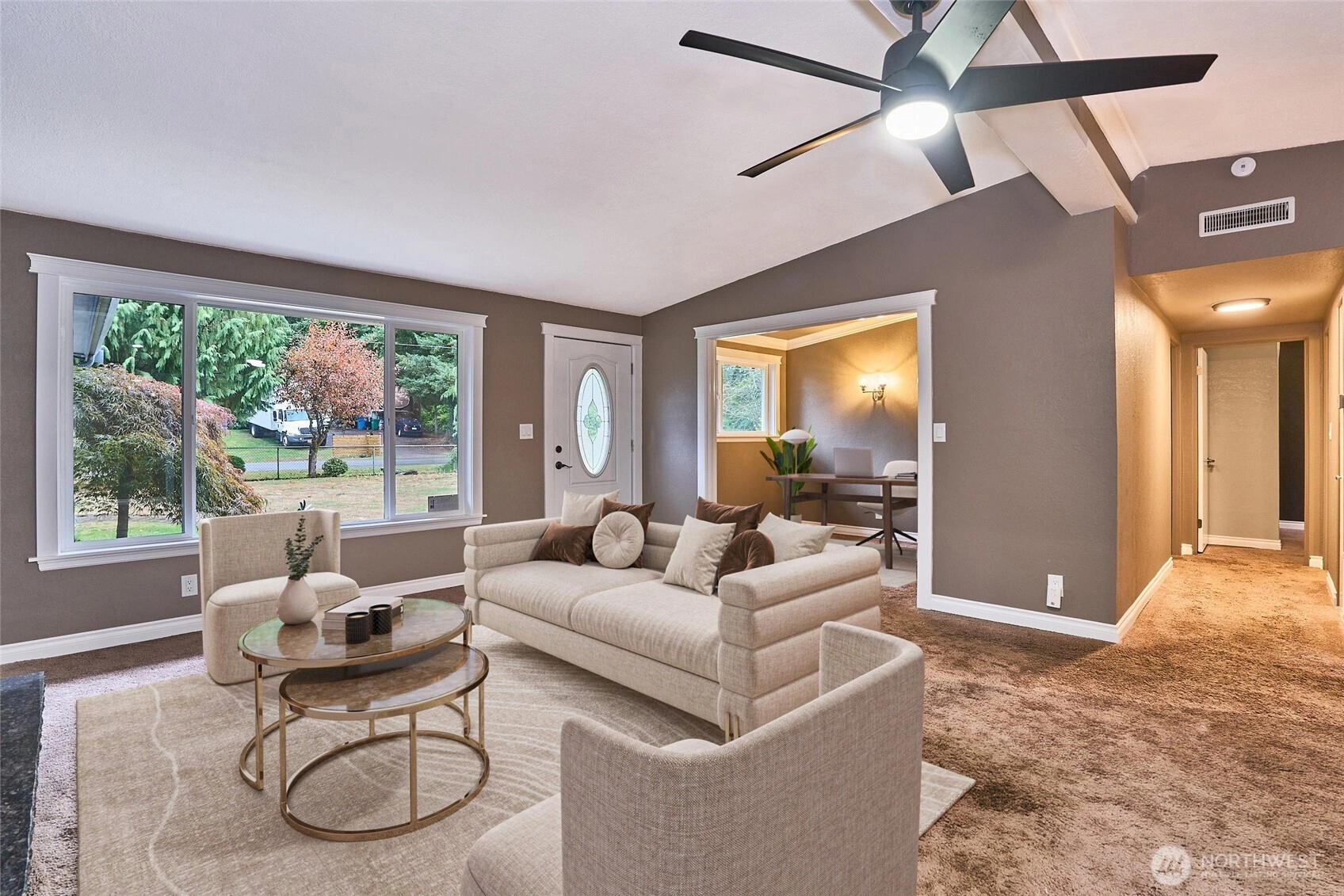 Beautiful spacious rambler with attached two car garage. One acre lot. Single level living with 3 bedroom, 2 full bath and bonus den/office. Open floor plan with vaulted ceilings. Living room with wood insert. Kitchen with granite countertops and newly finished oak cabinets. Large primary bedroom with built-in electric fireplaces. Luxury en-suite with walk in mosaic tile shower with four sprayers and deluxe closet. Two additional bedrooms and updated full bath. Metal roof and new exterior paint with cedar siding. New vinyl windows. Great street appeal with manicured front yard. Fenced front and side yard. Plenty of guest parking. Quiet neighborhood and conveniently located near amenities at Benson, Cascade and Fairwood.