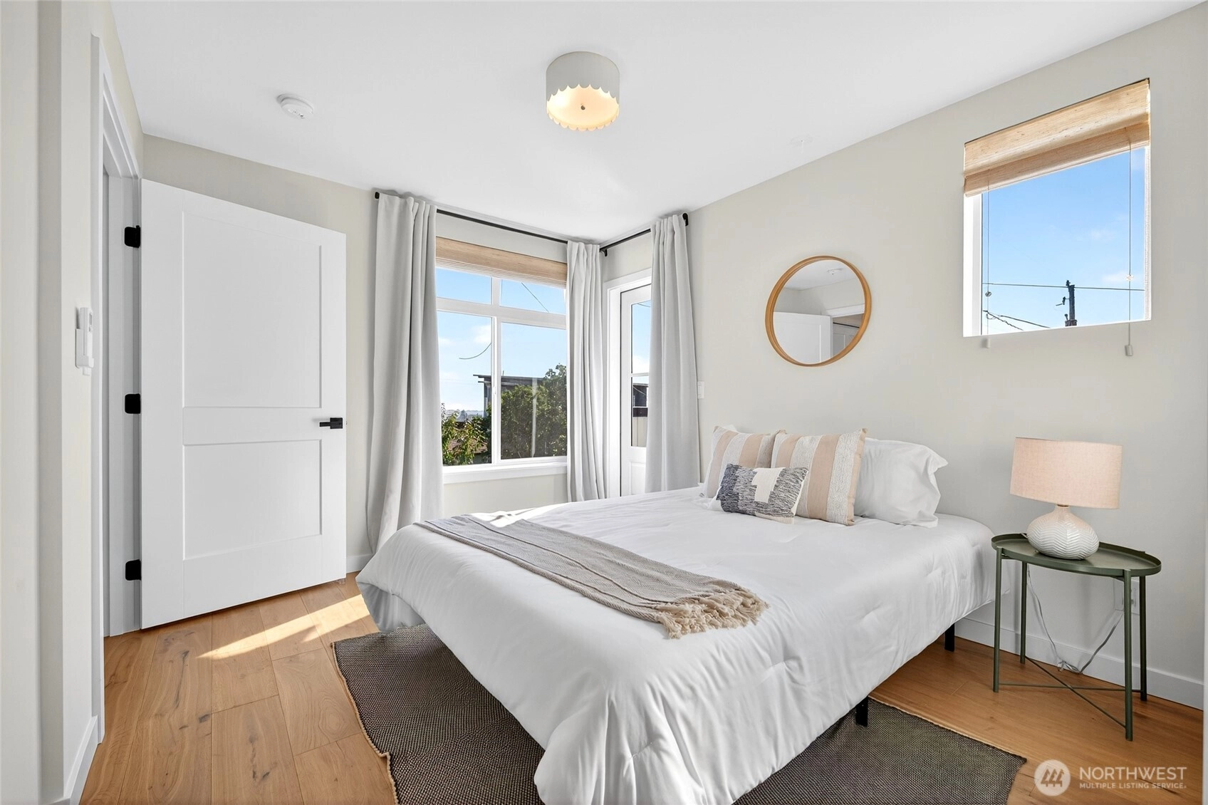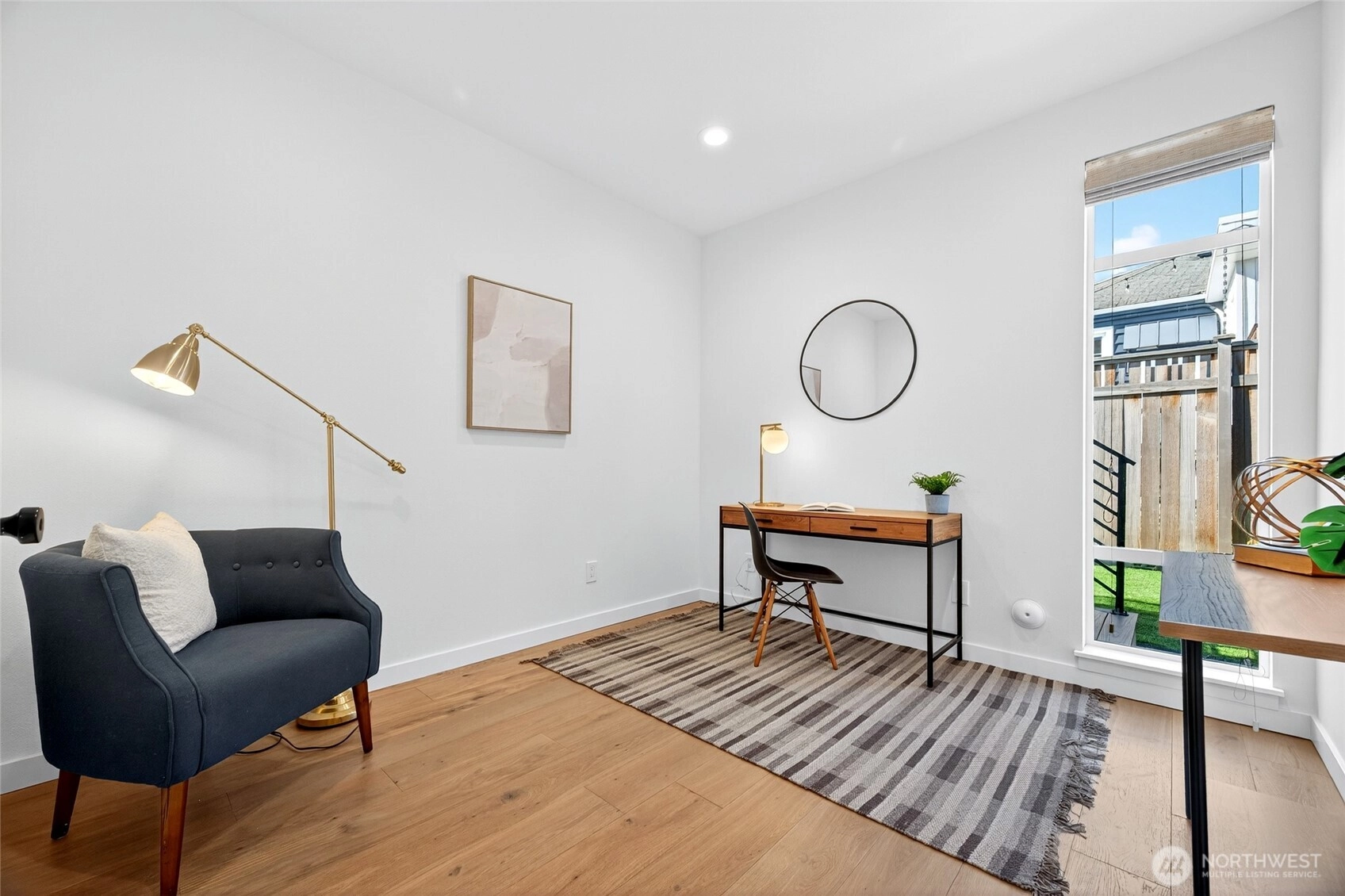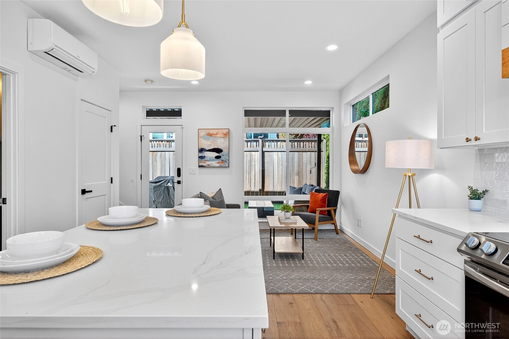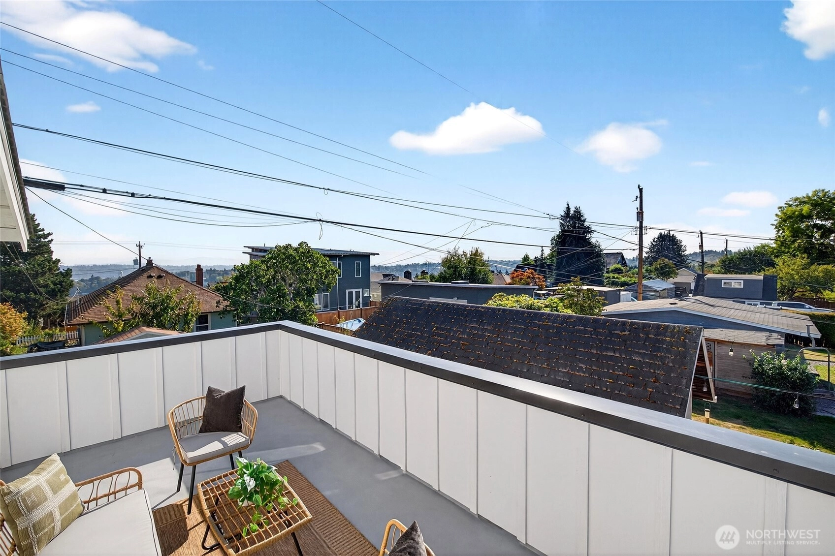 Featuring skyline views from the primary bedroom and Mt. Rainier views from the roof deck, this custom-built and designed home checks all of the boxes! Nine-foot ceilings on the main floor with shaker cabinetry, quartz counters, and pantry space. Private, backyard oasis complete with a pergola, heater, and turf for year-round enjoyment. Wide plank engineered hardwoods throughout. Vaulted ceilings in the primary bed with a walk-in closet, heated tile flooring, en-suite bath & sun-soaked windows. Main floor office/den/gym adds flexibility. Heated garage is equipped with an EV charger. Accessible commuting location, easy access to downtown, HWY 99, I-5, bus stops, and a 1/2 mile from the proposed West Seattle "Avalon" light rail station.