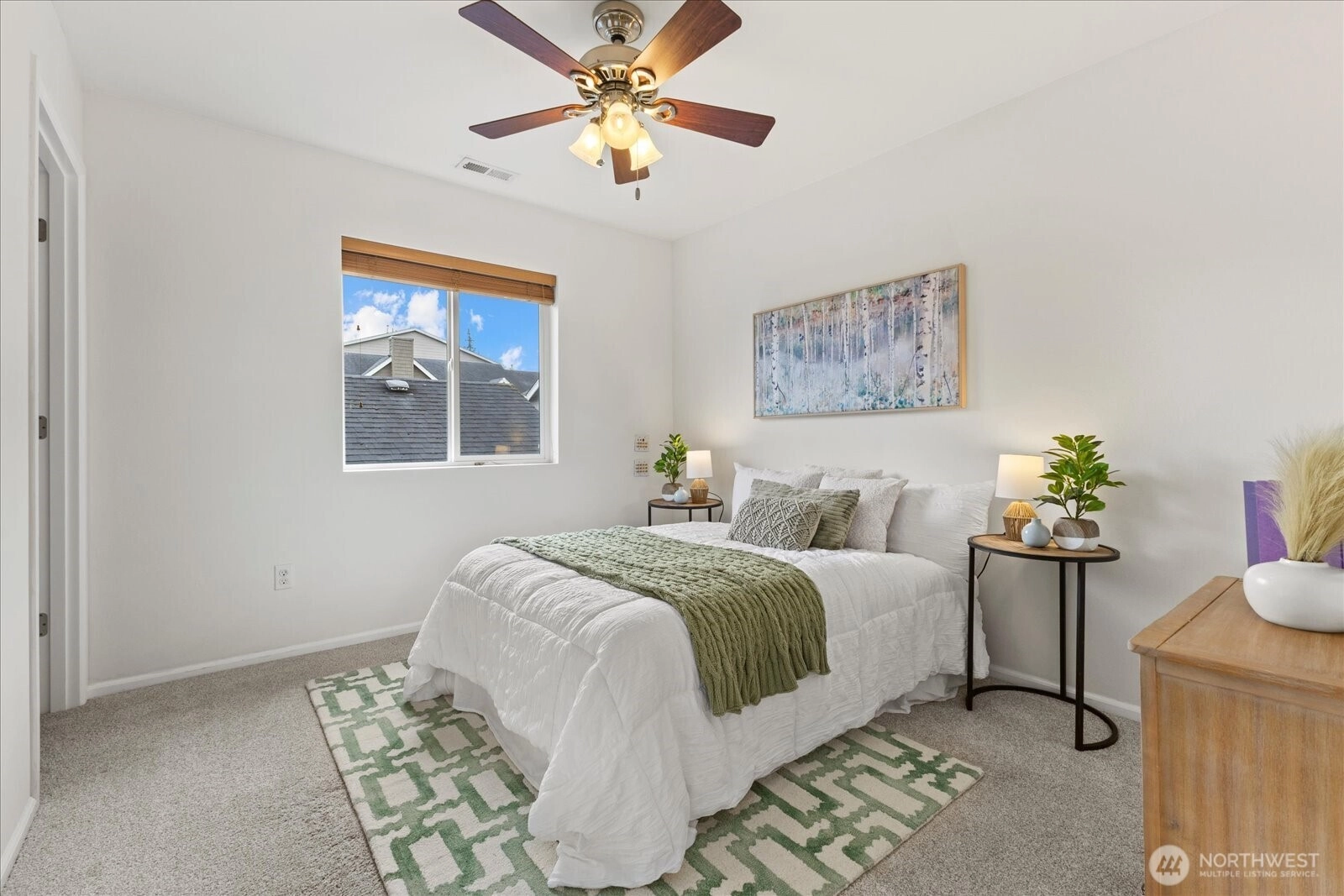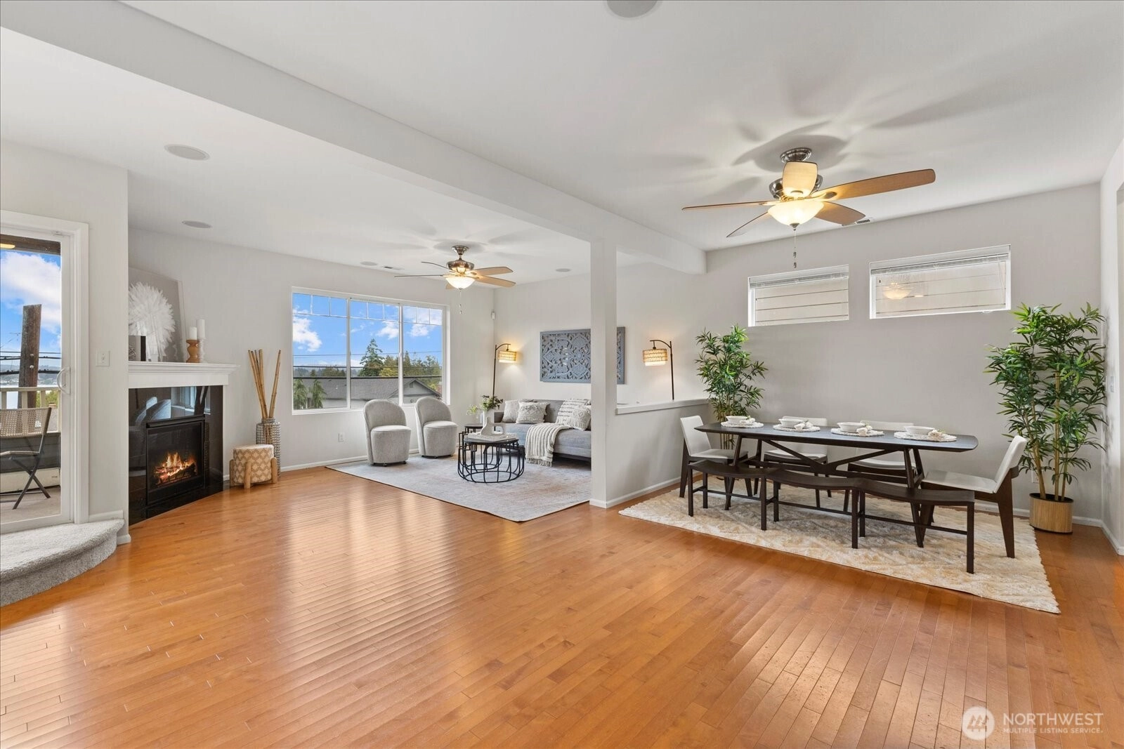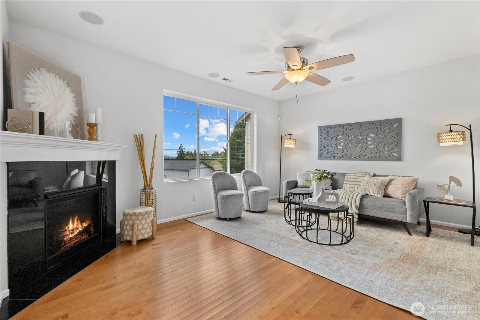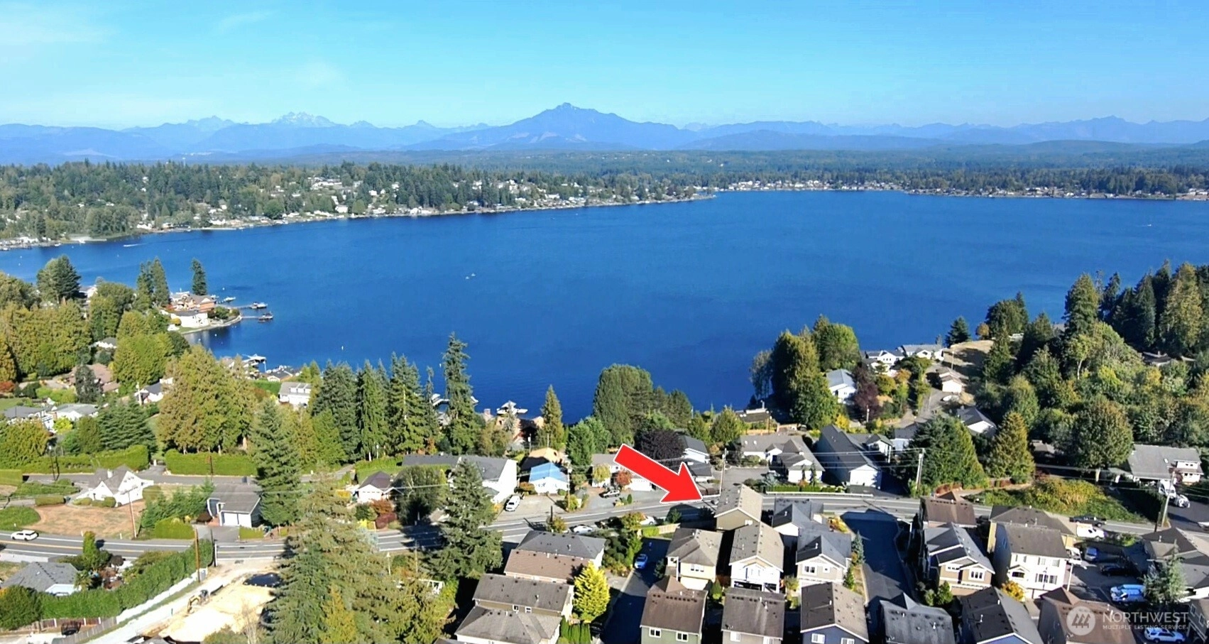 Lake Views! This 1,960 sq. ft. Lake Point home is perfectly placed to capture some of the best vistas in the neighborhood. The open great room with corner fireplace flows to a covered deck overlooking Lake Stevens. The kitchen features granite tile counters, Samsung appliances, and a breakfast bar. Upstairs, the primary suite offers a spa-inspired bath and walk-in closet. Central A/C, hardwired surround sound, new water heater installed in 2024, and a serviced furnace ensure comfort. A private driveway, oversized garage, and fully fenced patio complete this exceptional property—just minutes to Frontier Village and Lundeen Park.