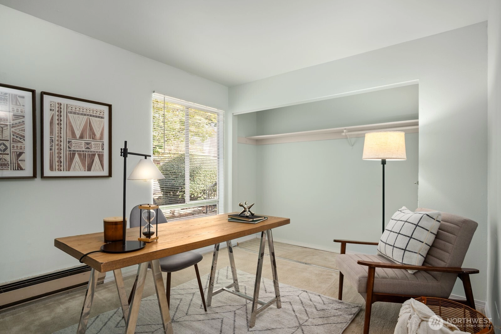 This charming ground-floor condo offers an ideal blend of comfort and character. You'll be immediately greeted by a bright kitchen with a convenient pass through, allowing for a view to the living area and lovely breakfast bar. Centered in the living space is a gorgeous floor-to-ceiling, wood burning stone fireplace, perfect as a statement piece and a cozy necessity in cooler months. Right off the main area you will find a full bathroom which is functionally located between both generous sized bedrooms. Throughout the space, large windows invite natural light while the ground level location offers easy access. If you're looking for a quiet residence that is also steps away from major grocery stores, don't miss your chance!