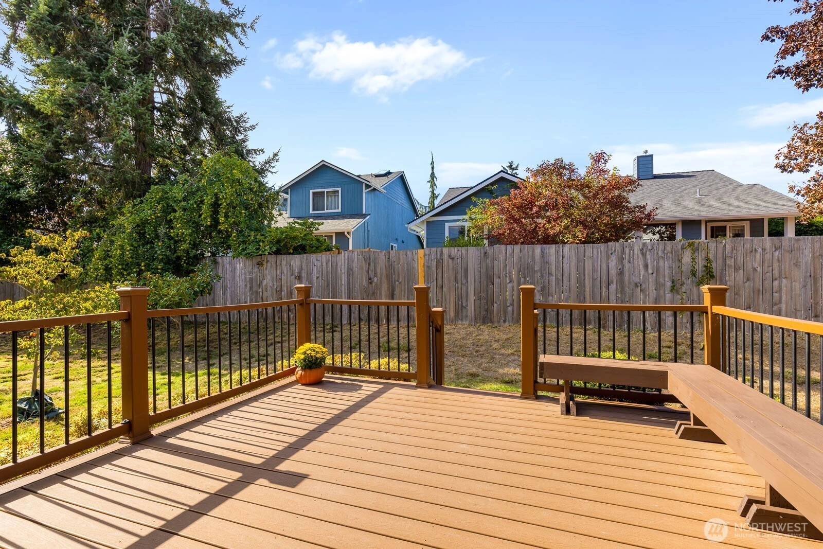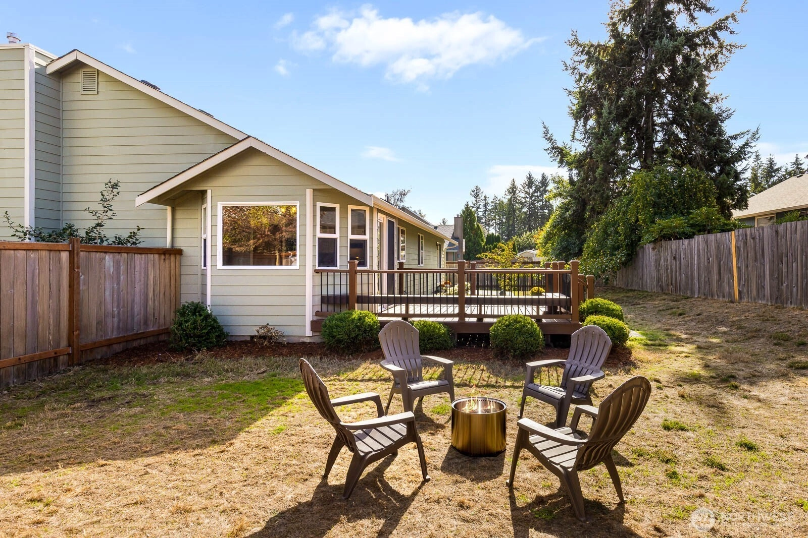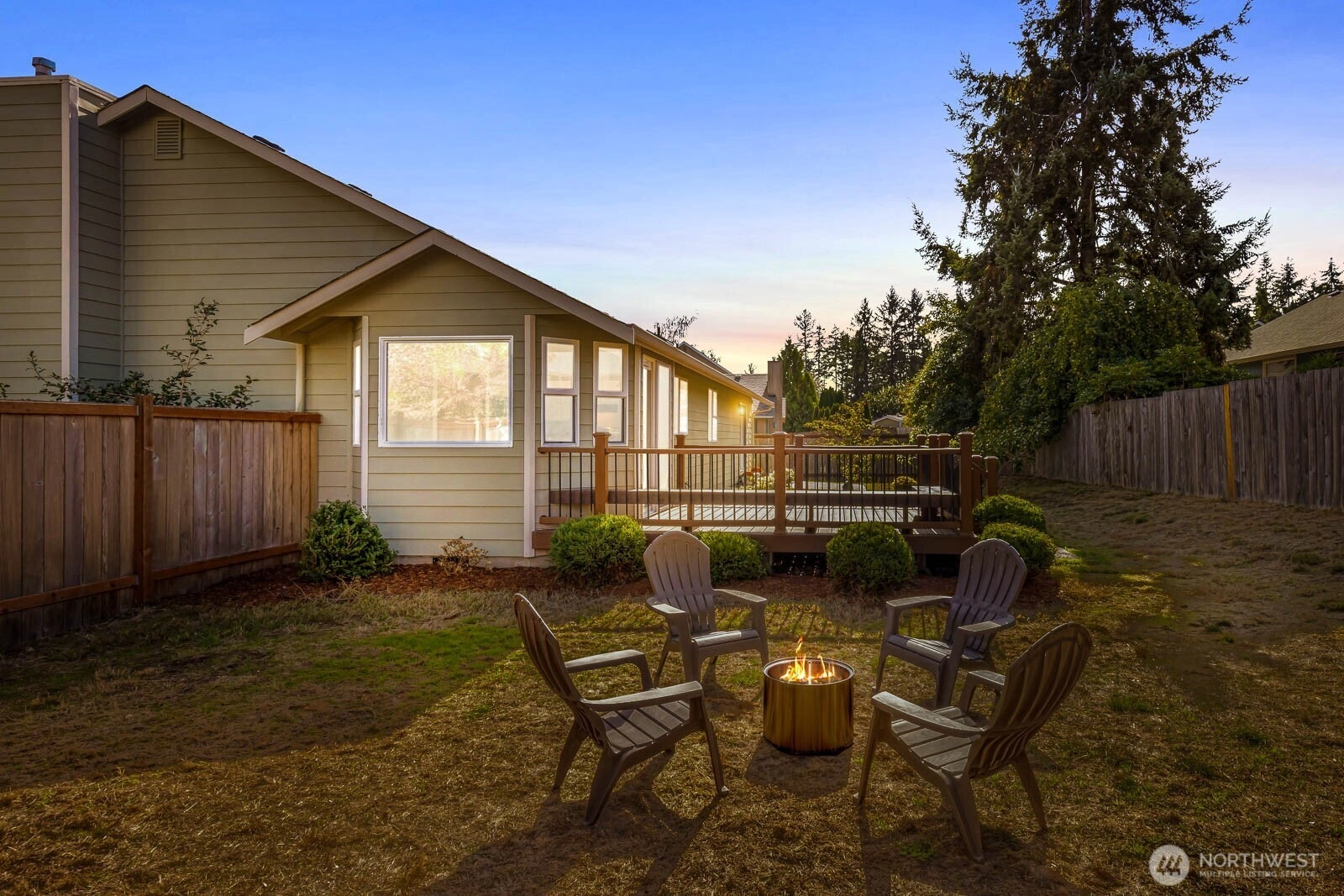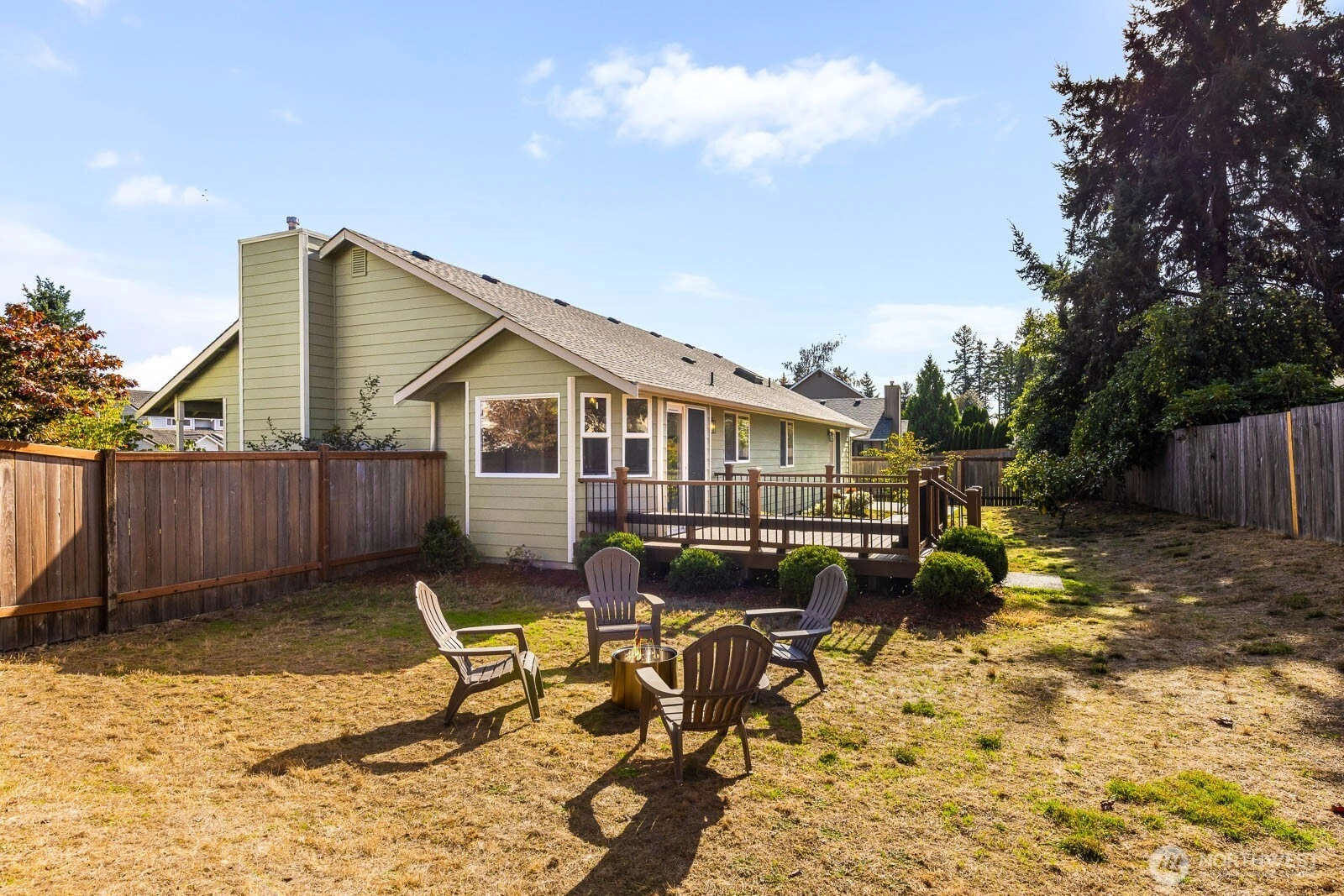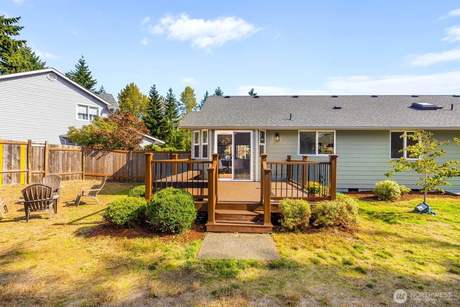 Welcome to this beautifully updated 3-bedroom, 2-bath rambler tucked in a peaceful Lacey cul-de-sac across from neighborhood trails and a park—perfect for walks and playtime. Inside, enjoy vaulted ceilings, a cozy fireplace, and a bright kitchen with new luxury quartz countertops. Thoughtful updates include modern fixtures, fresh paint inside and out, and new bathroom vanities. The spacious primary suite offers a walk-in closet, ensuite bath, and private patio to the backyard. Relax or entertain on the large Trex deck overlooking an expansive fully fenced backyard. Enjoy fruit trees and moments around the fire pit! New furnace & A/C (2021) and large 2-car garage with 10' ceilings and ample storage. Located 15 mins to DT Olympia & JBLM.
