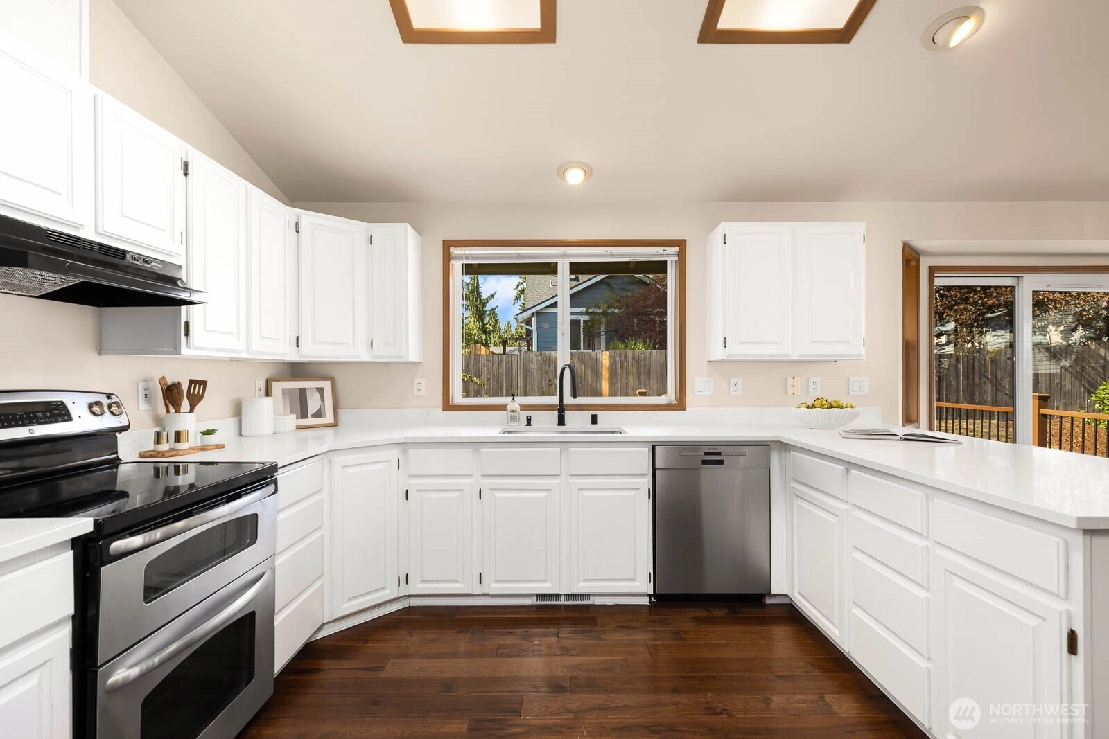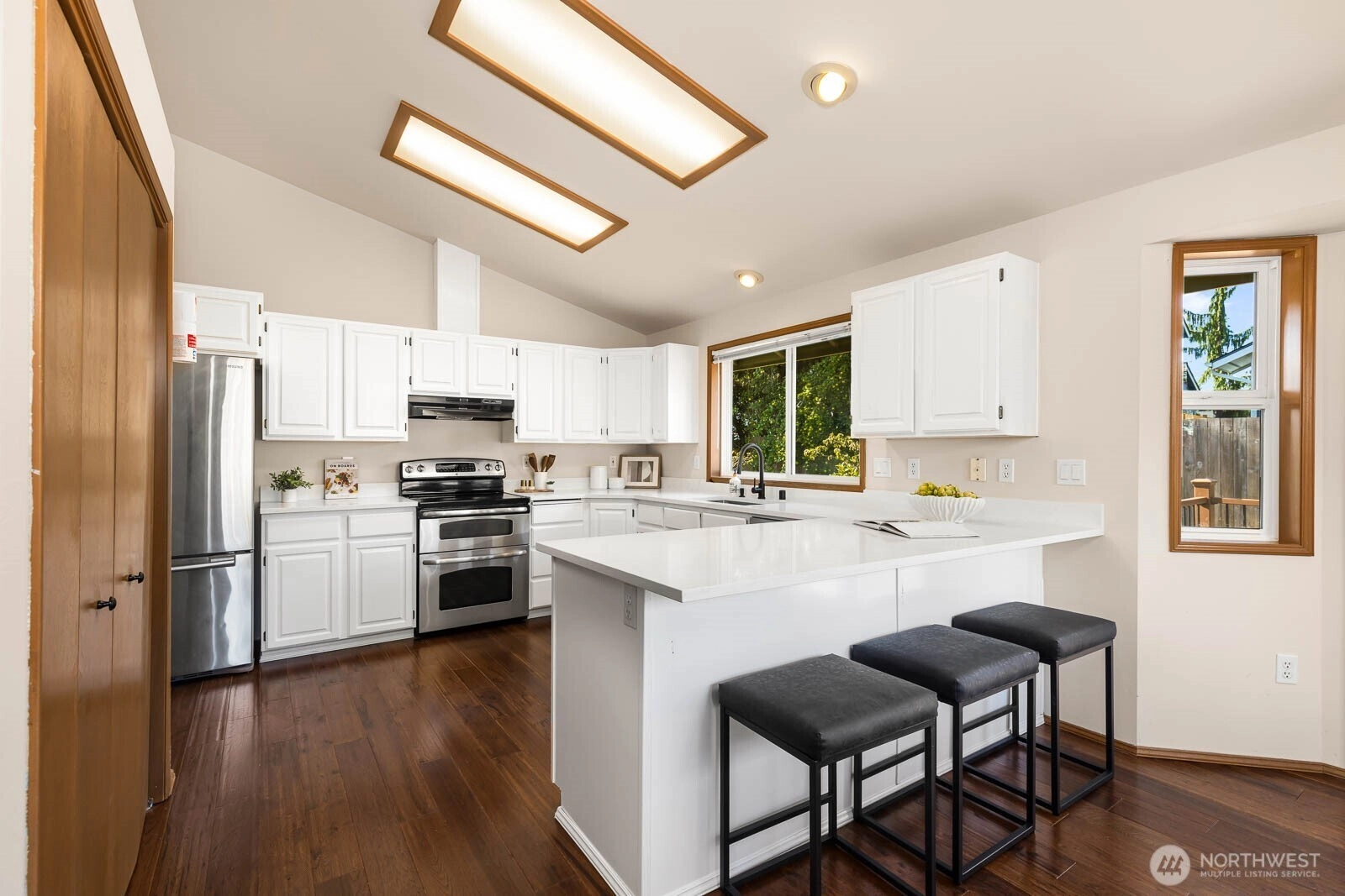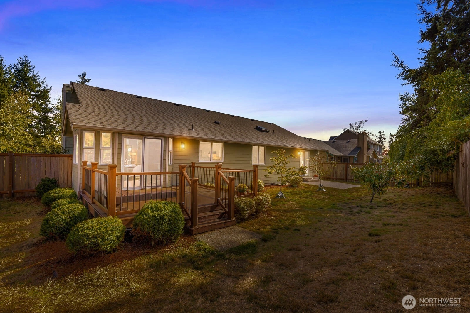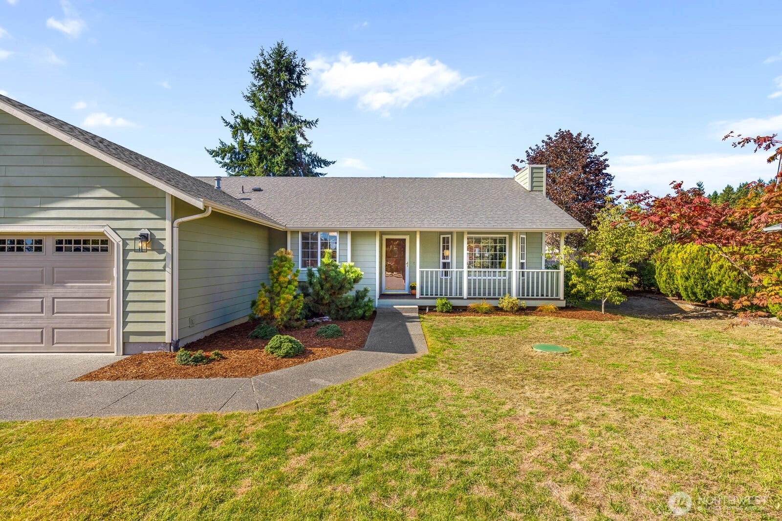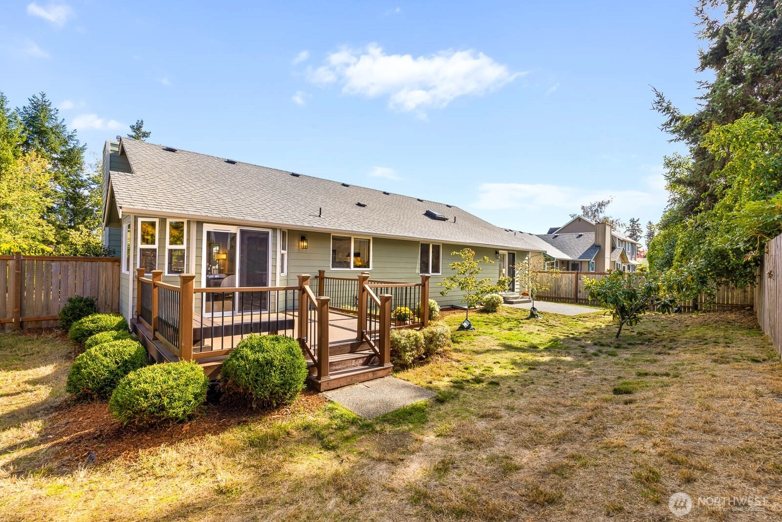 Welcome to this beautifully updated 3-bedroom, 2-bath rambler tucked in a peaceful Lacey cul-de-sac across from neighborhood trails and a park—perfect for walks and playtime. Inside, enjoy vaulted ceilings, a cozy fireplace, and a bright kitchen with new luxury quartz countertops. Thoughtful updates include modern fixtures, fresh paint inside and out, and new bathroom vanities. The spacious primary suite offers a walk-in closet, ensuite bath, and private patio to the backyard. Relax or entertain on the large Trex deck overlooking an expansive fully fenced backyard. Enjoy fruit trees and moments around the fire pit! New furnace & A/C (2021) and large 2-car garage with 10' ceilings and ample storage. Located 15 mins to DT Olympia & JBLM.