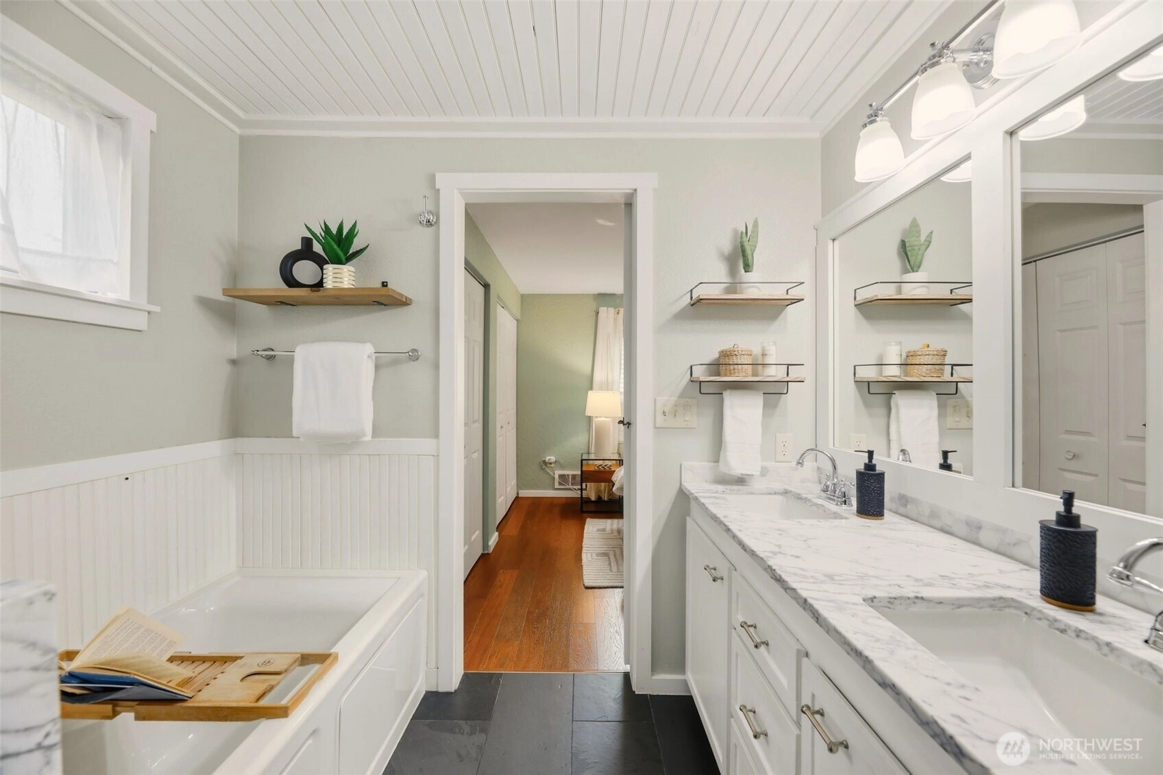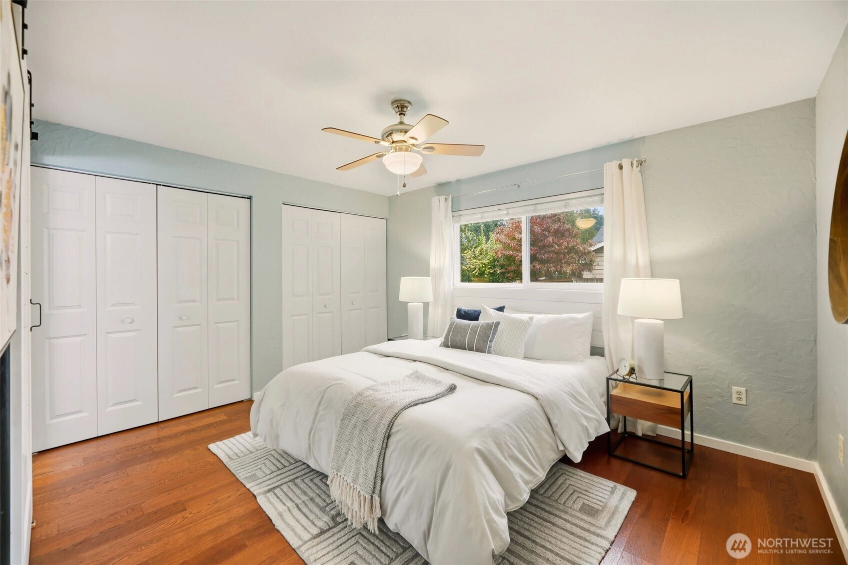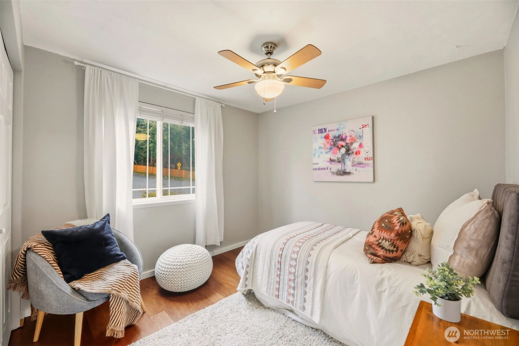Welcome Home to this beautifully updated 3-bed, 2-bath rambler in desirable Silver Firs Community. Warm natural light pours through large windows, highlighting the vaulted ceilings, open floor plan, & rich engineered hardwood floors that flow seamlessly throughout. Kitchen features under mount lighting & full tile backsplash. Primary suite offers a serene spa-like 5-piece bath w/ heated slate floors, marble details, & custom built-ins. Newer roof, windows, garage door, & front door. Step outside to a spacious backyard where a new deck & covered awning invite you to savor peaceful mornings or cozy evenings year-round while staying dry. Room to add RV parking. Great community parks, playfields, dog park, shopping, & sidewalk streets. Turn Key