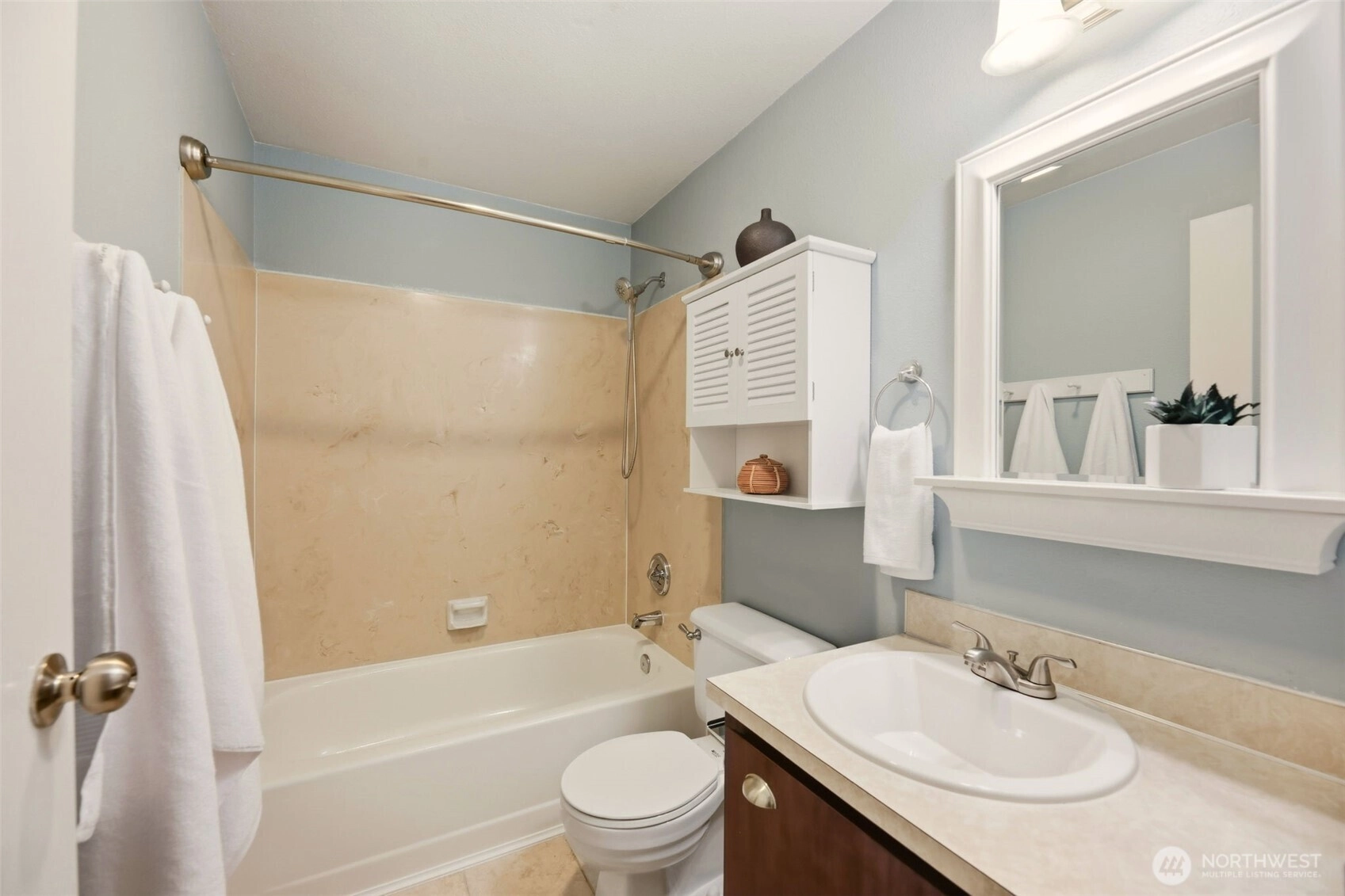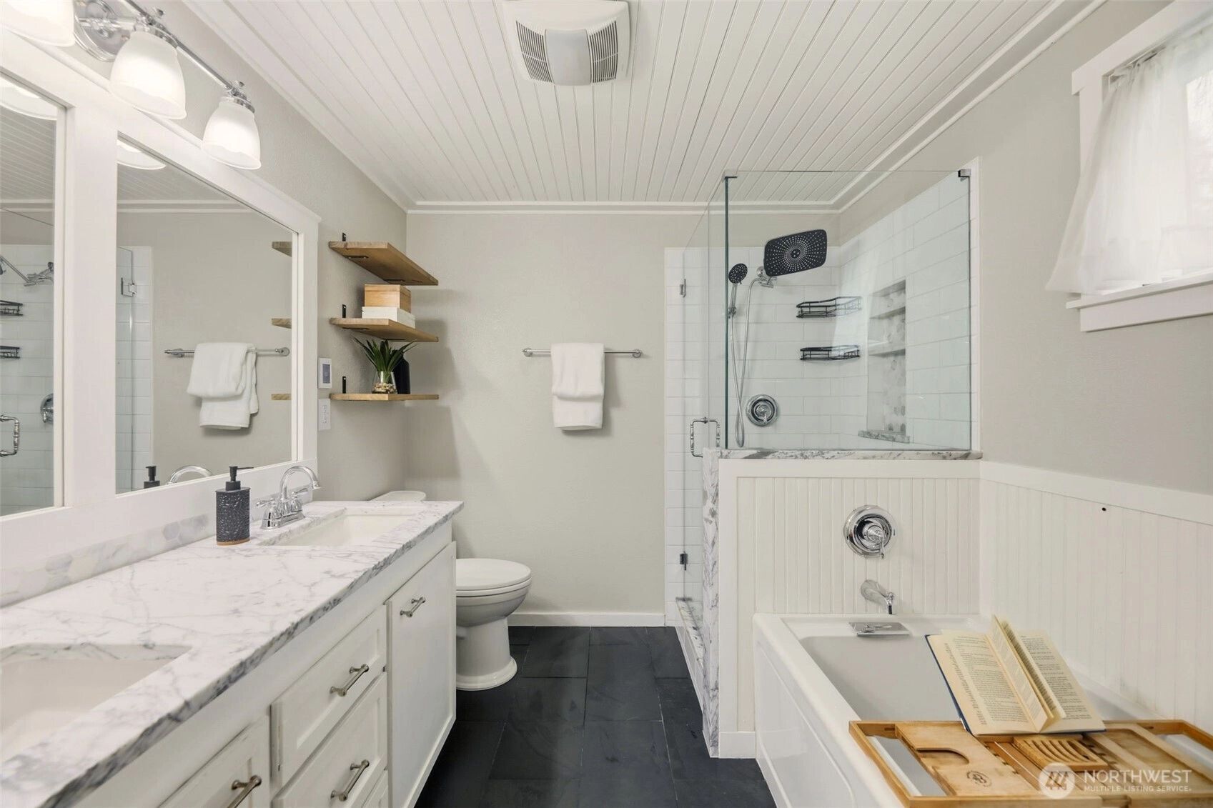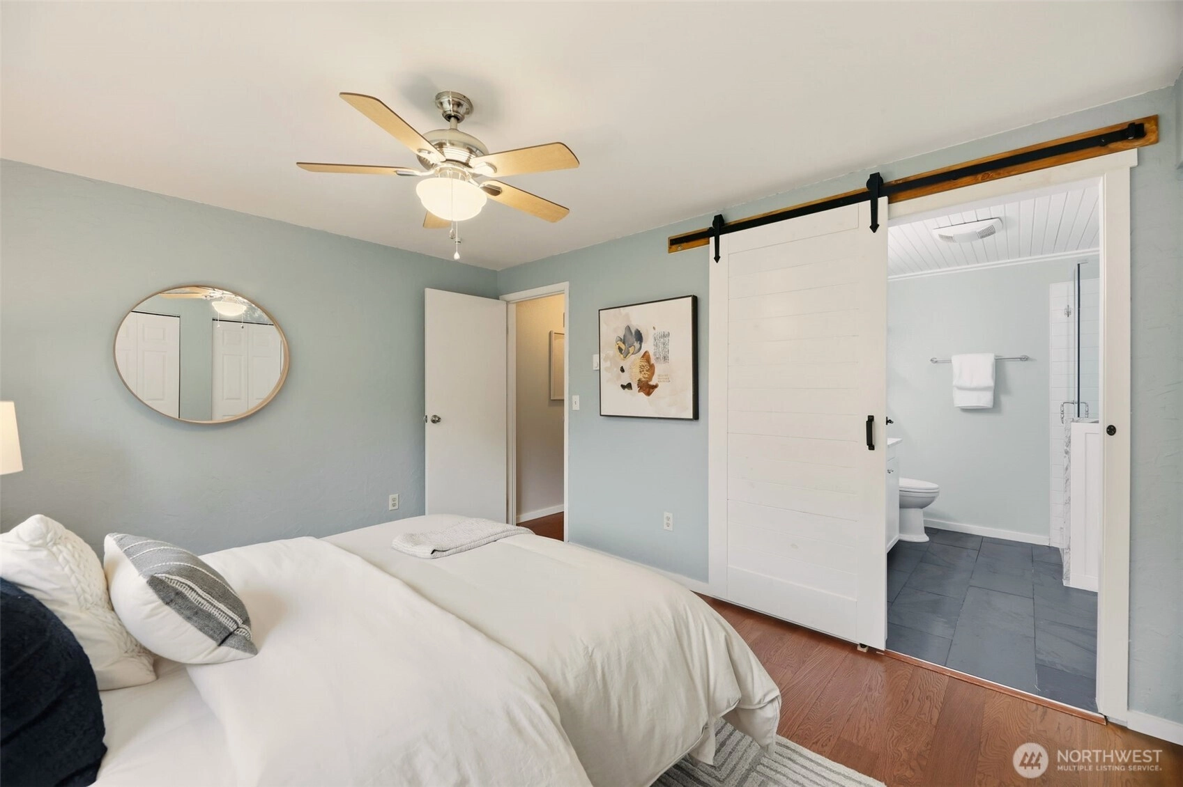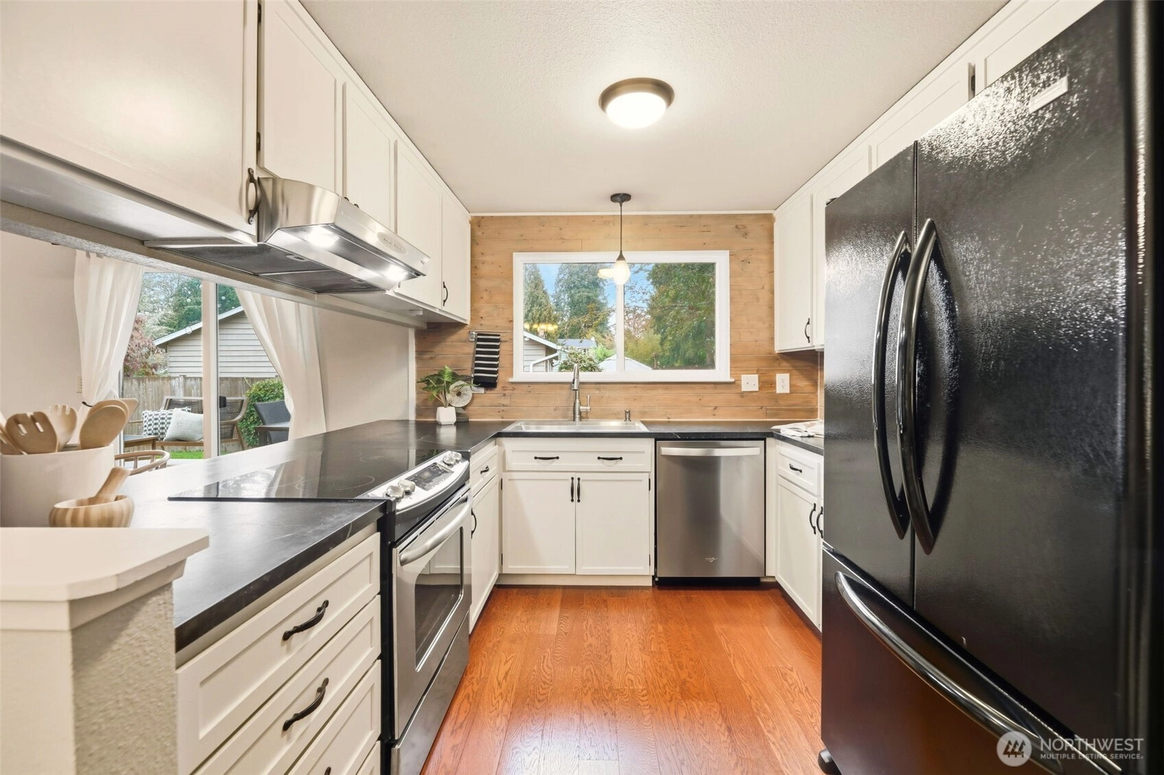 Welcome Home to this beautifully updated 3-bed, 2-bath rambler in desirable Silver Firs Community. Warm natural light pours through large windows, highlighting the vaulted ceilings, open floor plan, & rich engineered hardwood floors that flow seamlessly throughout. Kitchen features under mount lighting & full tile backsplash. Primary suite offers a serene spa-like 5-piece bath w/ heated slate floors, marble details, & custom built-ins. Newer roof, windows, garage door, & front door. Step outside to a spacious backyard where a new deck & covered awning invite you to savor peaceful mornings or cozy evenings year-round while staying dry. Room to add RV parking. Great community parks, playfields, dog park, shopping, & sidewalk streets. Turn Key