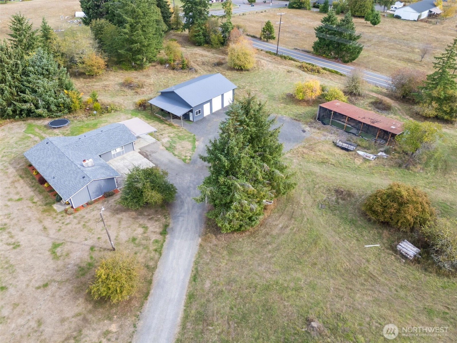 Charming country rambler on nearly 7 acres! This 3-bed, 2-bath home offers both comfort and versatility with an open living room, spacious family room, and a converted garage turned rec room. Stay comfortable year-round with a heat pump and fireplace perfect for cozy evenings. Outside, enjoy a massive 36x48 shop, 5-stall machine shed currently used as batting cages, 2 carports and an abundance of fruit trees. Wired for hot tub. Country living just minutes to town. Room to work, play, and grow—your peaceful retreat with space for all your hobbies and dreams!