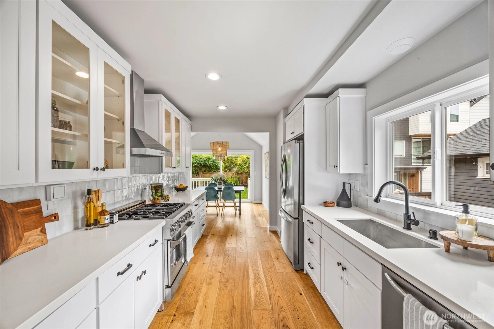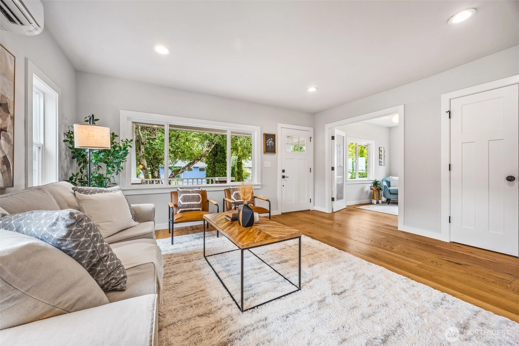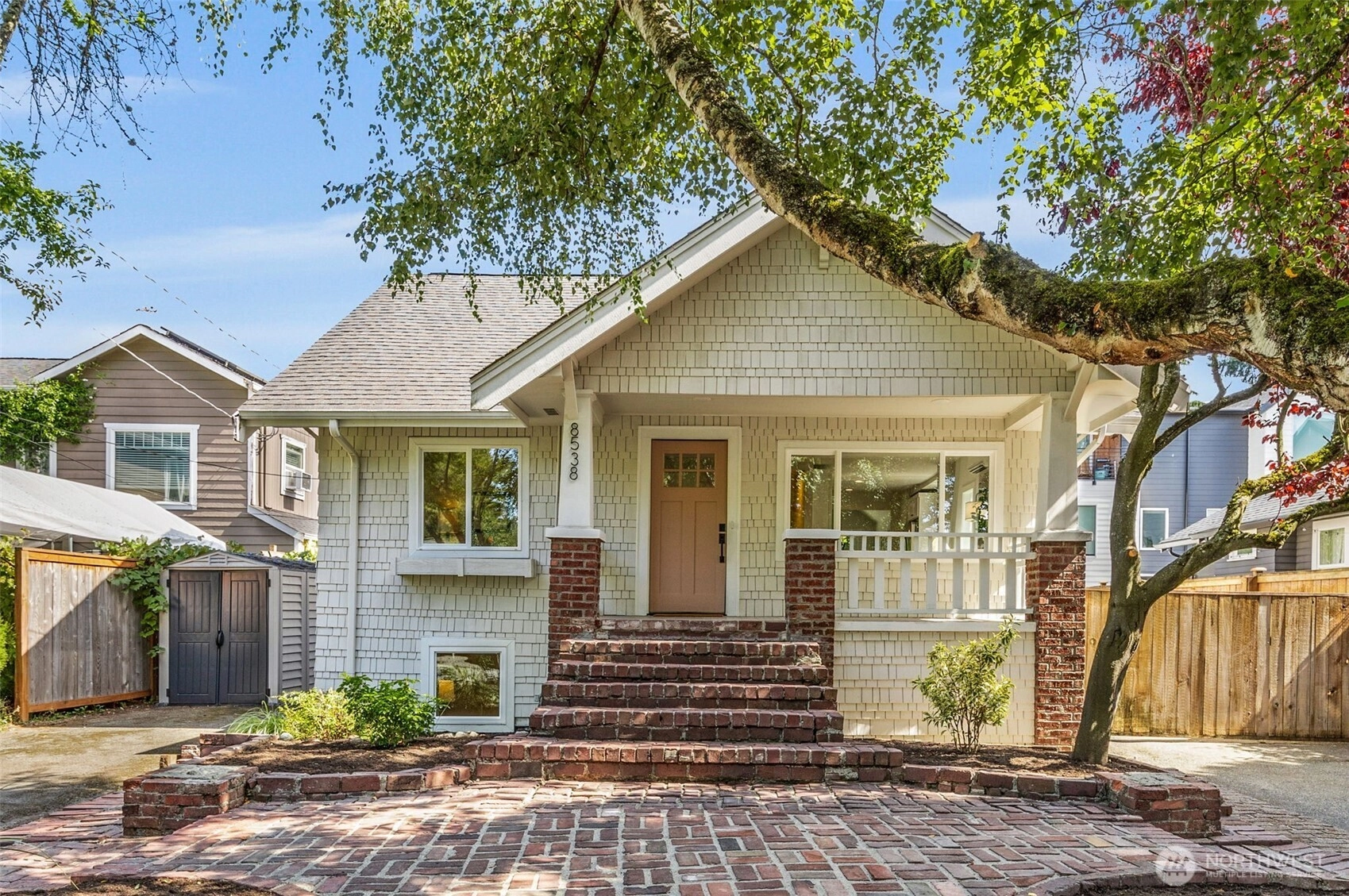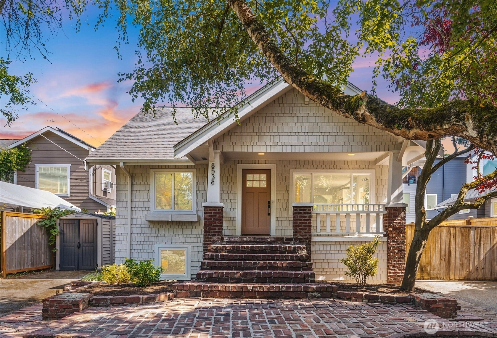 Charm meets modern living by following the enchanting, brick path under blooming cherry trees to this beautifully remodeled 1924 Craftsman with covered front porch. Light-filled spaces w/ wide-plank oak floors, sunny office w/ French doors, stylish kitchen w/ soaring vaulted dining leads to sprawling deck for seamless indoor/outdoor living. Main floor primary room w/ bath & designer finishes plus flex spaces for work, play & guests on both upper & lower floors including media/recreation room. Fully updated systems for peace of mind & fenced yard w/ custom pizza oven offers the ultimate entertaining experience. Plenty of off-street parking with two driveways and two sheds for gear storage. Close to Metropolitan Market, eateries, & shopping.