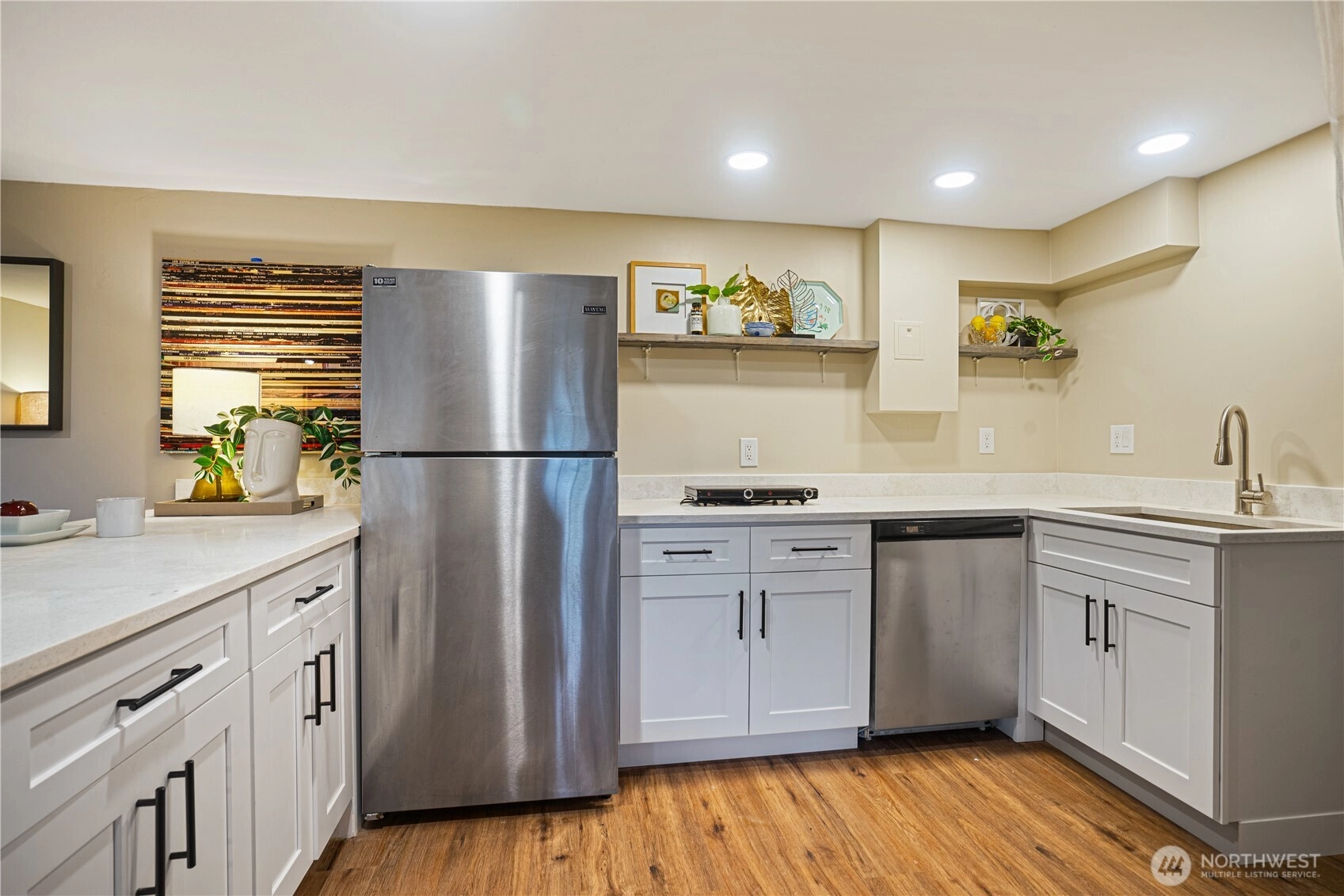 Permitted remodel w/multi-gen appeal & income potential! Move-in ready w/new LVP flooring throughout & major systems in excellent shape—roof, furnace & water heater. Kitchens are new w/SS appliances. Lower level boasts 1.5 baths, separate entrance & spacious primary suite w/walk-in closet. Light-filled interiors highlight the practical layout & flexibility. Quiet neighborhood near freeways, airport & shopping. Private yard w/mature fruit-producing trees & additional parking for boat or RV. Need more space? Build more! Buyer to verify zoning. Welcome home.