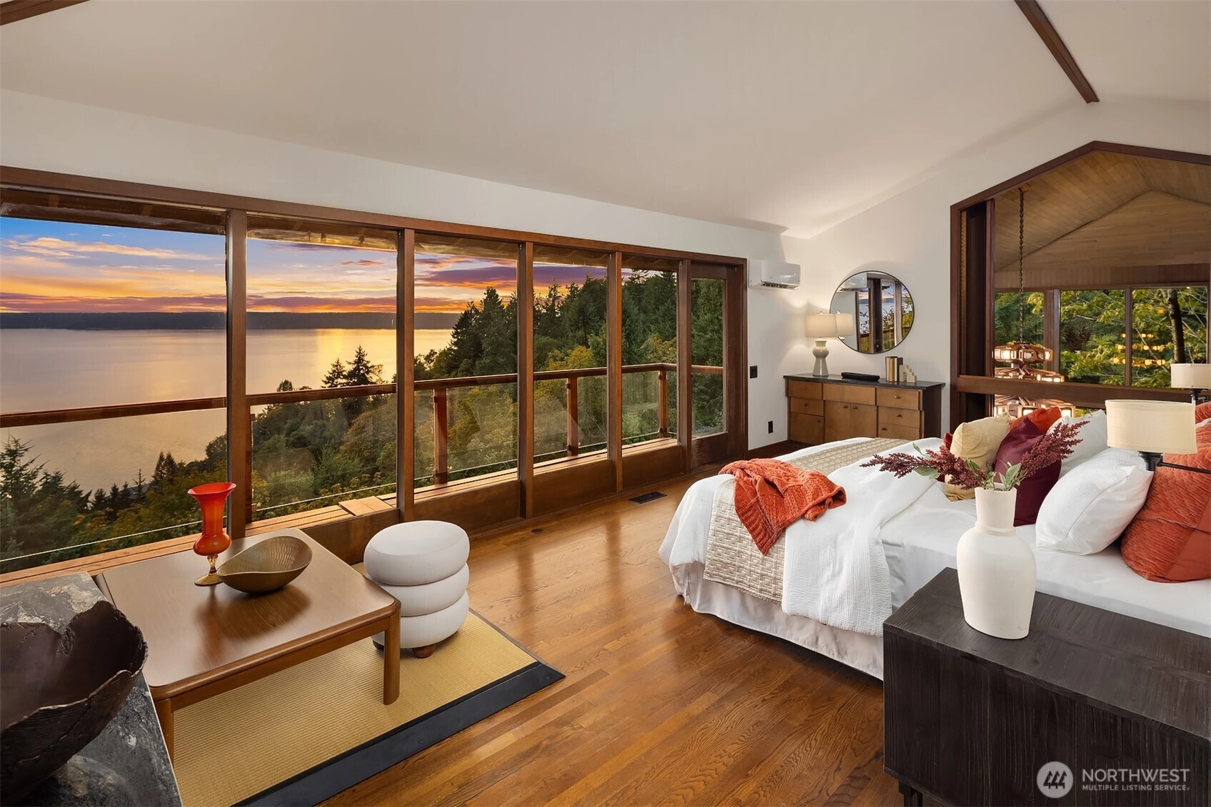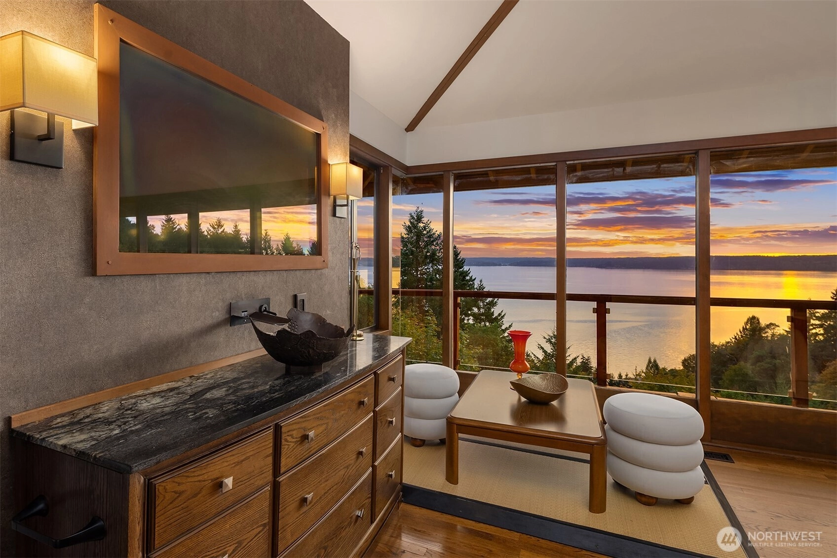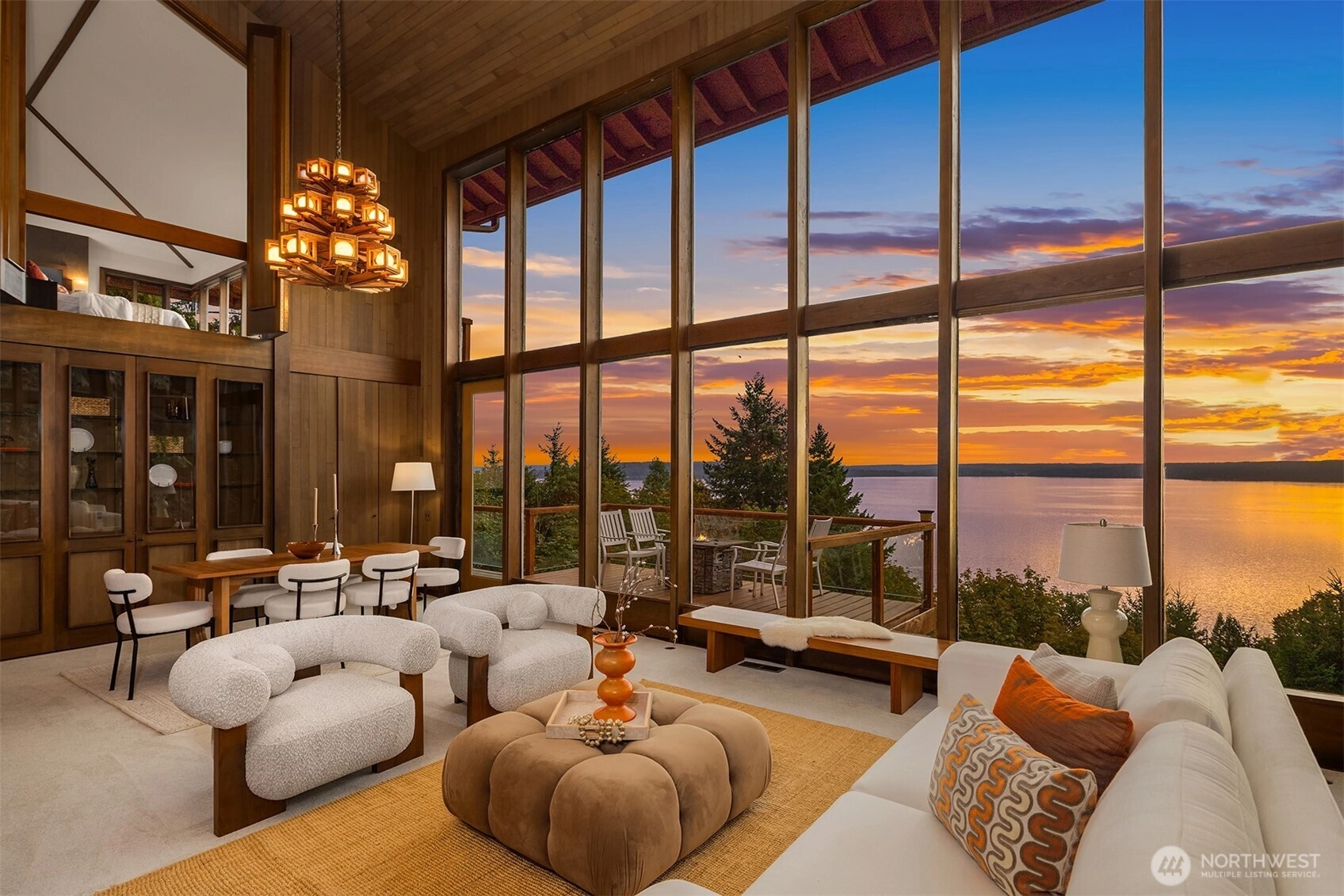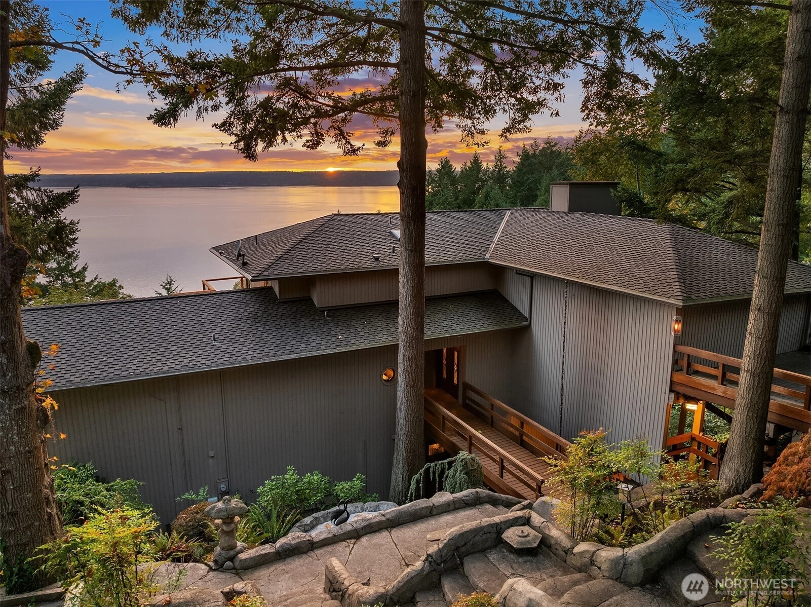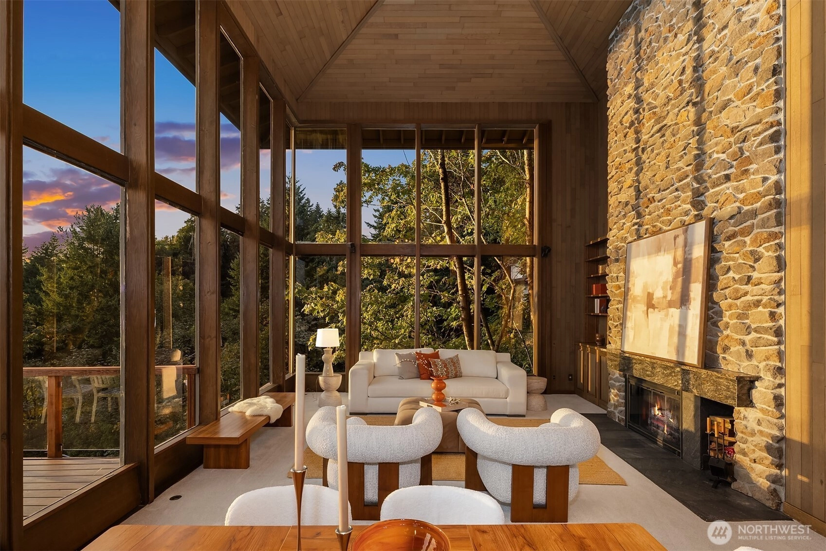 Ralph Anderson Haven // Designed by renowned architect Ralph Anderson, this exceptional home sits on a 35,000+ sqft double parcel with protected panoramic views of Puget Sound, the Olympics, and Mt. Rainier. Thoughtfully hardscaped with a waterfall and surrounded by lush greenery, it offers a private, tranquil oasis. Inside, cedar tongue-and-groove ceilings, a soaring 15’ stone fireplace, and floor-to-ceiling windows create a warm, light-filled retreat. Expansive decks with custom lit glass railings are perfect for entertaining. Lofted primary suite offers stunning views, a skylit ensuite with sauna, discrete mirrored TV, and private hot tub. The lower level includes a large flex space, private deck, and three light-filled bedrooms.