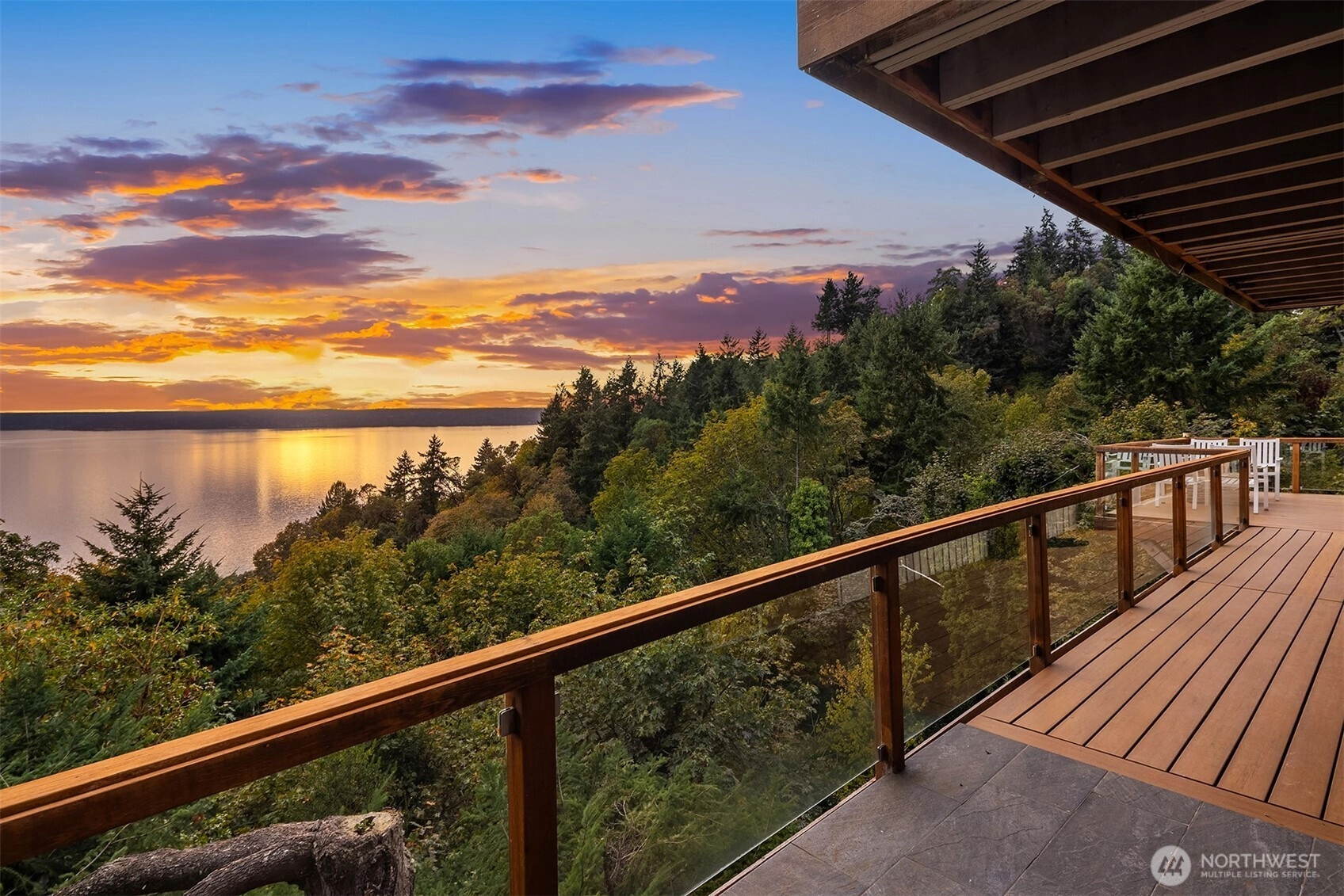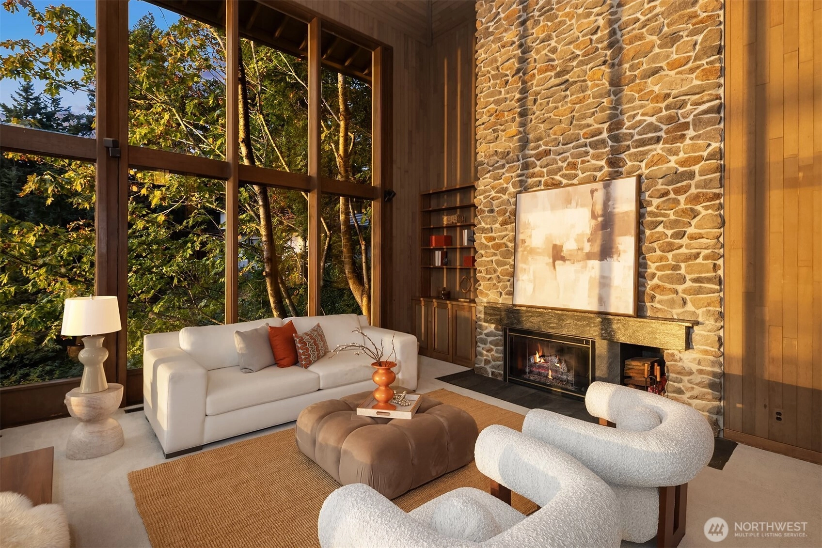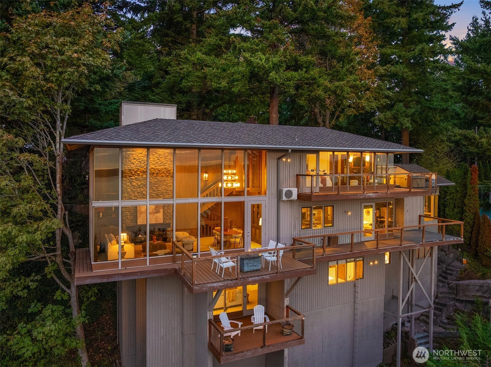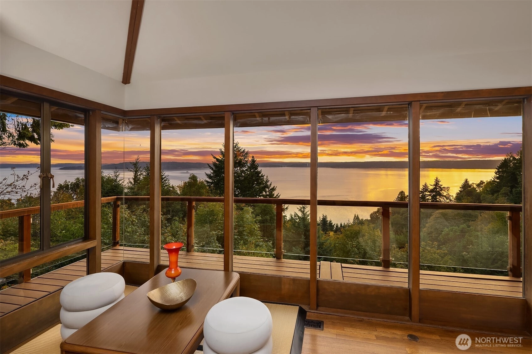 Ralph Anderson Haven // Designed by renowned architect Ralph Anderson, this exceptional home sits on a 35,000+ sqft double parcel with protected panoramic views of Puget Sound, the Olympics, and Mt. Rainier. Thoughtfully hardscaped with a waterfall and surrounded by lush greenery, it offers a private, tranquil oasis. Inside, cedar tongue-and-groove ceilings, a soaring 15’ stone fireplace, and floor-to-ceiling windows create a warm, light-filled retreat. Expansive decks with custom lit glass railings are perfect for entertaining. Lofted primary suite offers stunning views, a skylit ensuite with sauna, discrete mirrored TV, and private hot tub. The lower level includes a large flex space, private deck, and three light-filled bedrooms.