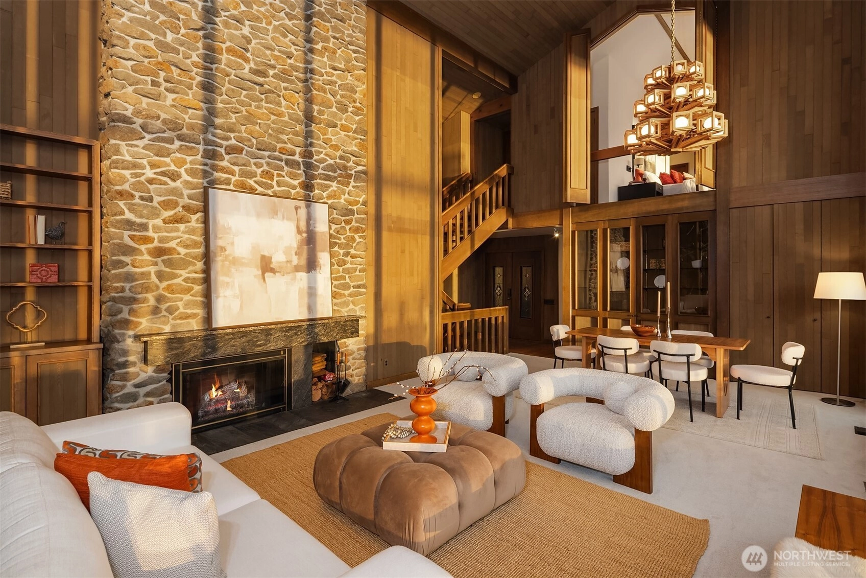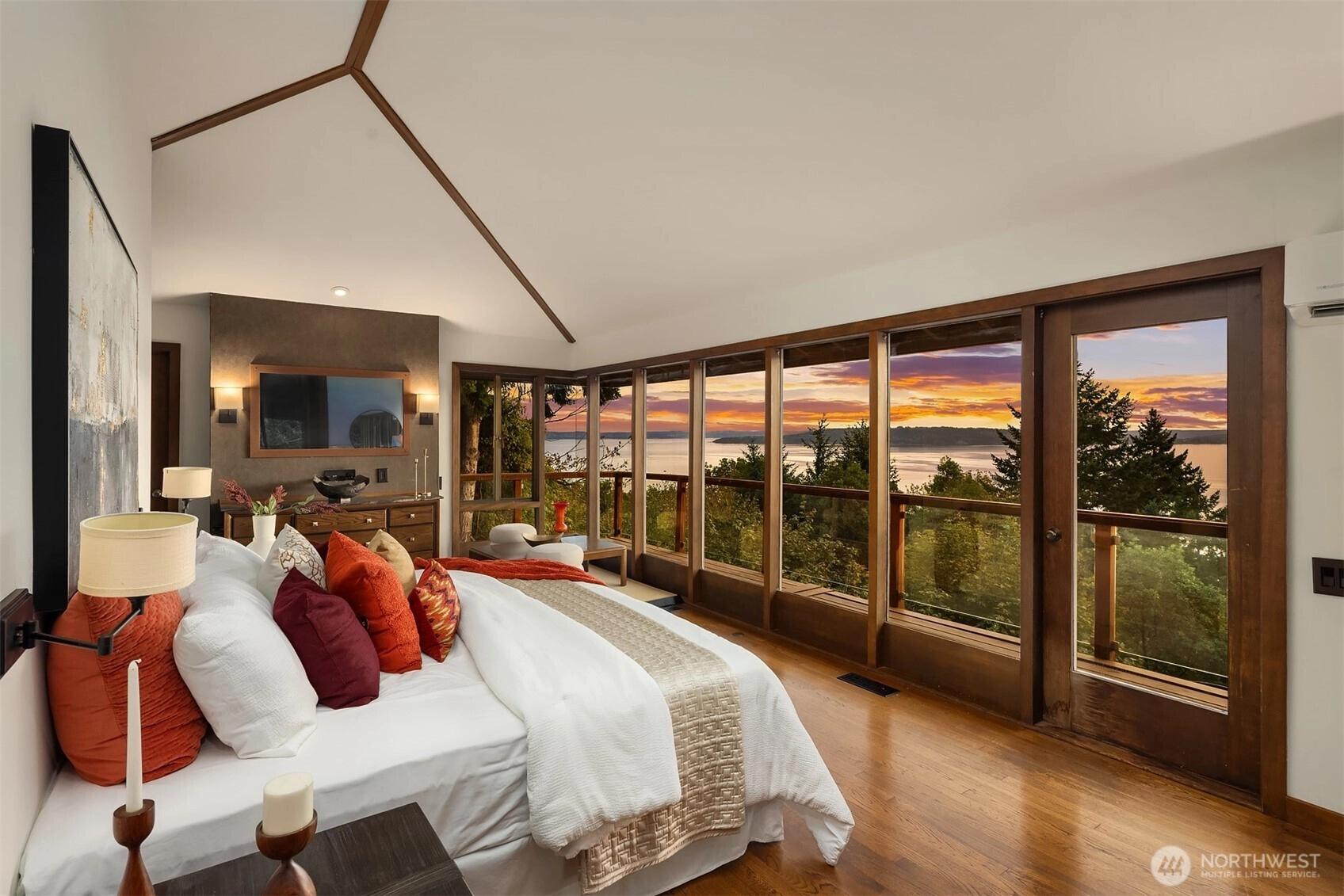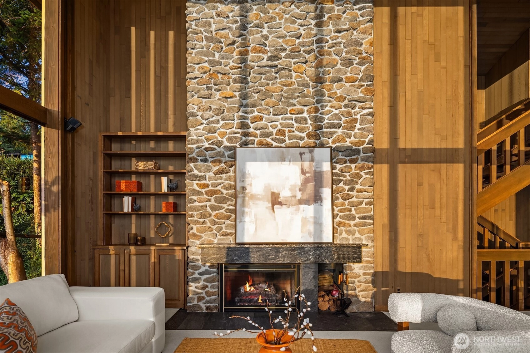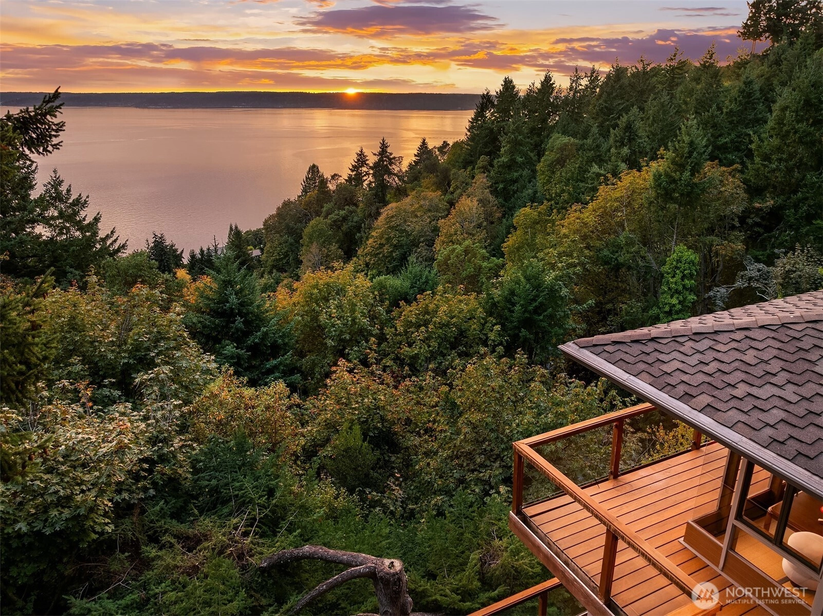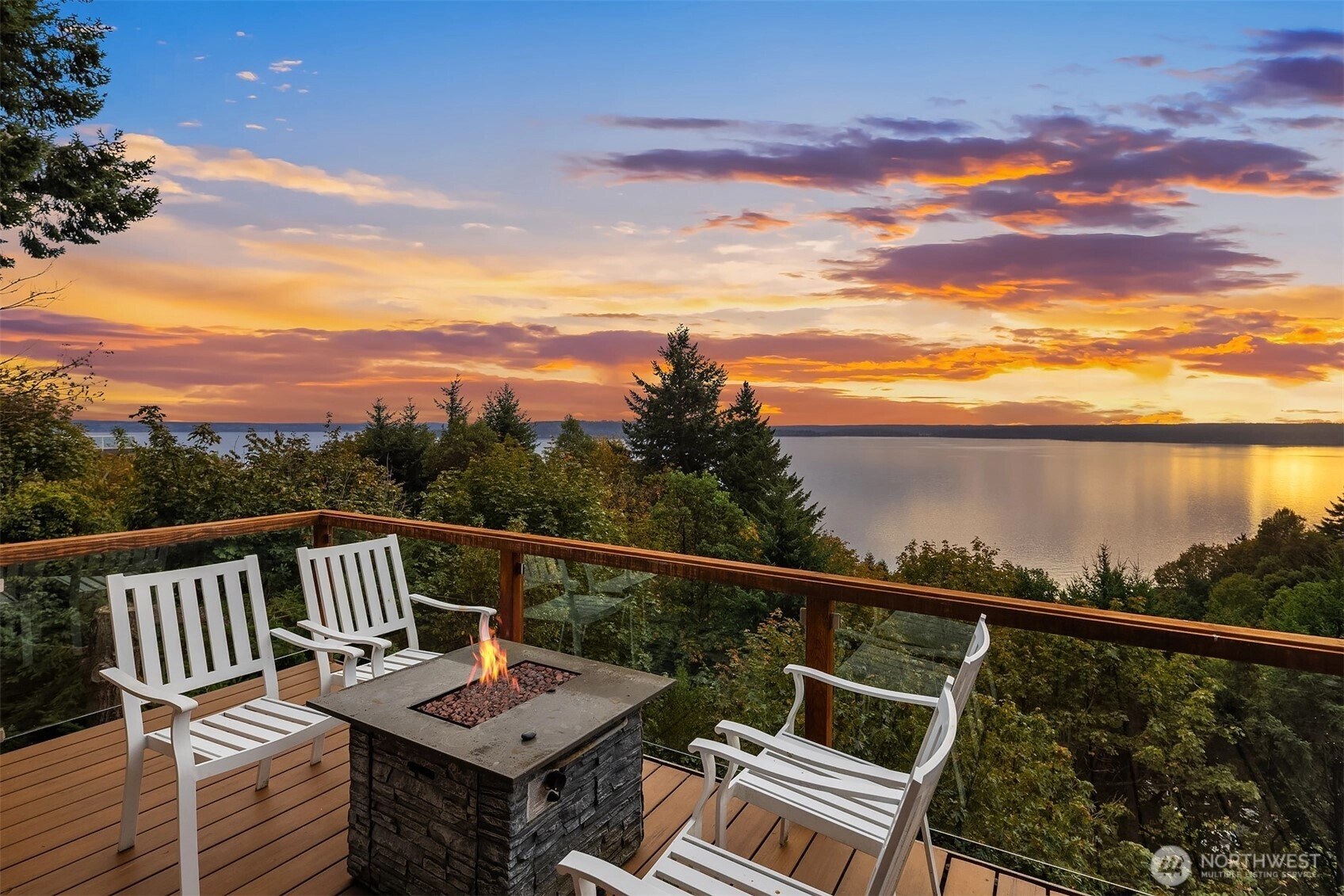 Ralph Anderson Haven // Designed by renowned architect Ralph Anderson, this exceptional home sits on a 35,000+ sqft double parcel with protected panoramic views of Puget Sound, the Olympics, and Mt. Rainier. Thoughtfully hardscaped with a waterfall and surrounded by lush greenery, it offers a private, tranquil oasis. Inside, cedar tongue-and-groove ceilings, a soaring 15’ stone fireplace, and floor-to-ceiling windows create a warm, light-filled retreat. Expansive decks with custom lit glass railings are perfect for entertaining. Lofted primary suite offers stunning views, a skylit ensuite with sauna, discrete mirrored TV, and private hot tub. The lower level includes a large flex space, private deck, and three light-filled bedrooms.