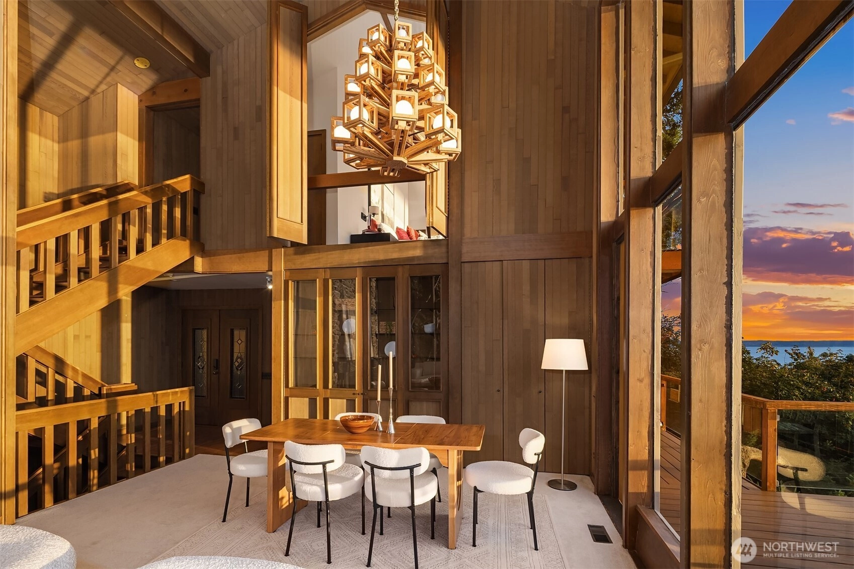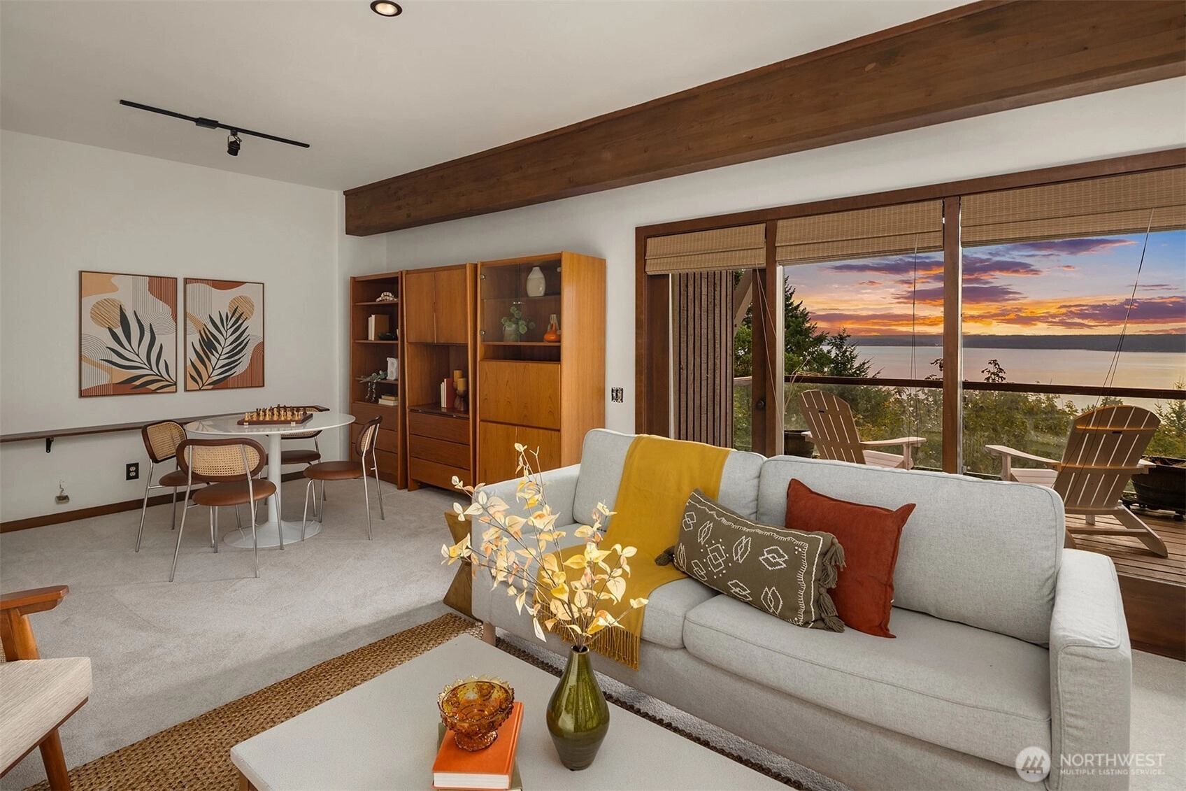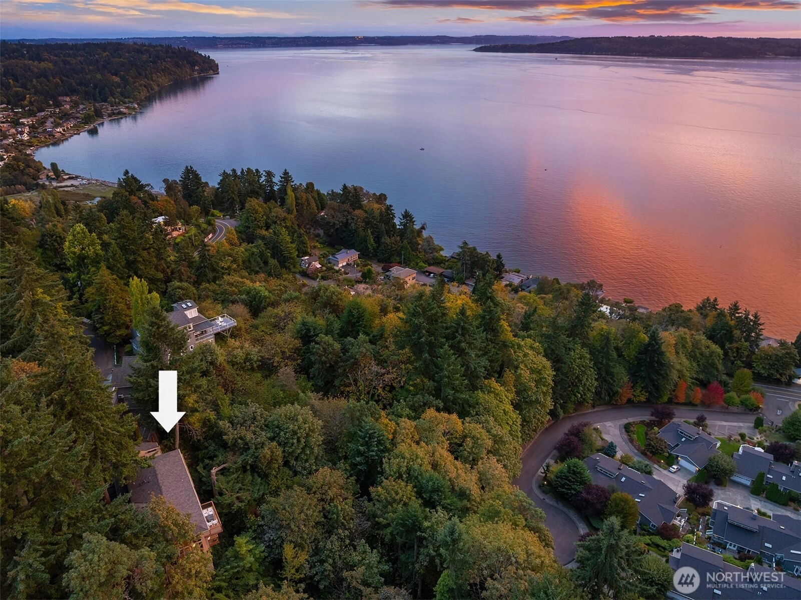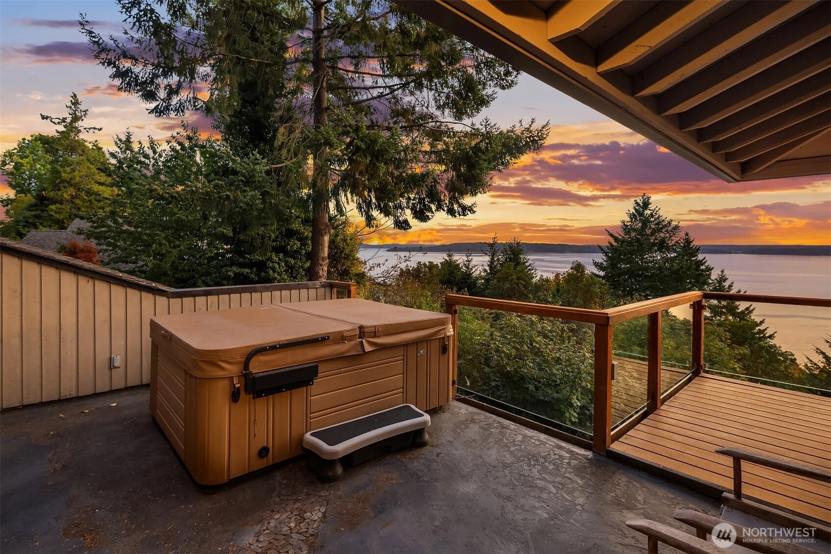 Ralph Anderson Haven // Designed by renowned architect Ralph Anderson, this exceptional home sits on a 35,000+ sqft double parcel with protected panoramic views of Puget Sound, the Olympics, and Mt. Rainier. Thoughtfully hardscaped with a waterfall and surrounded by lush greenery, it offers a private, tranquil oasis. Inside, cedar tongue-and-groove ceilings, a soaring 15’ stone fireplace, and floor-to-ceiling windows create a warm, light-filled retreat. Expansive decks with custom lit glass railings are perfect for entertaining. Lofted primary suite offers stunning views, a skylit ensuite with sauna, discrete mirrored TV, and private hot tub. The lower level includes a large flex space, private deck, and three light-filled bedrooms.