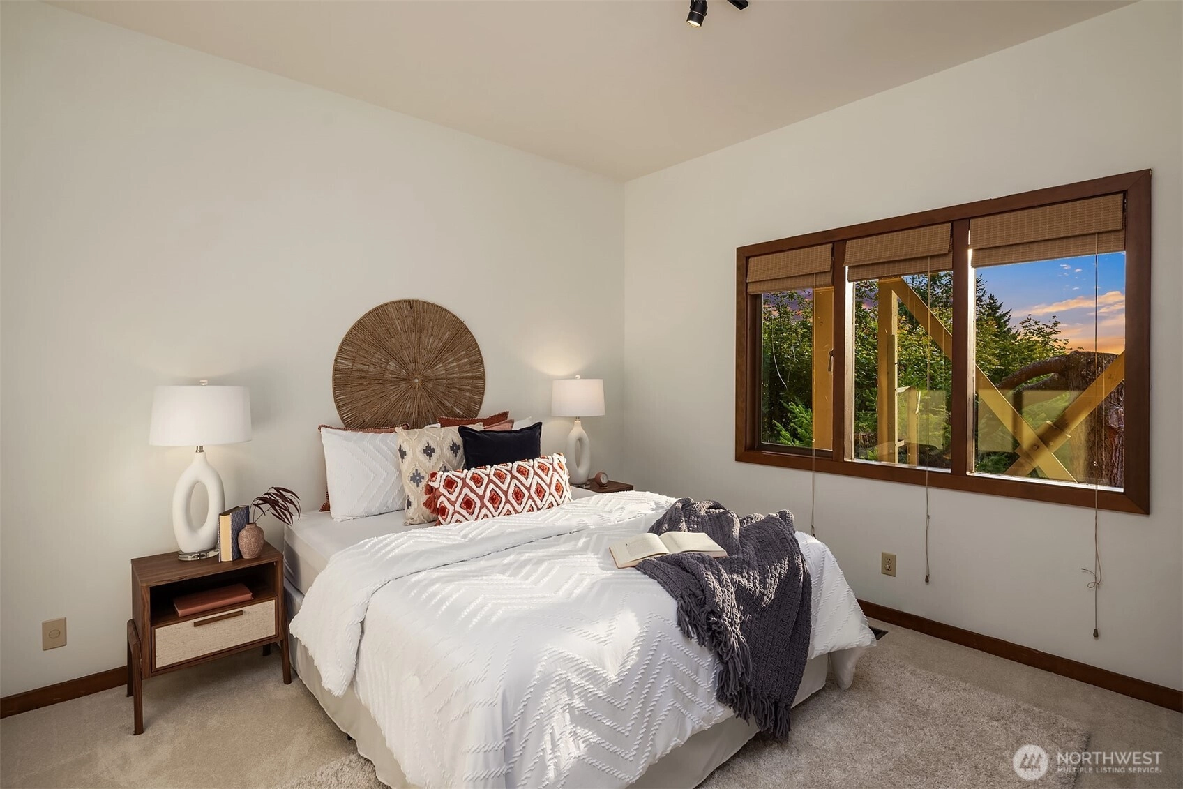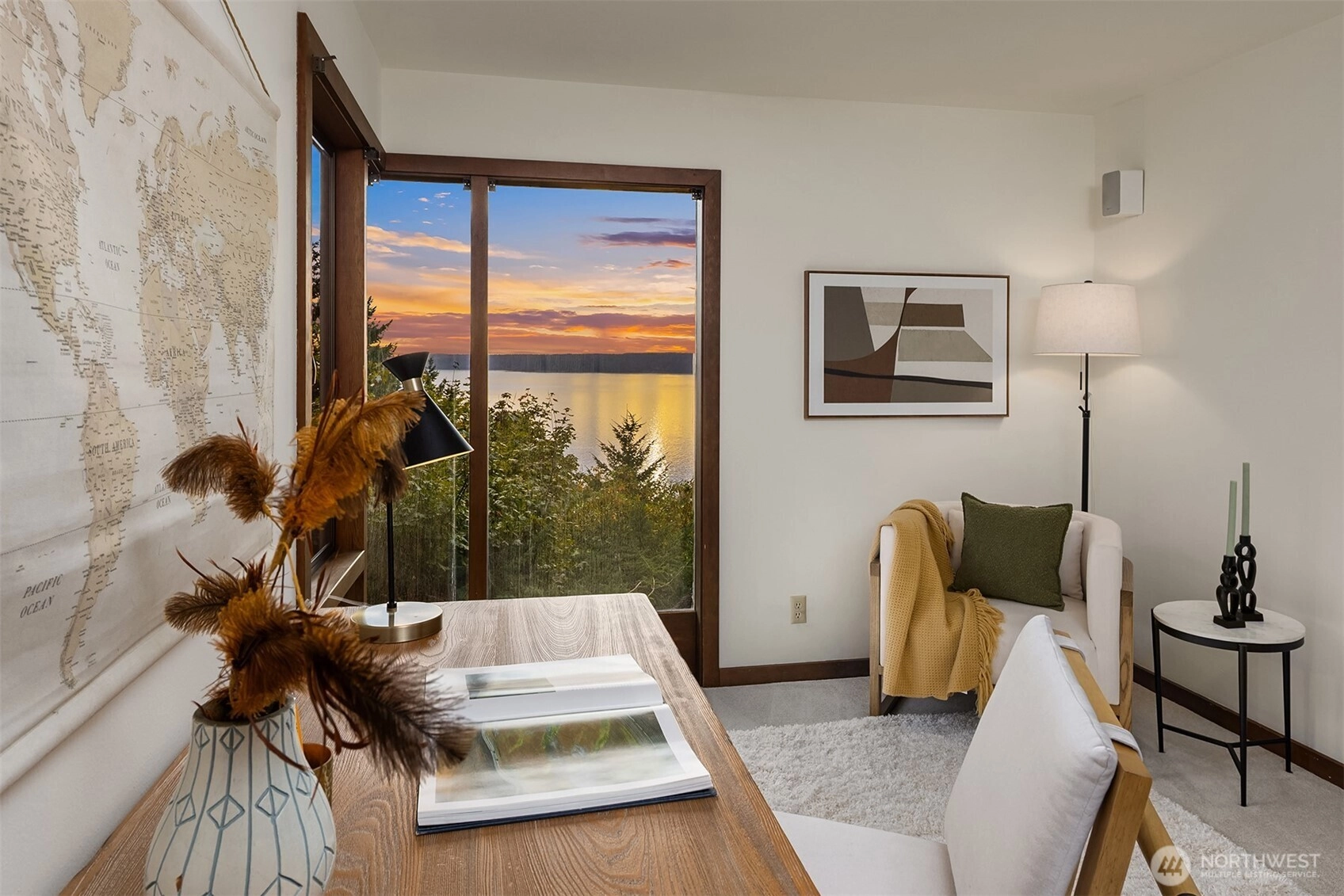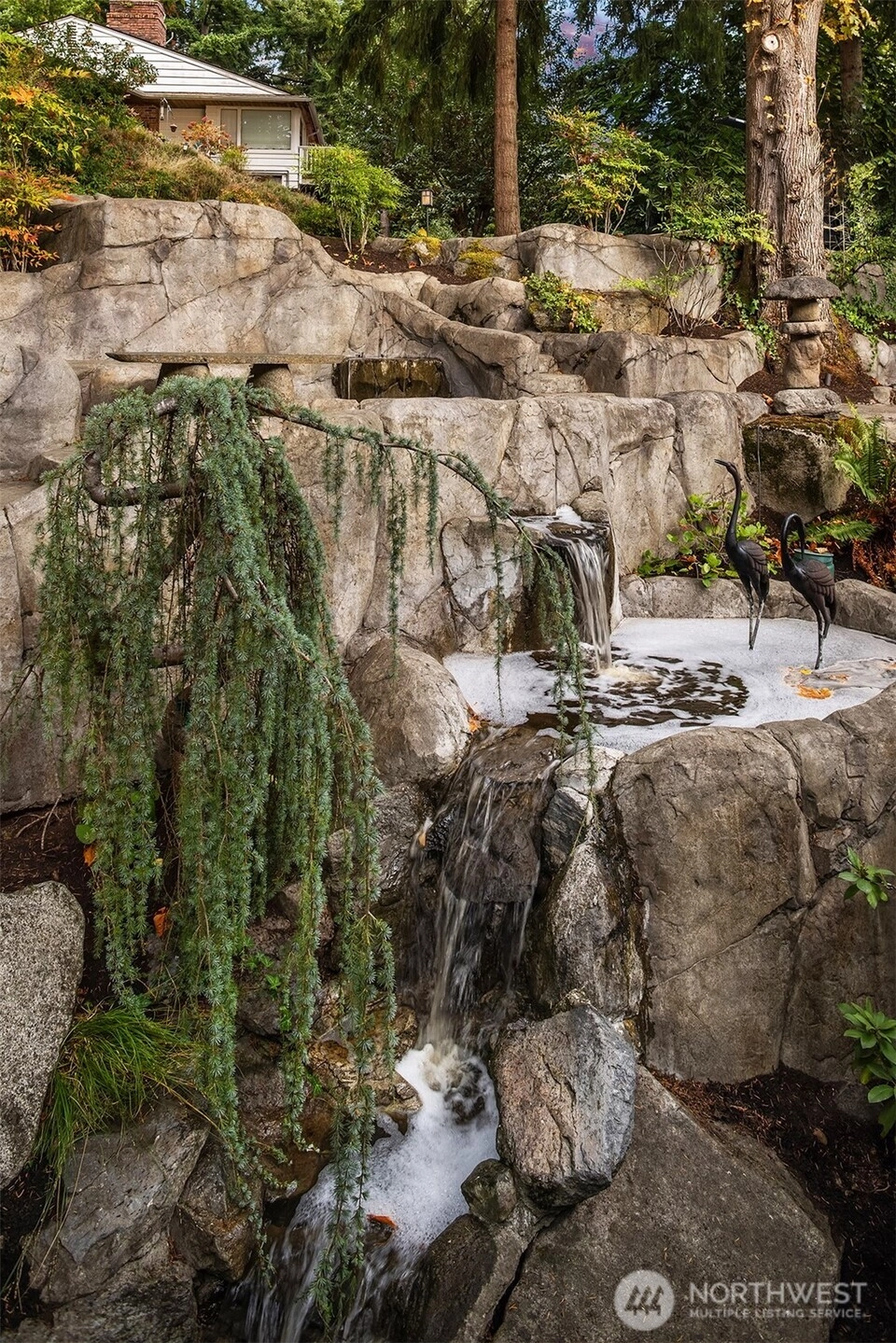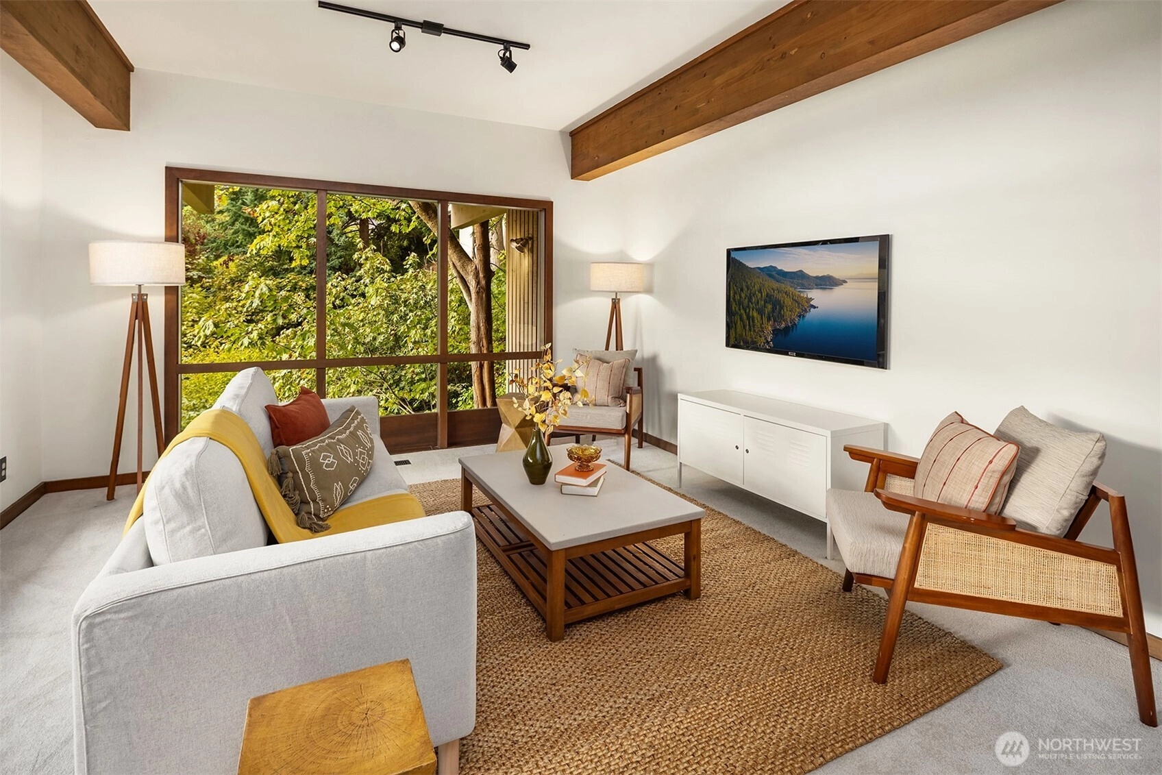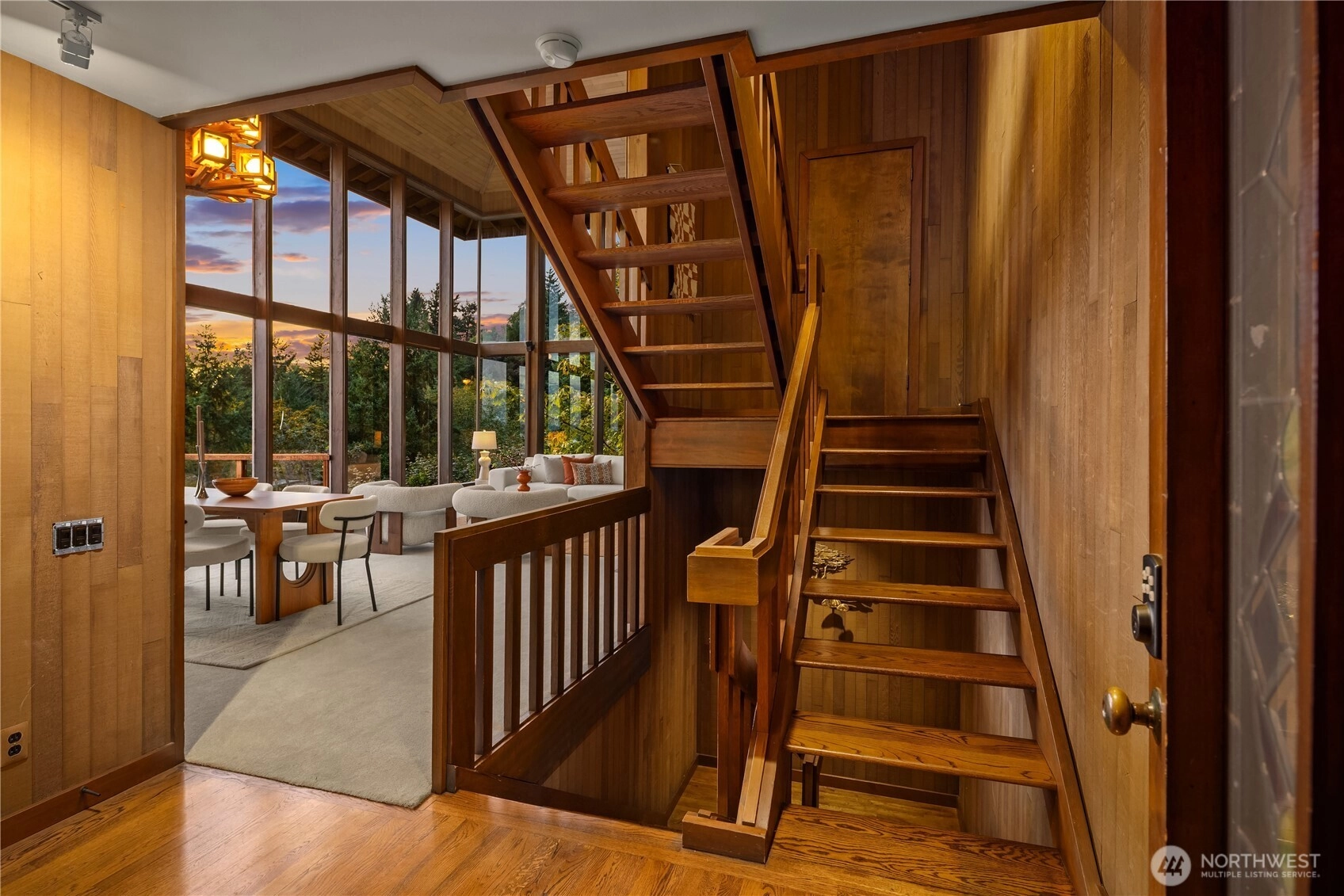Ralph Anderson Haven // Designed by renowned architect Ralph Anderson, this exceptional home sits on a 35,000+ sqft double parcel with protected panoramic views of Puget Sound, the Olympics, and Mt. Rainier. Thoughtfully hardscaped with a waterfall and surrounded by lush greenery, it offers a private, tranquil oasis. Inside, cedar tongue-and-groove ceilings, a soaring 15’ stone fireplace, and floor-to-ceiling windows create a warm, light-filled retreat. Expansive decks with custom lit glass railings are perfect for entertaining. Lofted primary suite offers stunning views, a skylit ensuite with sauna, discrete mirrored TV, and private hot tub. The lower level includes a large flex space, private deck, and three light-filled bedrooms.