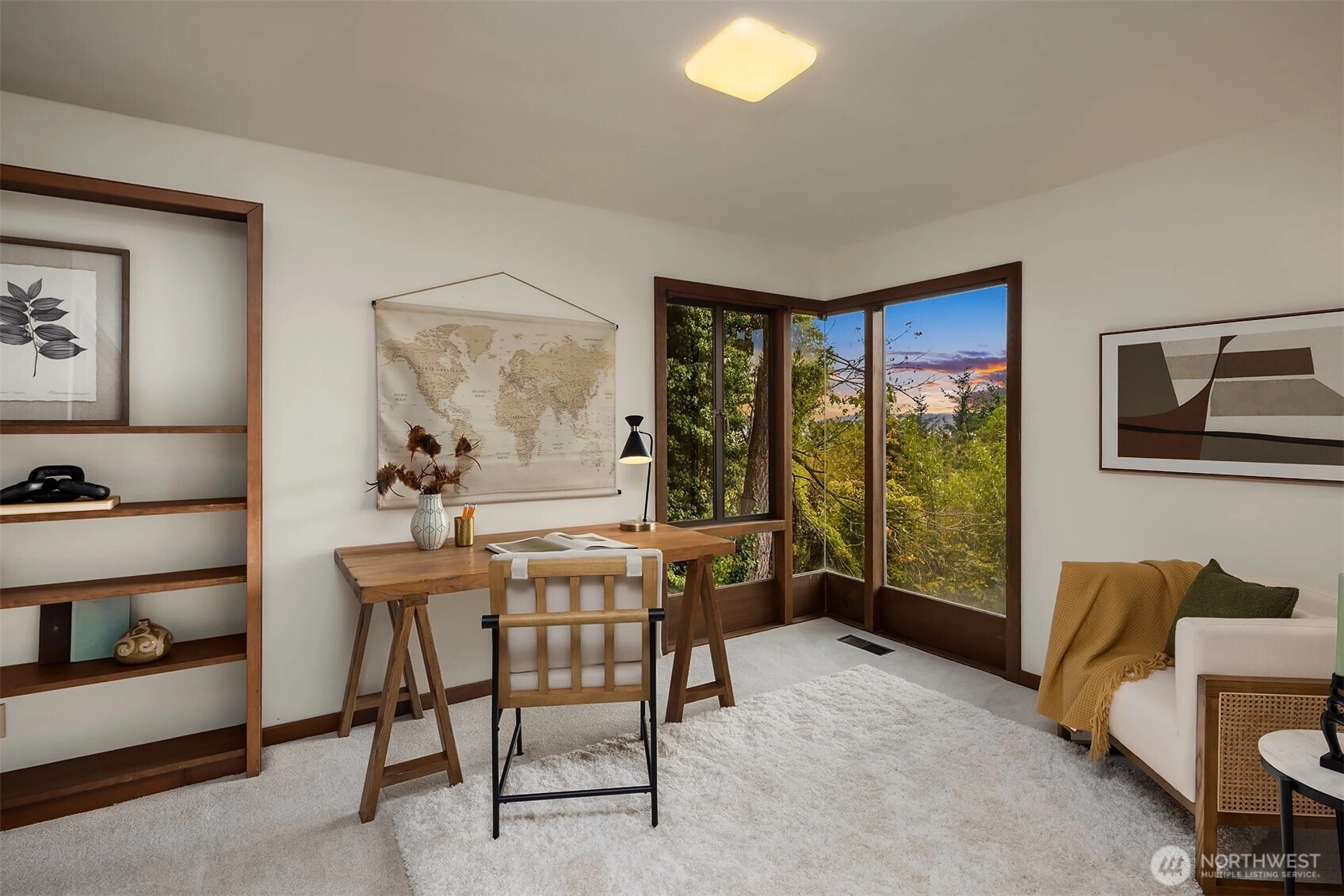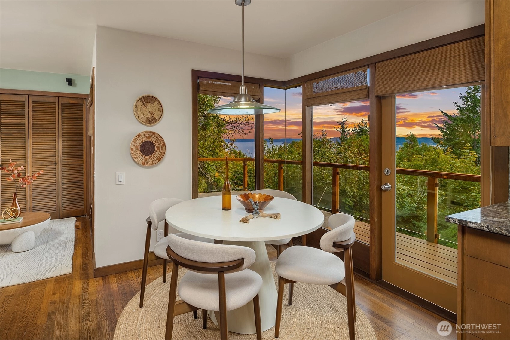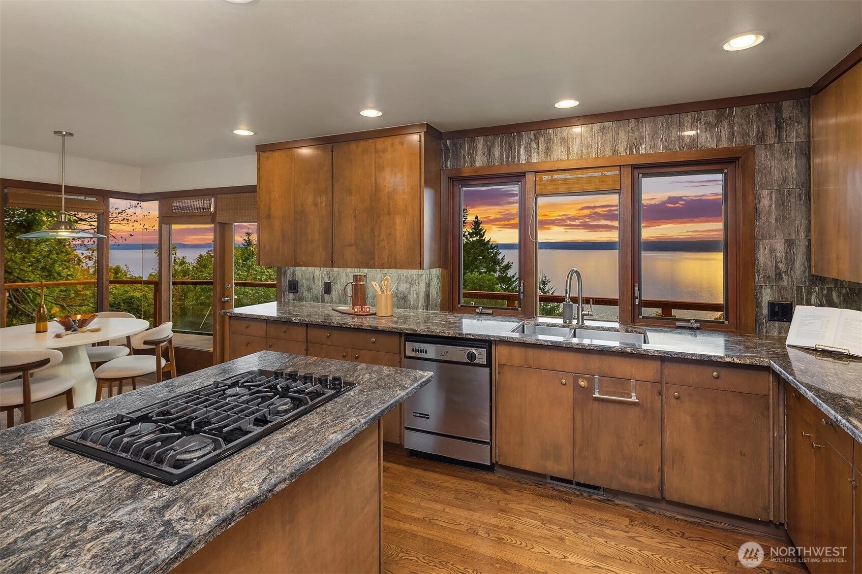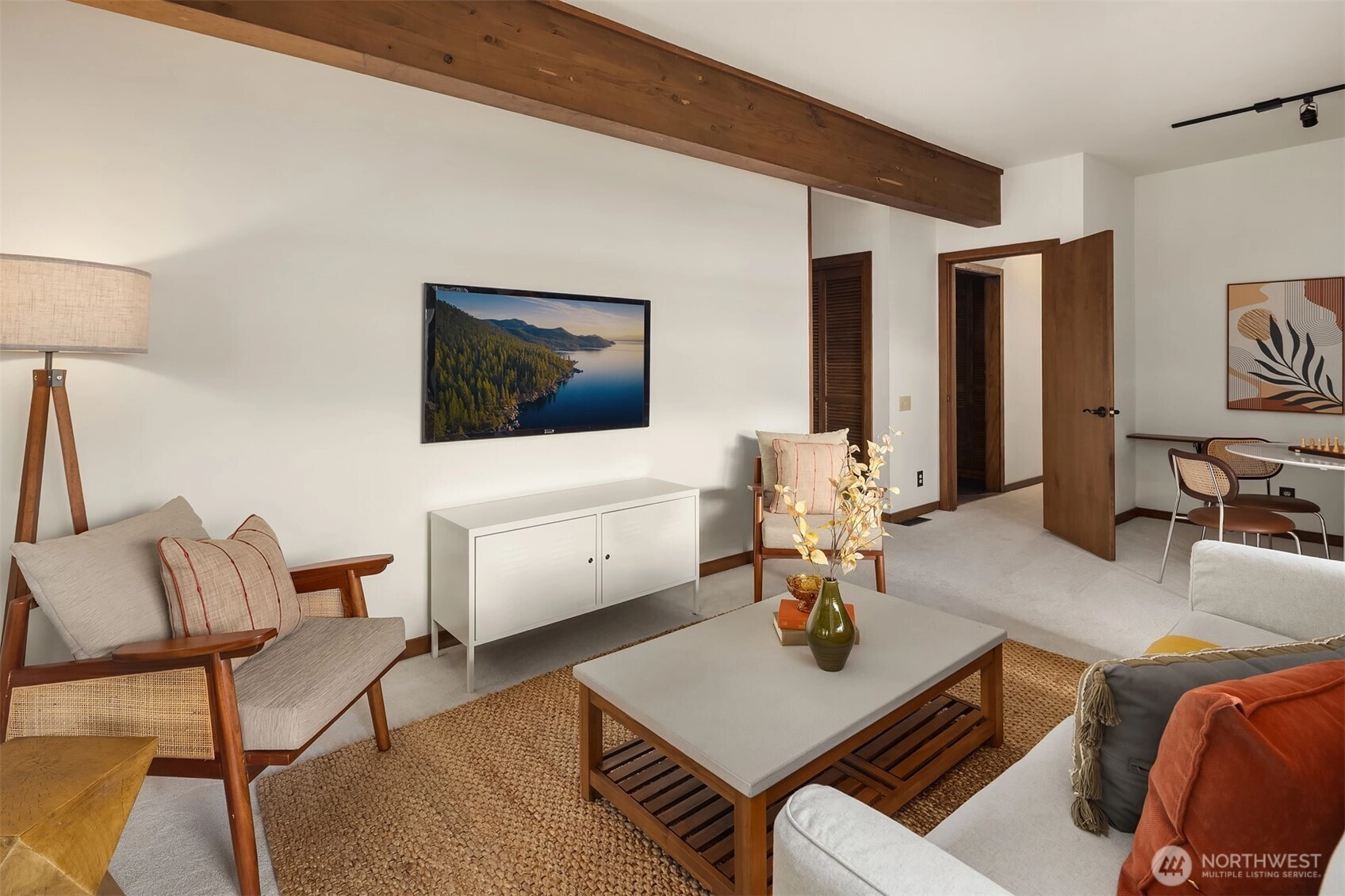Ralph Anderson Haven // Designed by renowned architect Ralph Anderson, this exceptional home sits on a 35,000+ sqft double parcel with protected panoramic views of Puget Sound, the Olympics, and Mt. Rainier. Thoughtfully hardscaped with a waterfall and surrounded by lush greenery, it offers a private, tranquil oasis. Inside, cedar tongue-and-groove ceilings, a soaring 15’ stone fireplace, and floor-to-ceiling windows create a warm, light-filled retreat. Expansive decks with custom lit glass railings are perfect for entertaining. Lofted primary suite offers stunning views, a skylit ensuite with sauna, discrete mirrored TV, and private hot tub. The lower level includes a large flex space, private deck, and three light-filled bedrooms.