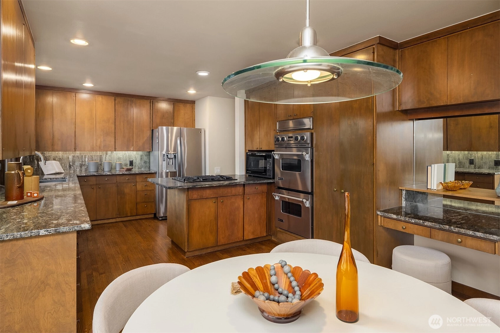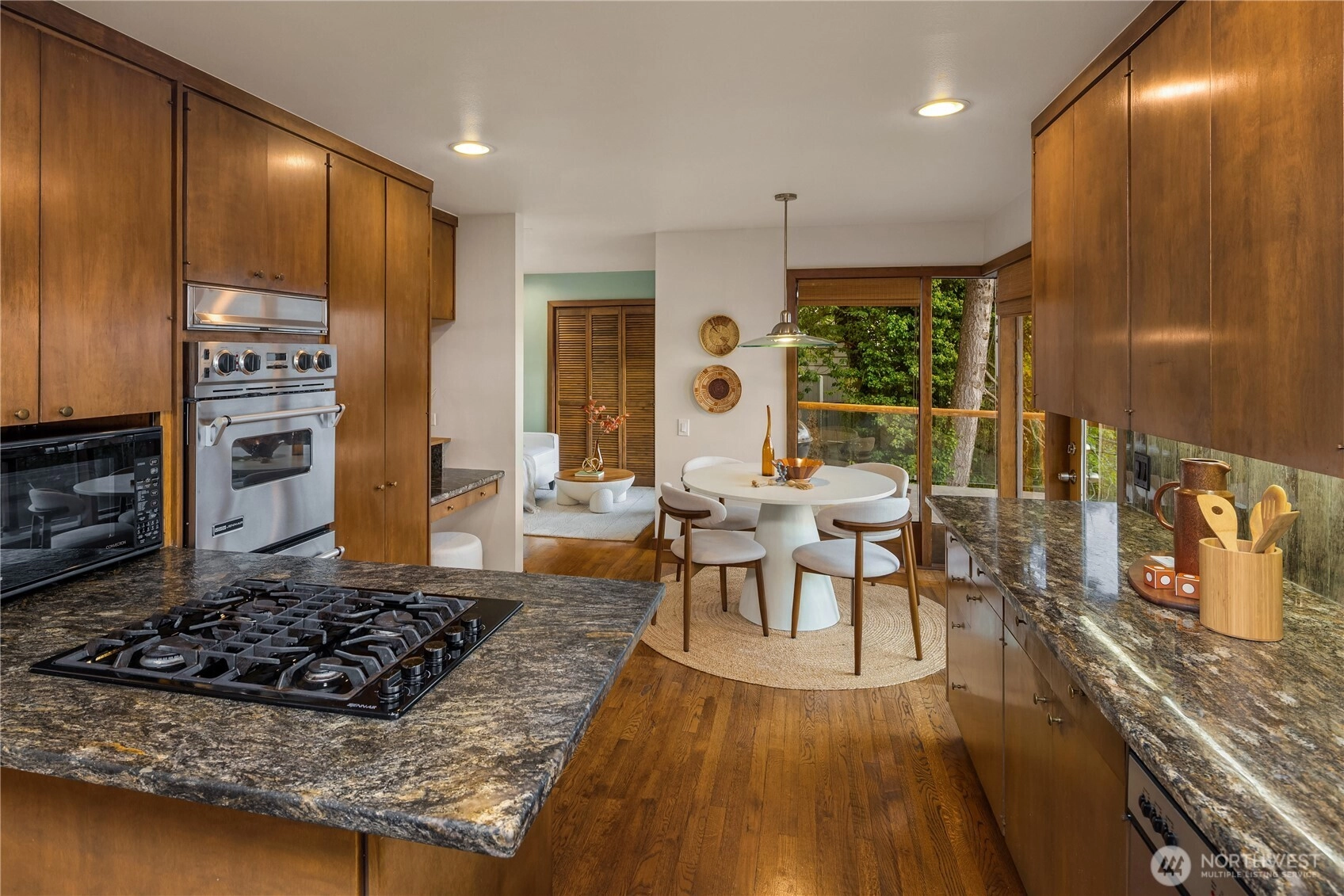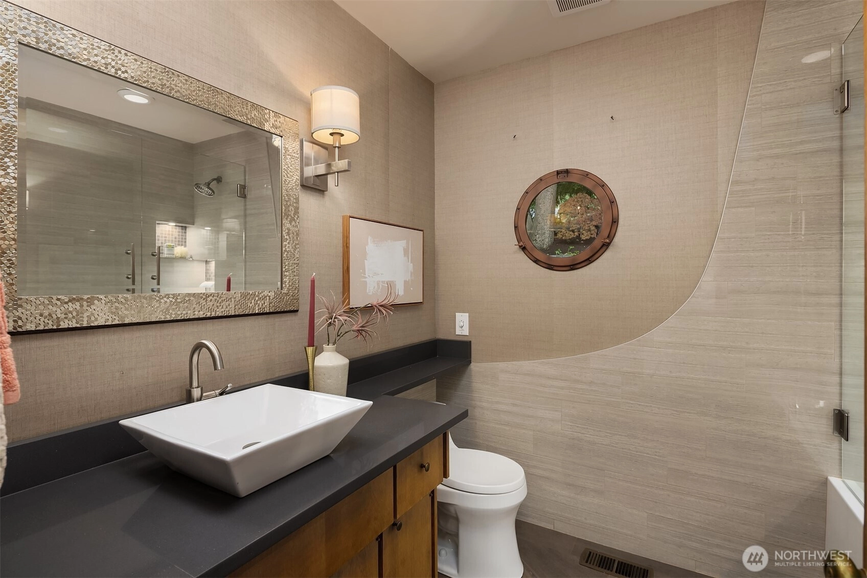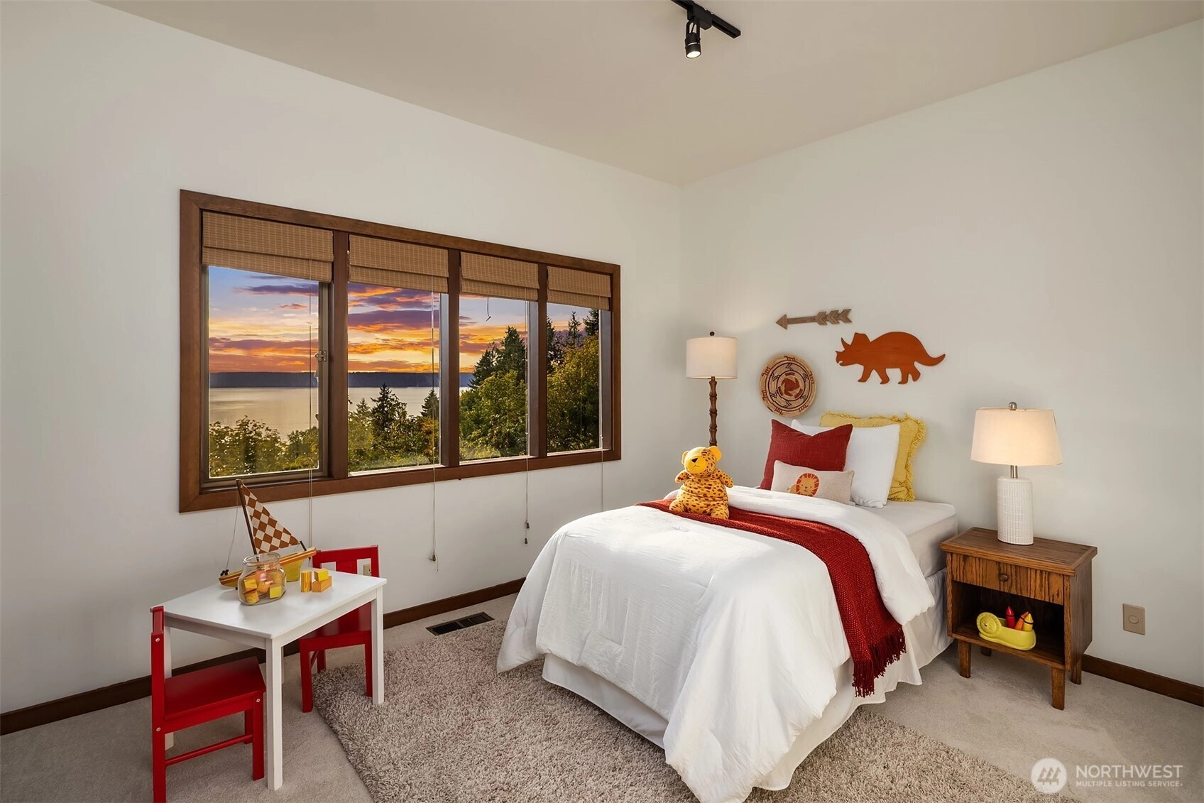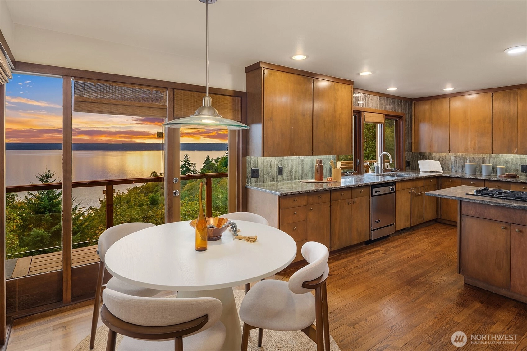 Ralph Anderson Haven // Designed by renowned architect Ralph Anderson, this exceptional home sits on a 35,000+ sqft double parcel with protected panoramic views of Puget Sound, the Olympics, and Mt. Rainier. Thoughtfully hardscaped with a waterfall and surrounded by lush greenery, it offers a private, tranquil oasis. Inside, cedar tongue-and-groove ceilings, a soaring 15’ stone fireplace, and floor-to-ceiling windows create a warm, light-filled retreat. Expansive decks with custom lit glass railings are perfect for entertaining. Lofted primary suite offers stunning views, a skylit ensuite with sauna, discrete mirrored TV, and private hot tub. The lower level includes a large flex space, private deck, and three light-filled bedrooms.