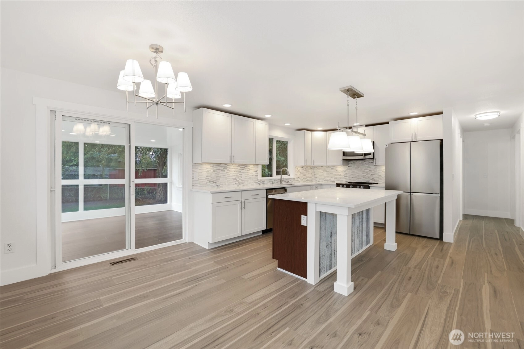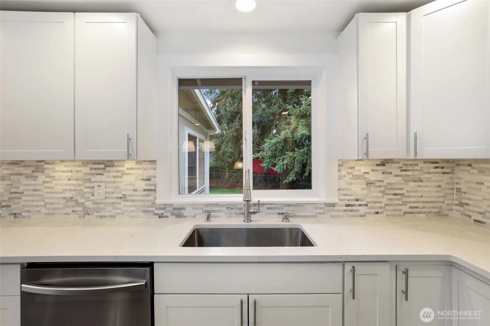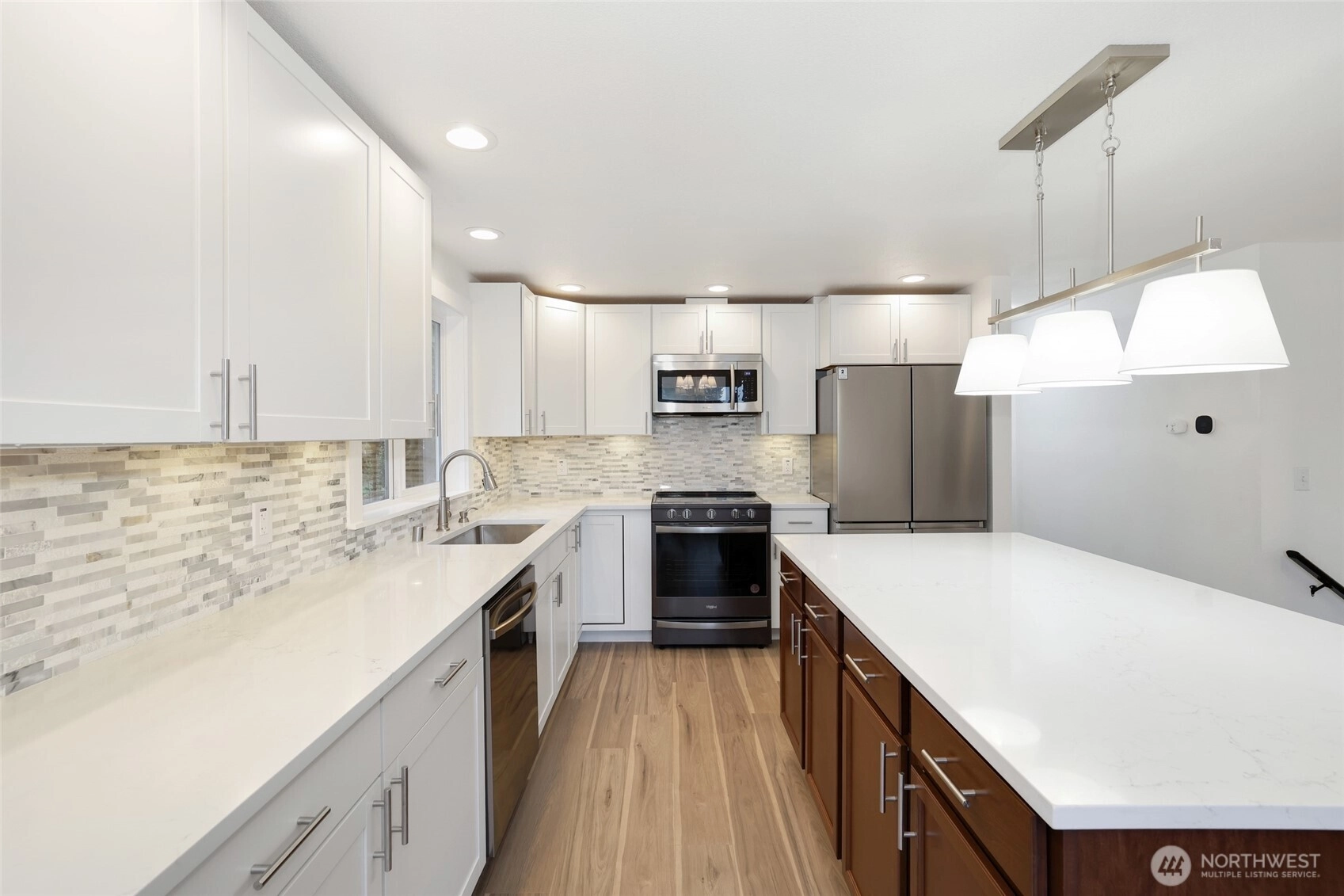 Tucked away on a peaceful cul-de-sac, this fully remodeled home is ready for its next owner. With easy access to I-5, shopping, and all that Olympia has to offer, it features 3 bedrooms plus a bonus room ideal for a home office or additional bedroom. The beautifully updated kitchen boasts white shaker cabinets, quartz countertops, and stainless steel appliances. Upstairs, you'll find two spacious bedrooms, a full bathroom, and a versatile flex room. The lower level includes a large primary suite with an attached bath, a utility room, and extra storage. Enjoy outdoor entertaining in the large fenced yard with a deck and covered area. Additional updates include a new roof and electrical panel.
