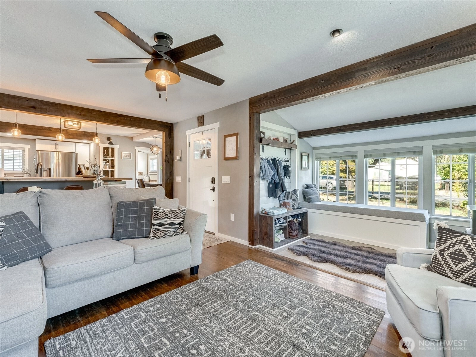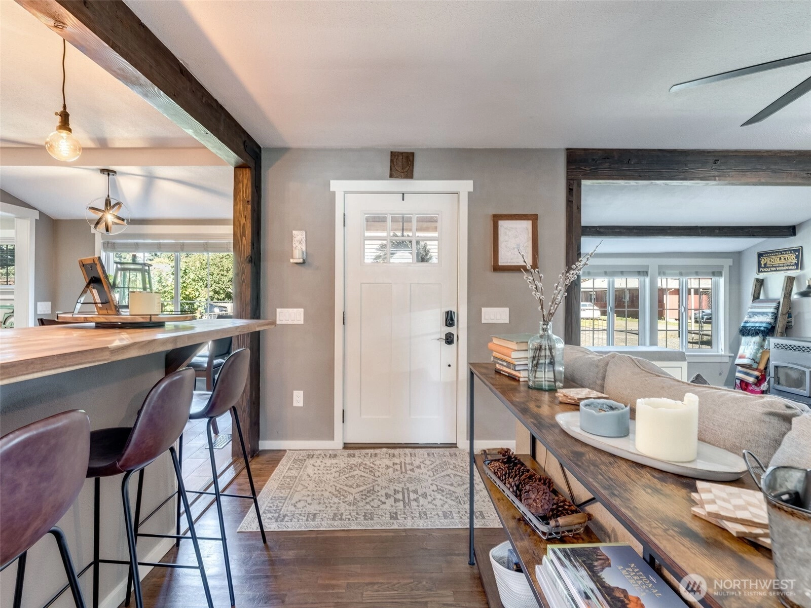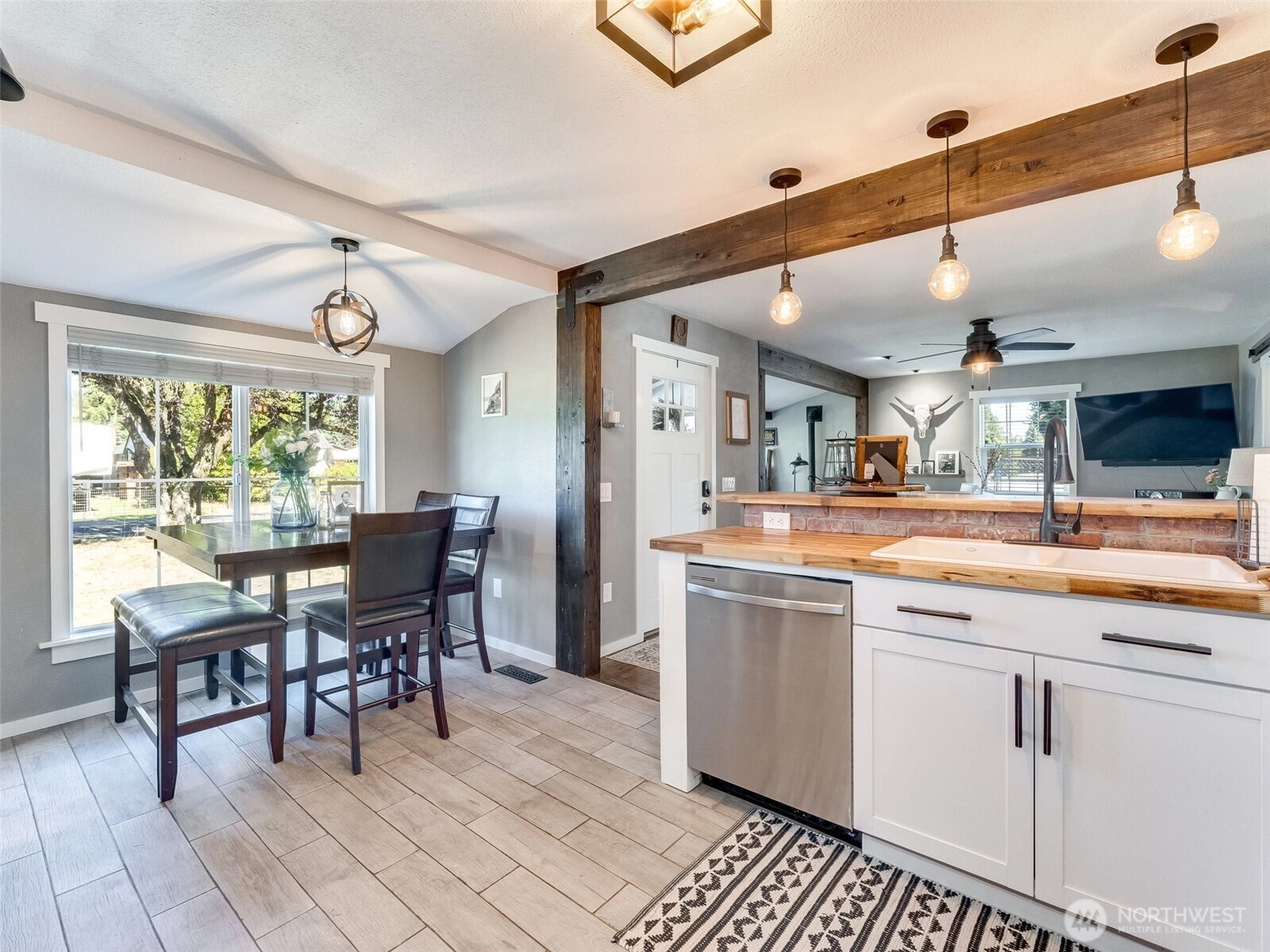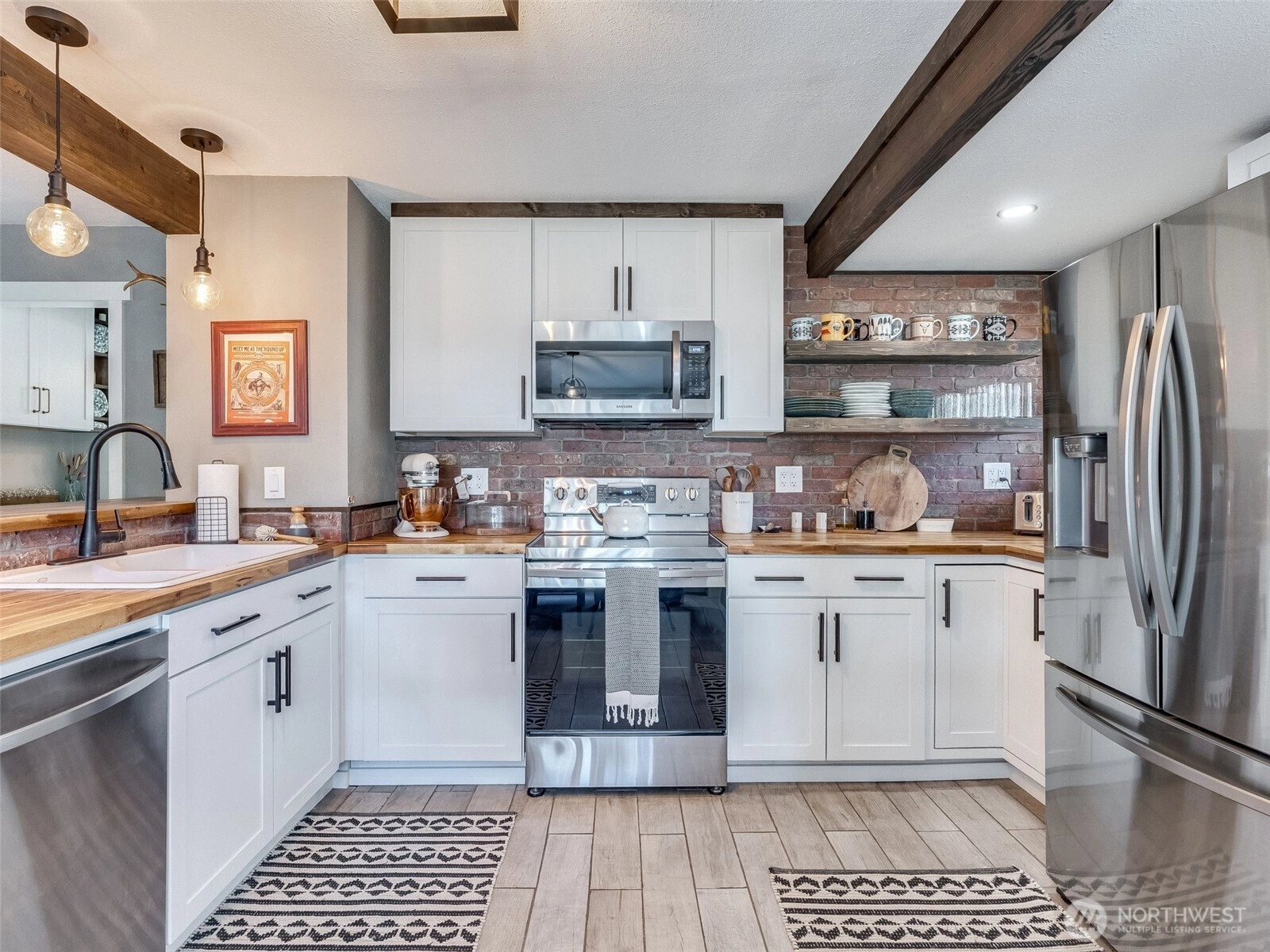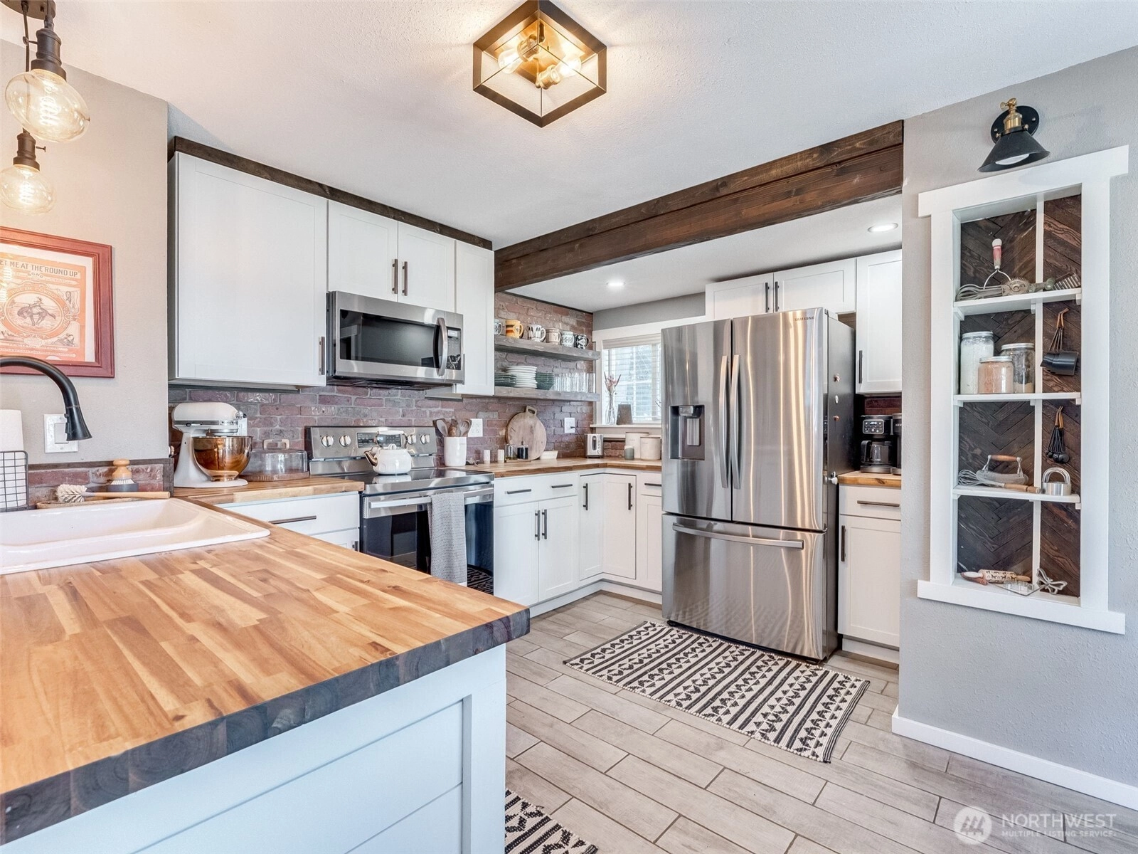 This beautiful 2-bedroom, 1-bath home is a true labor of love. Step inside to find refinished hardwood floors, a brand-new kitchen with butcher block counters and stainless steel appliances, fully renovated bathroom, and charming rustic touches throughout. Exposed beams, brick accents, and a cozy pellet stove add to the charm and inviting feel. Nearly every element of this home has been updated — including a new roof, solar panels, new wall heaters and an updated electrical panel — blending efficiency with timeless style.Outside, enjoy the cozy firepit, spacious backyard, garden area and large detached garage for extra storage or project space. Driveways on both sides of the home provides ample space for RV, boat or extra vehicle parking.
