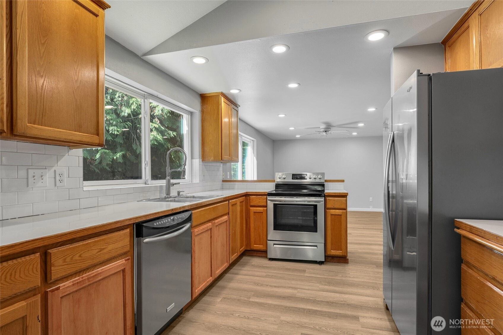 Welcome to this well-maintained Bonney Lake 2-story home on a large corner lot. On the main level you’ll enjoy the bright living & dining rooms with vaulted ceilings, kitchen & family room with backyard deck access, perfect for indoor/outdoor entertaining. Half bath & laundry in the mud room connecting to the garage entry. Upstairs, you’ll find the primary suite with private bath, two additional bedrooms & hall bath. Enjoy the large, fenced back yard with mature landscaping, backing to a greenbelt for added privacy. The two-car garage & extended driveway offers plenty of space for all your toys. Close to Bonney Lake amenities, your private retreat awaits!