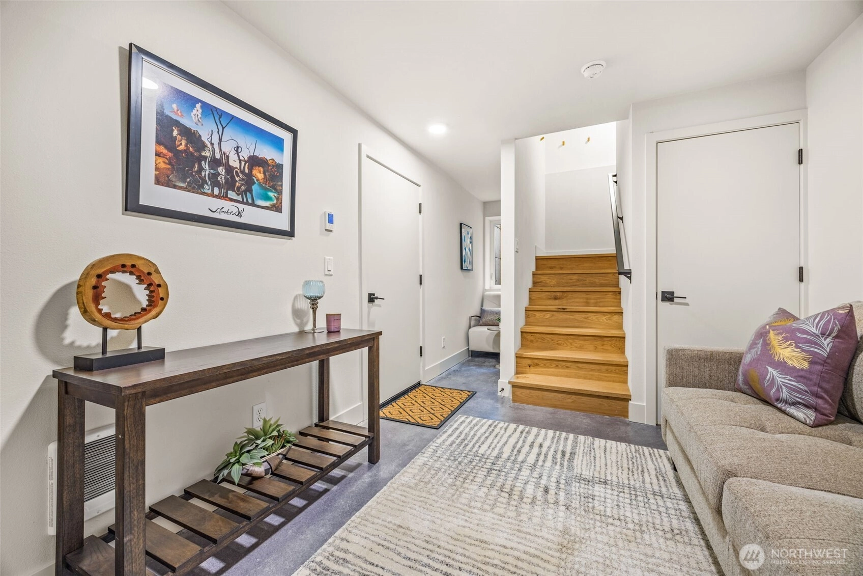 Your favorite urban retreat awaits! Exceptional modern residence in the heart of Greenwood built in 2022 with a striking blend of refined finishes & sophisticated design throughout.The gourmet kitchen features quartz countertops,modern cabinetry & high-end ss applcs opening to a light-filled liv rm w/expansive windows & hdwd floors.Penthouse owner's suite & spa-like bath w/quartz counter,oversized sink,heated marble floors & tile WI shower.2nd bd w/huge WI closet & elegant bath featuring quartz counters,heated marble floors & tub w/tile surround.Versatile lower level w/ ¾ bath—ideal for bonus or guest space.Private deck & 1 car garage wired for EV charging.Steps to Greenwood park.Near Green Lake,dining,parks,transit & Dntn Seattle.