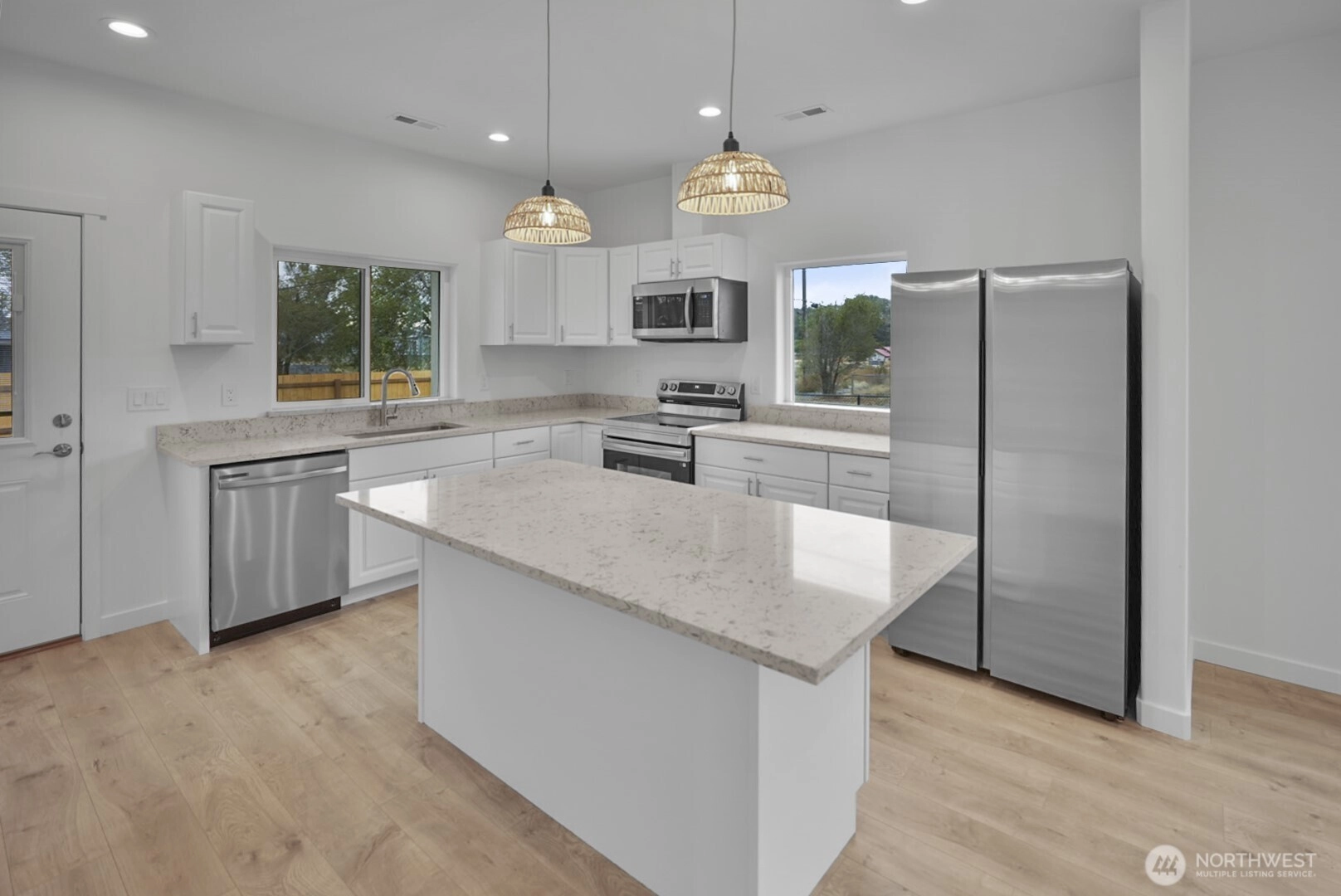 $10,000 seller credit!! One of a kind, new construction 3bd +office, 2bth home just minutes to the lake. This home offers 1450 sqft. of open concept living space. Quality finishes throughout including laminate flooring and carpets in the bedrooms, quartz countertops throughout, stainless steel appliances and modern cabinetry. Spacious primary suite with large walk-in closet and en-suite bath. Enjoy outdoor living with a landscaped yard and a large 8x15' patio! Attached finished 2 car garage and covered entry. Extra parking on side of home. Conveniently located just minutes from the lake, eateries and grocery. Burned manufactured home next door will be removed soon.