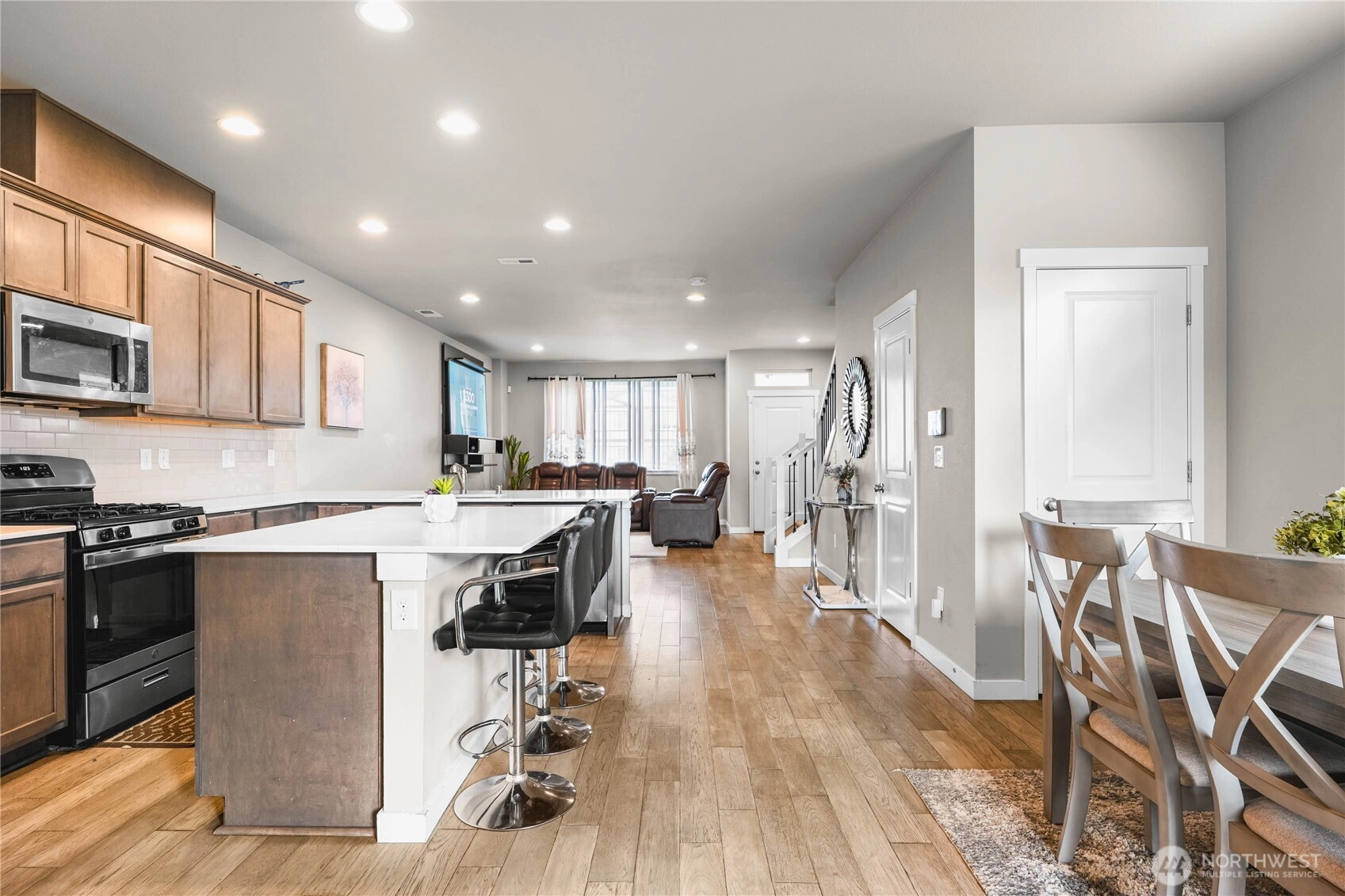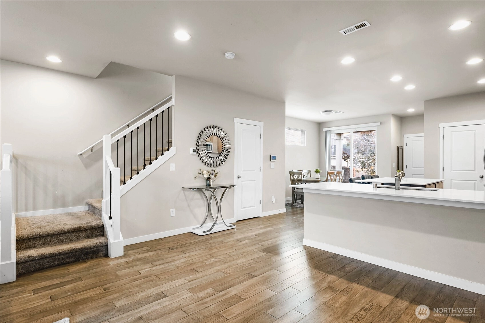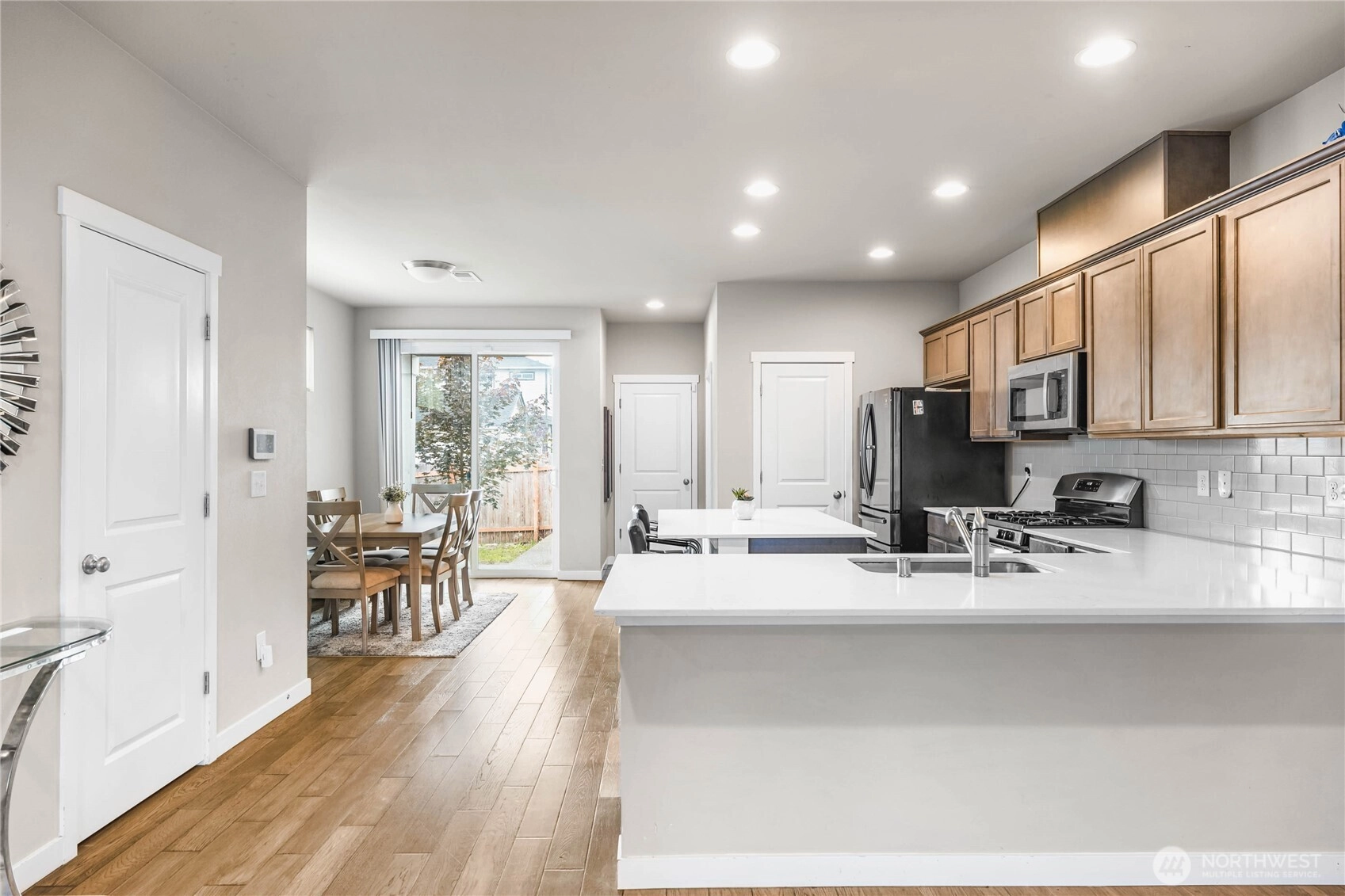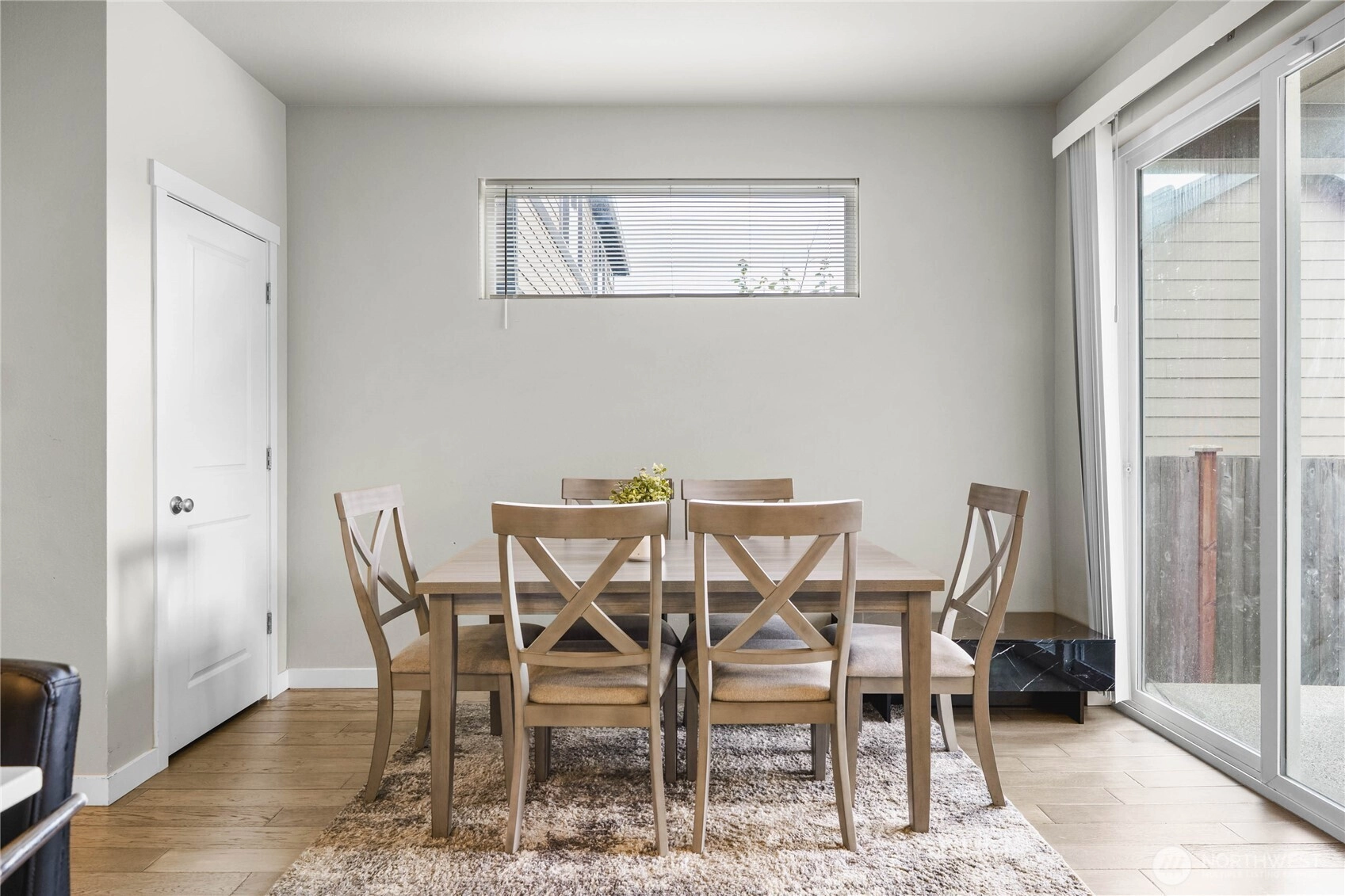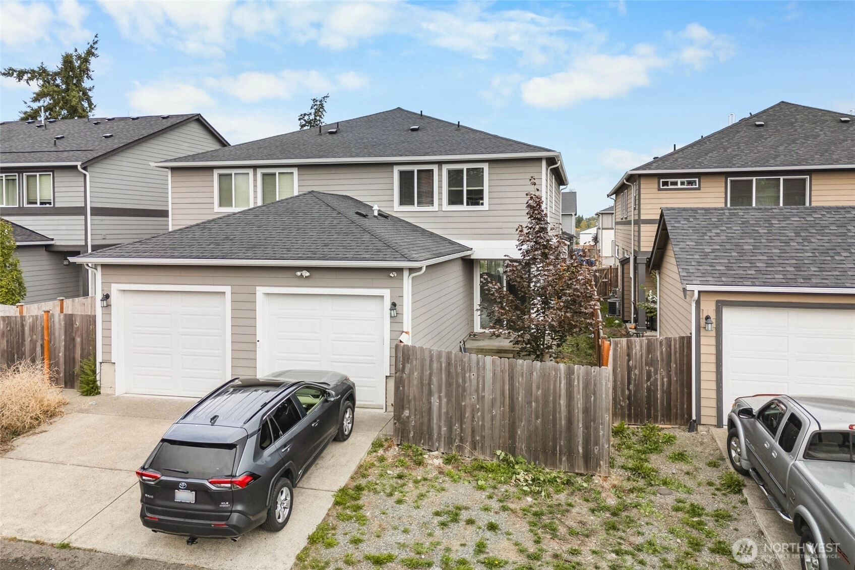 Beautifully maintained with engineered hardwoods and curated finishes. The open kitchen features quartz counters, wood cabinets, stainless appliances, and a dining bar. Dining area opens to the patio with fully fenced side yard. Upstairs you will find the primary suite with private bath and two more spacious bedrooms. Utility room also conveniently located upstairs. No HOA!