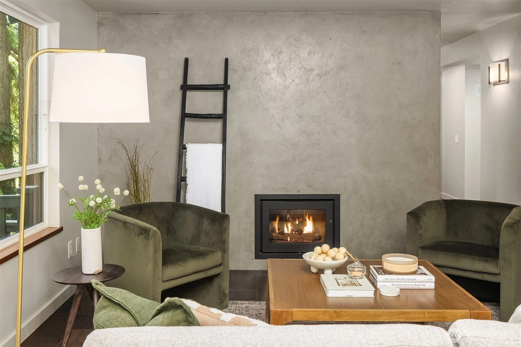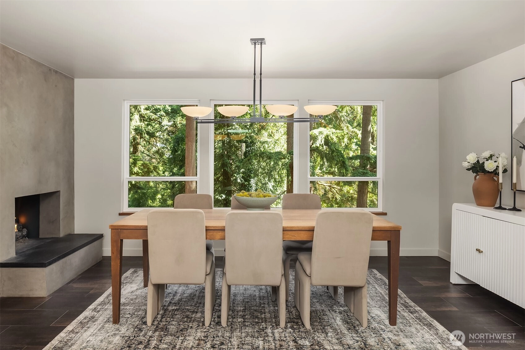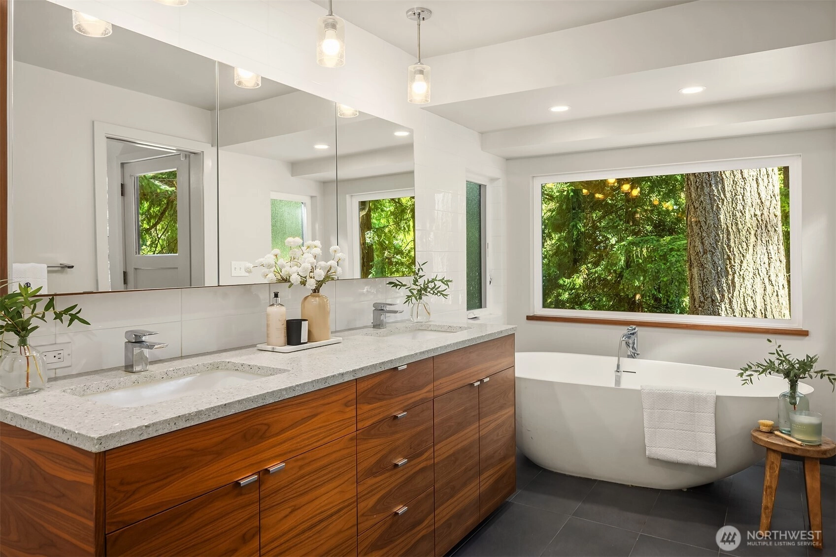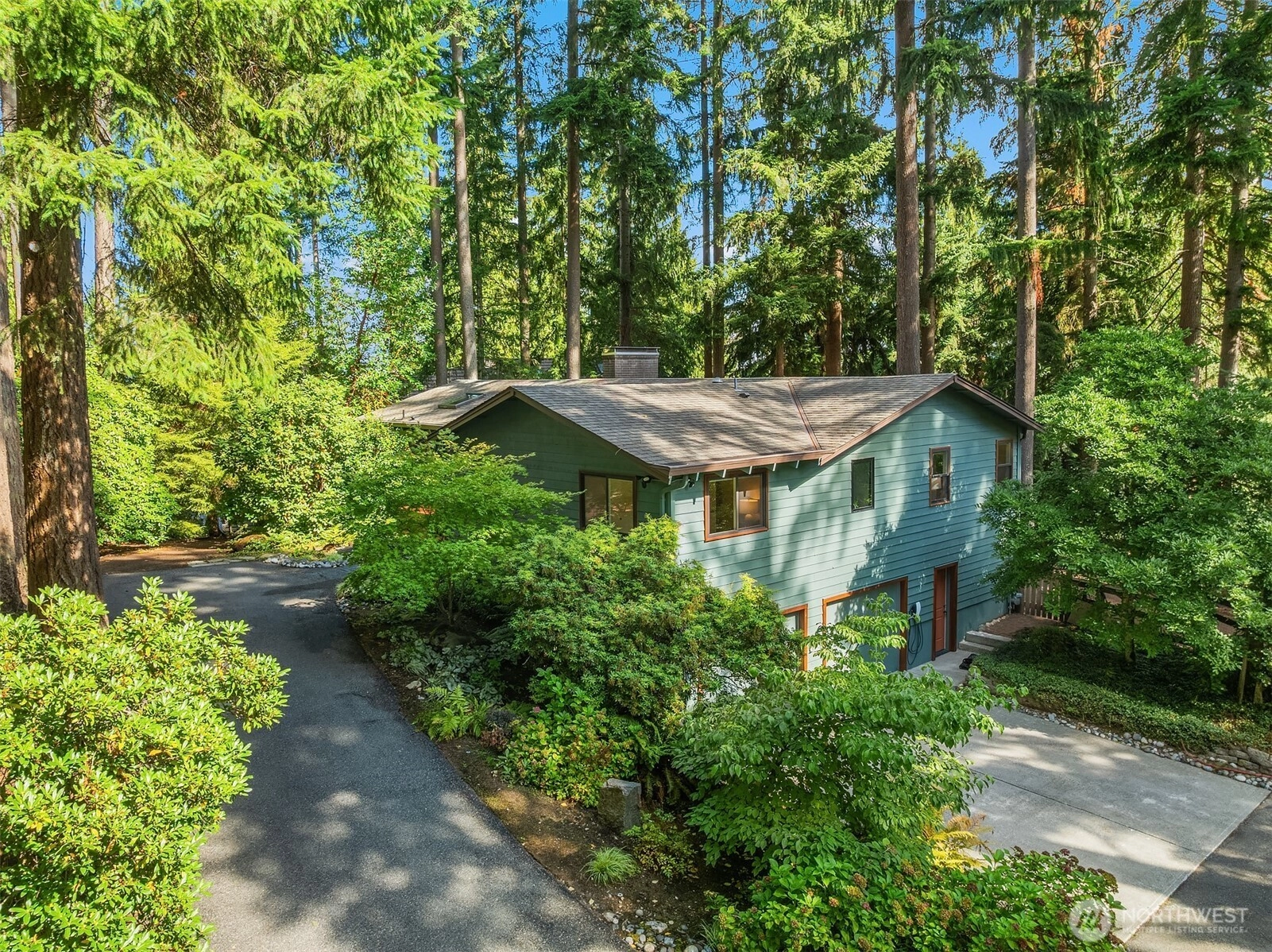 MUST SEE IN PERSON! This PNW retreat resides on a wooded acre right on the cusp of Bellevue. Its architecture evokes a distinct Mid-Century feel with high end finishes; real walnut veneer Henrybuilt cabinetry, 3 fireplaces encased in statement concrete walls, clean lines and ample natural light. A chef's kitchen is at the heart of the main floor, with double ovens, prep sink, walk-in pantry and high end appliances. 3 bedrooms are on the main level, including a primary suite with 5-piece bath and radiant floors. The daylight basement includes a family room, office and a guest room with its own entrance, plus three quarter bathroom. 3 EV chargers, new Milgard windows and an automatic generator are some of the many upgrades!