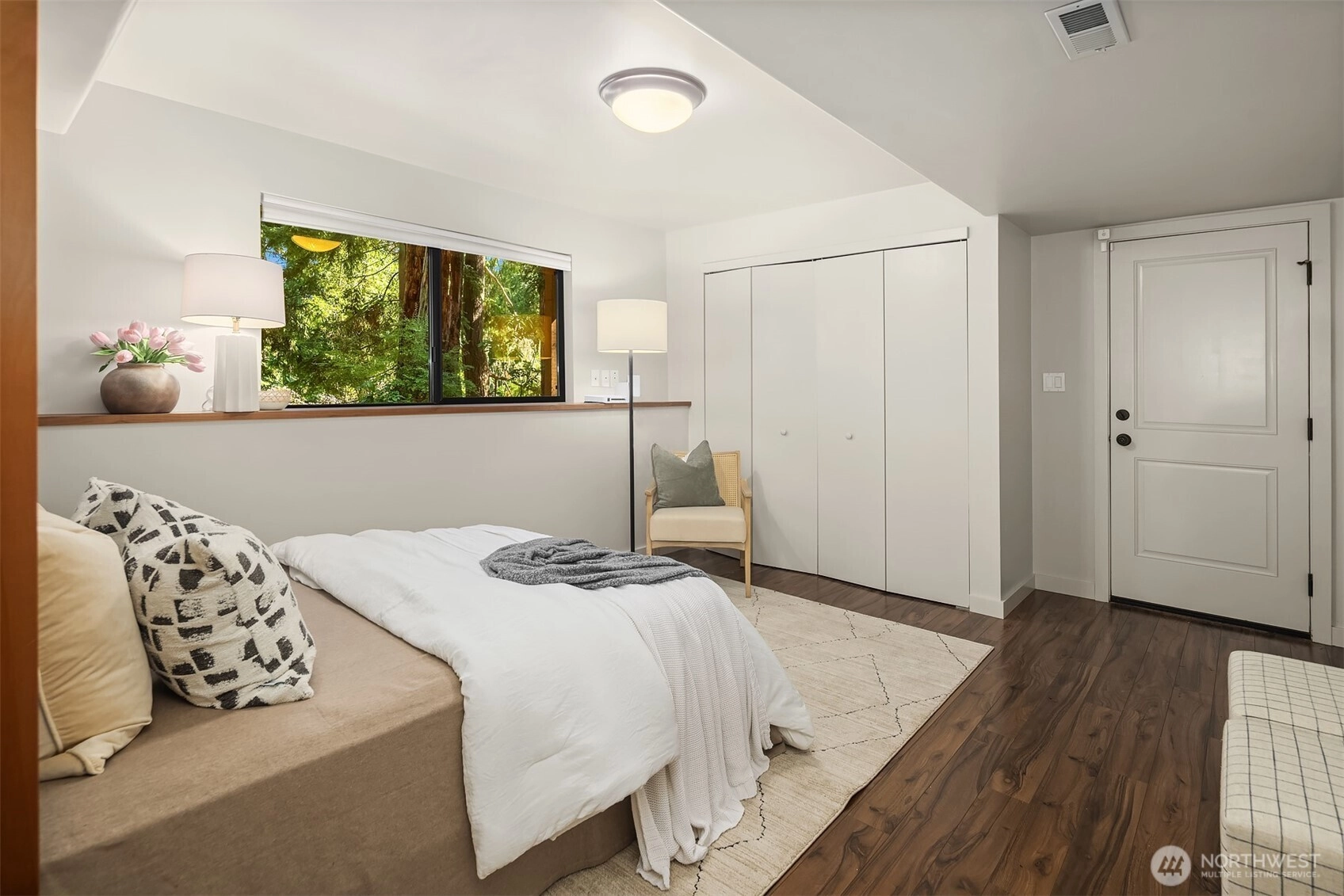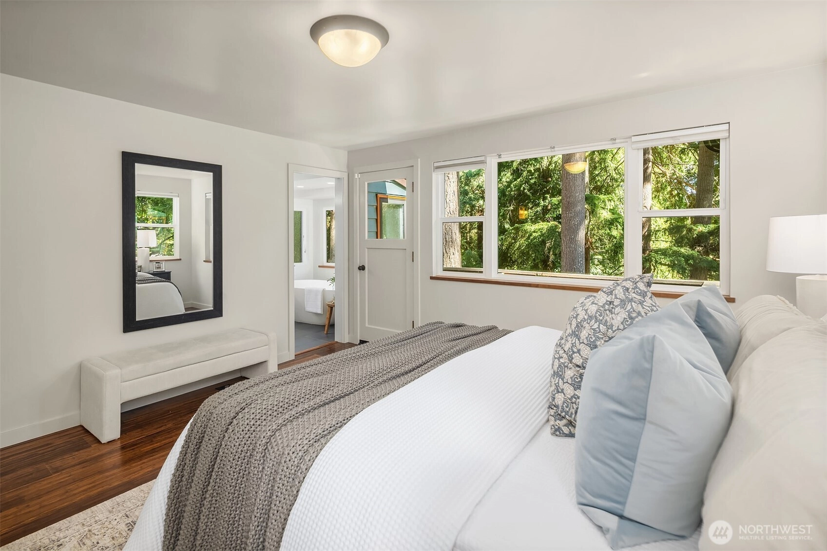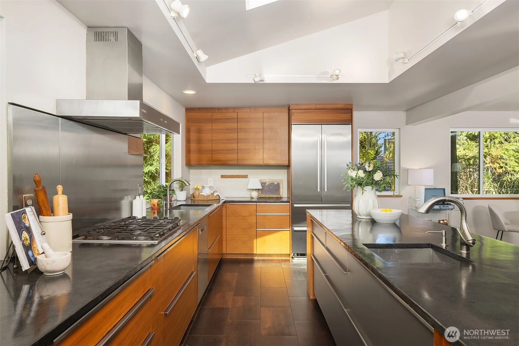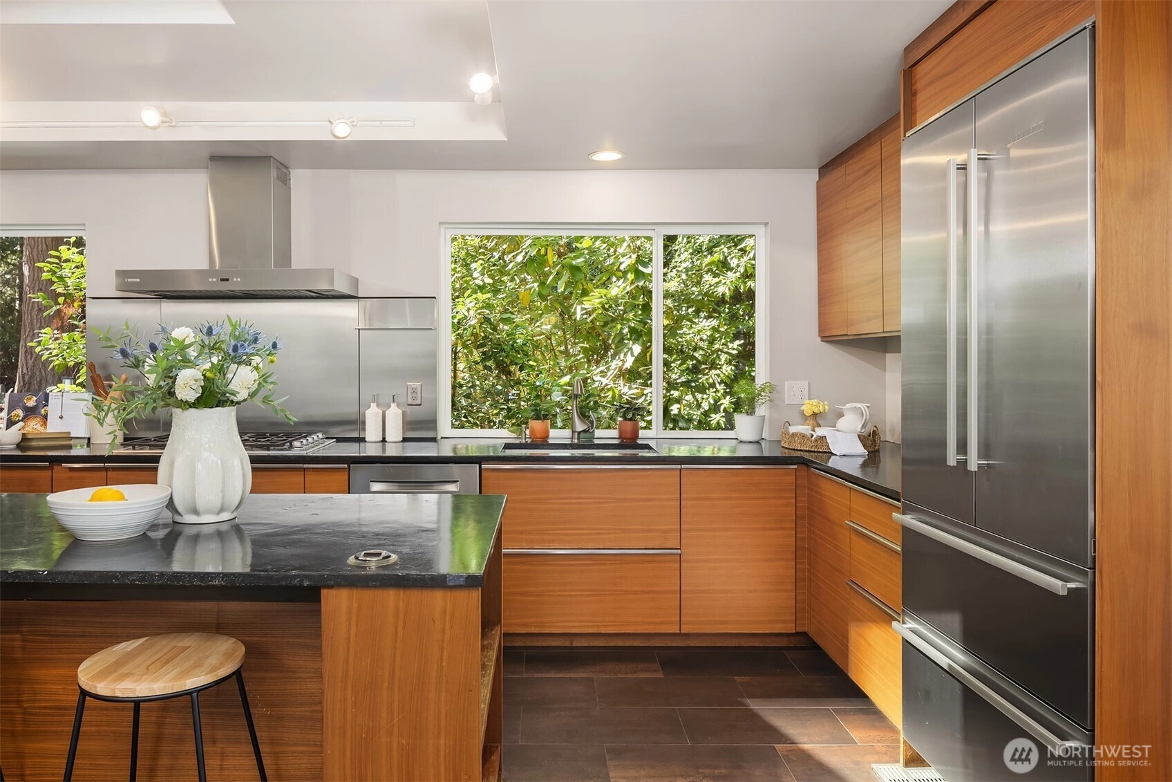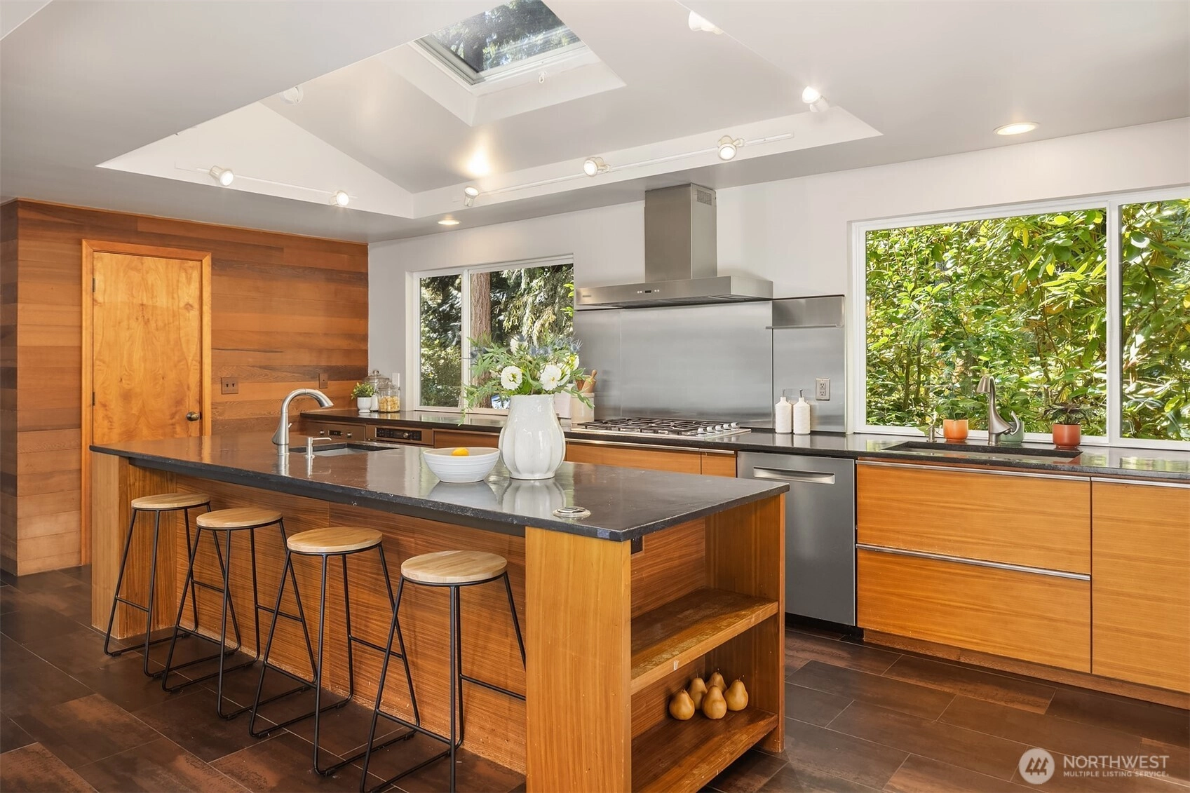 MUST SEE IN PERSON! This PNW retreat resides on a wooded acre right on the cusp of Bellevue. Its architecture evokes a distinct Mid-Century feel with high end finishes; real walnut veneer Henrybuilt cabinetry, 3 fireplaces encased in statement concrete walls, clean lines and ample natural light. A chef's kitchen is at the heart of the main floor, with double ovens, prep sink, walk-in pantry and high end appliances. 3 bedrooms are on the main level, including a primary suite with 5-piece bath and radiant floors. The daylight basement includes a family room, office and a guest room with its own entrance, plus three quarter bathroom. 3 EV chargers, new Milgard windows and an automatic generator are some of the many upgrades!
