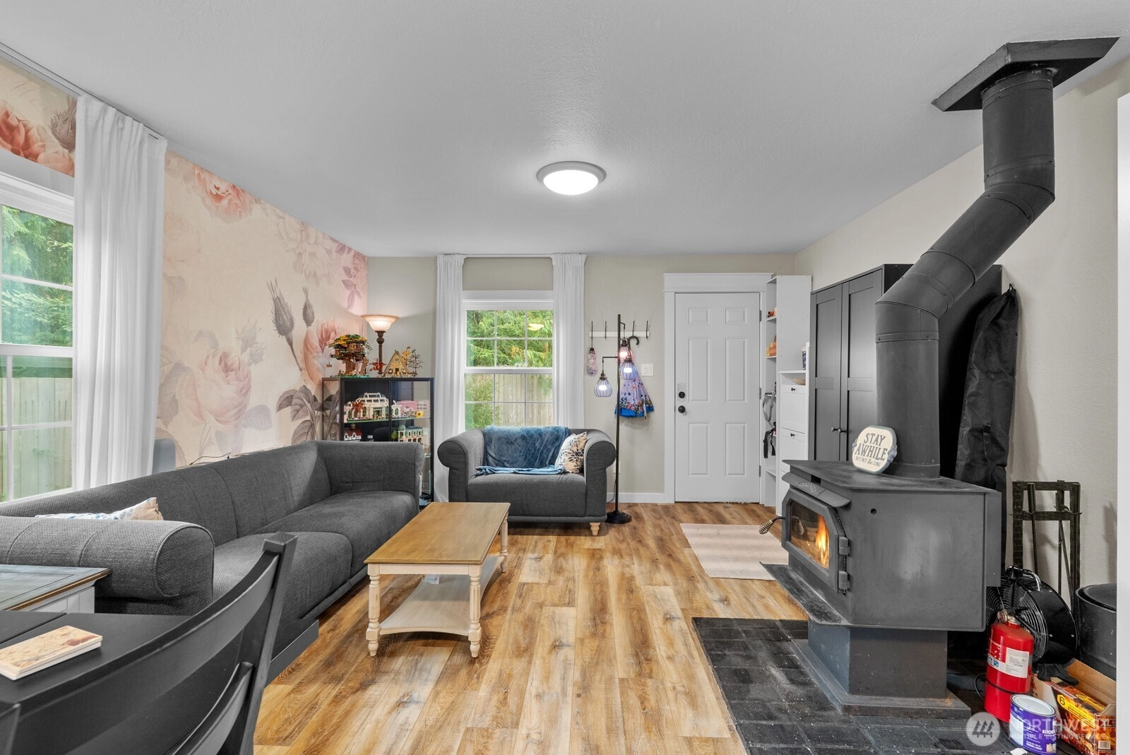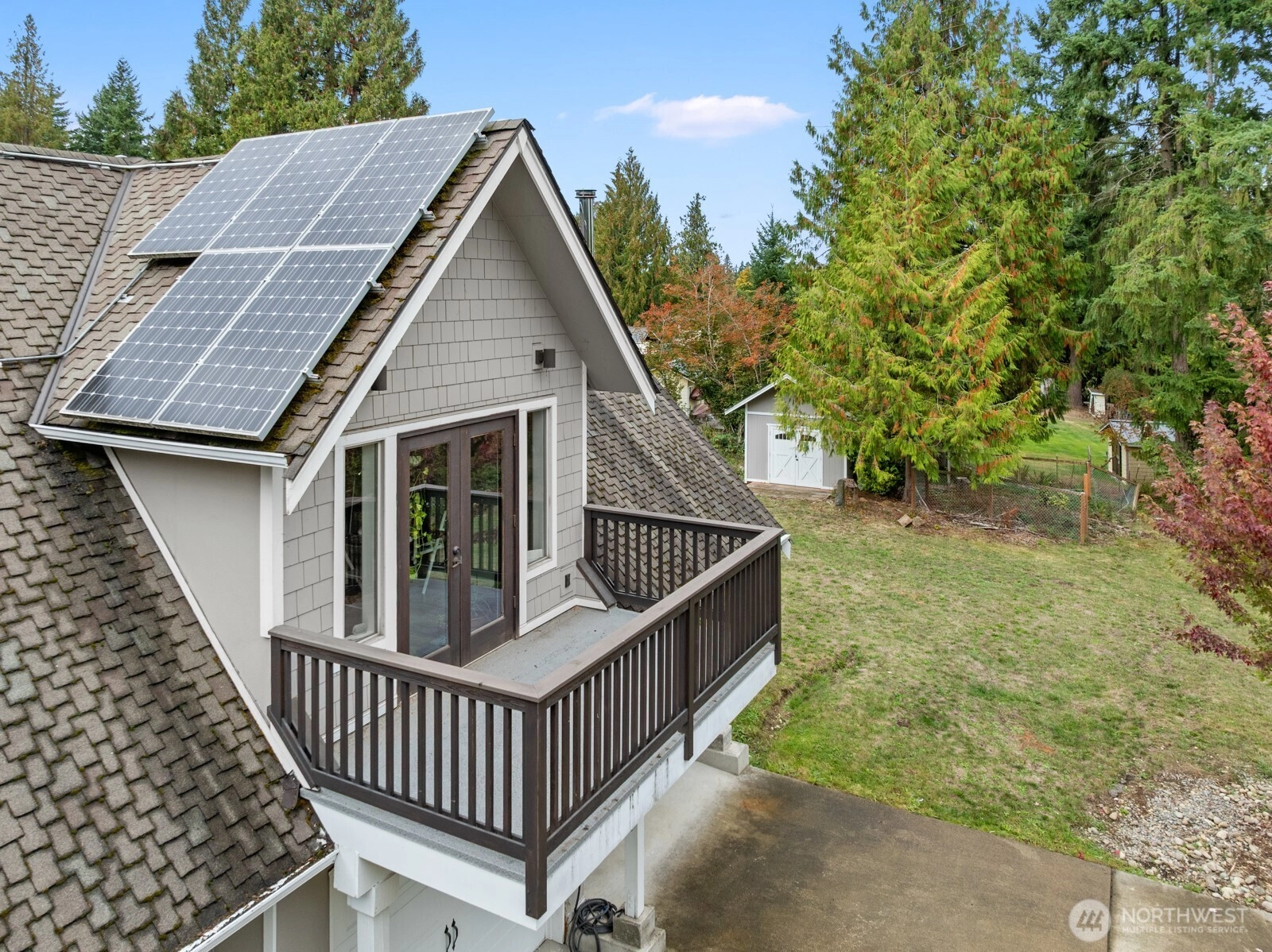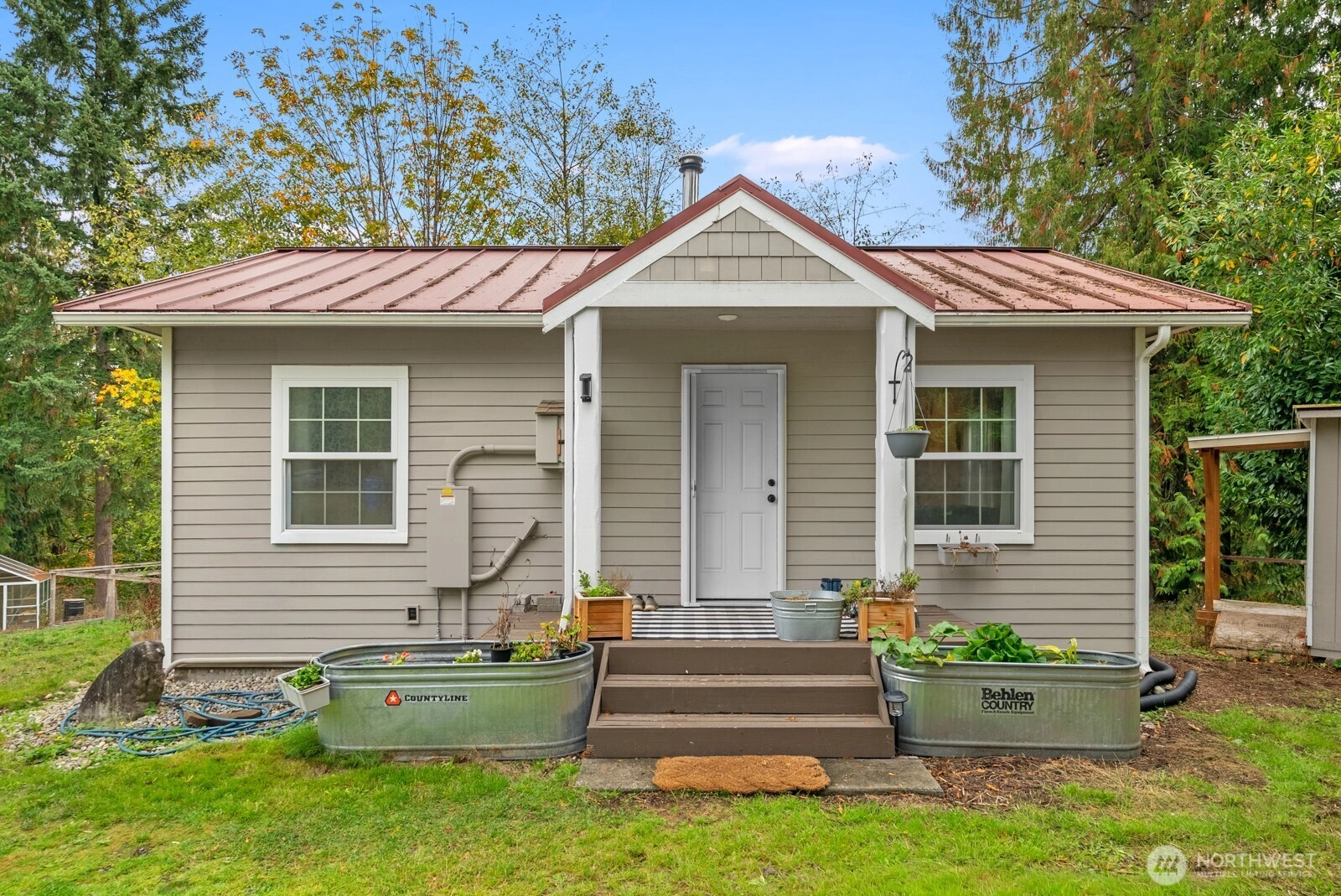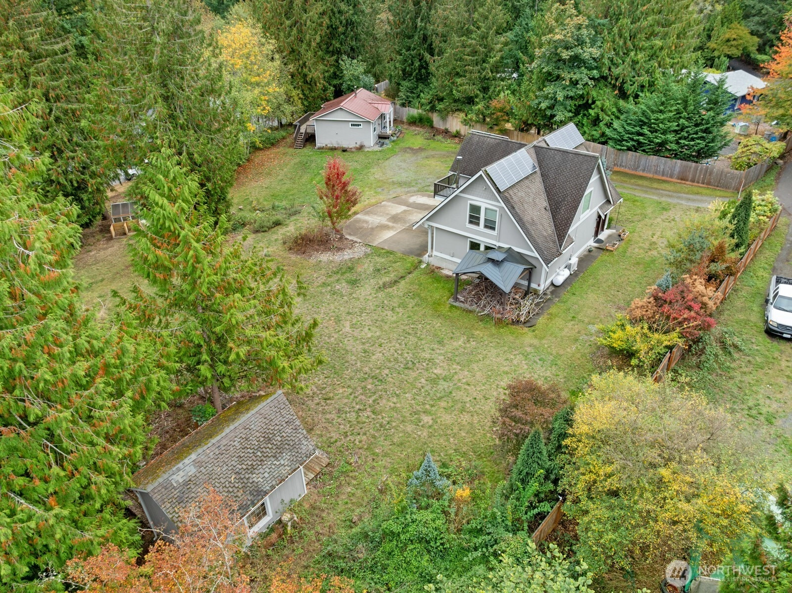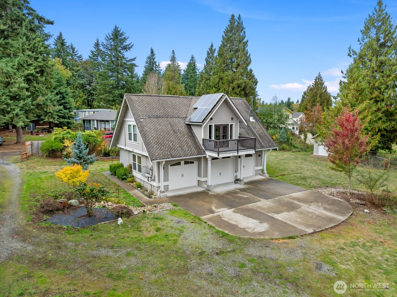 Two fully renovated homes on one acre near Lake Tapps. This 1400sqft, 2 bedroom with a loft, full bath, open kitchen w/eating space, living room with french doors open to the balcony, 50 year comp roof, 2 laundry hookups and primary suite is built over 1079sqft 3 car garage with half bath. 797 sqf DADU is a 1 bedroom, full bath, kitchen, dining area, living room, laundry hook-ups, metal roof and a deck. Property features solar panels, ductless AC, wood stoves, and tankless H20 heater. Gated entry, chicken coops, garden space, 2 outbuildings, gazebo with hot tub hookups, greenhouse, low maintenance landscaping, and dog run. Live in one and rent out the other or vacation rental would be a good investment for this property. Close to Lake Tapps